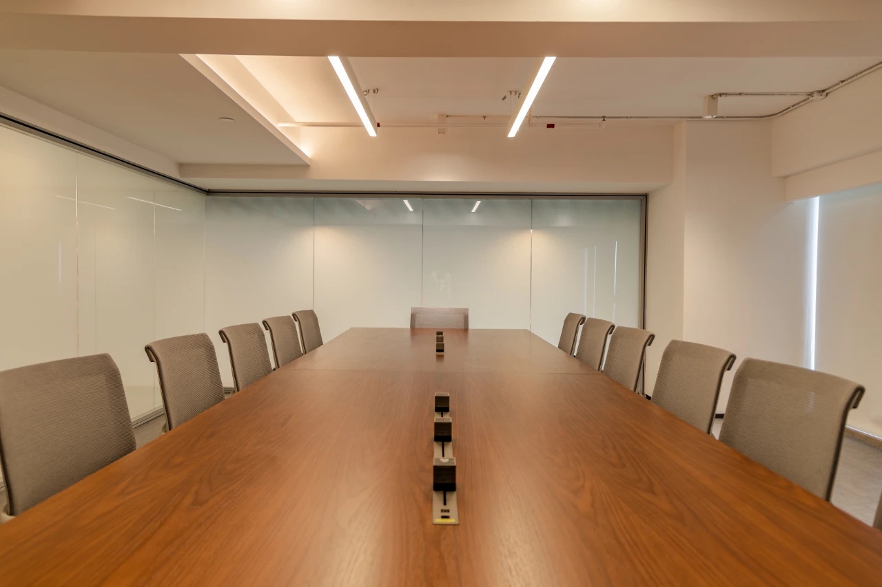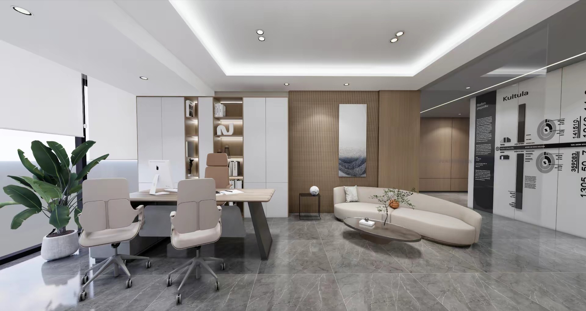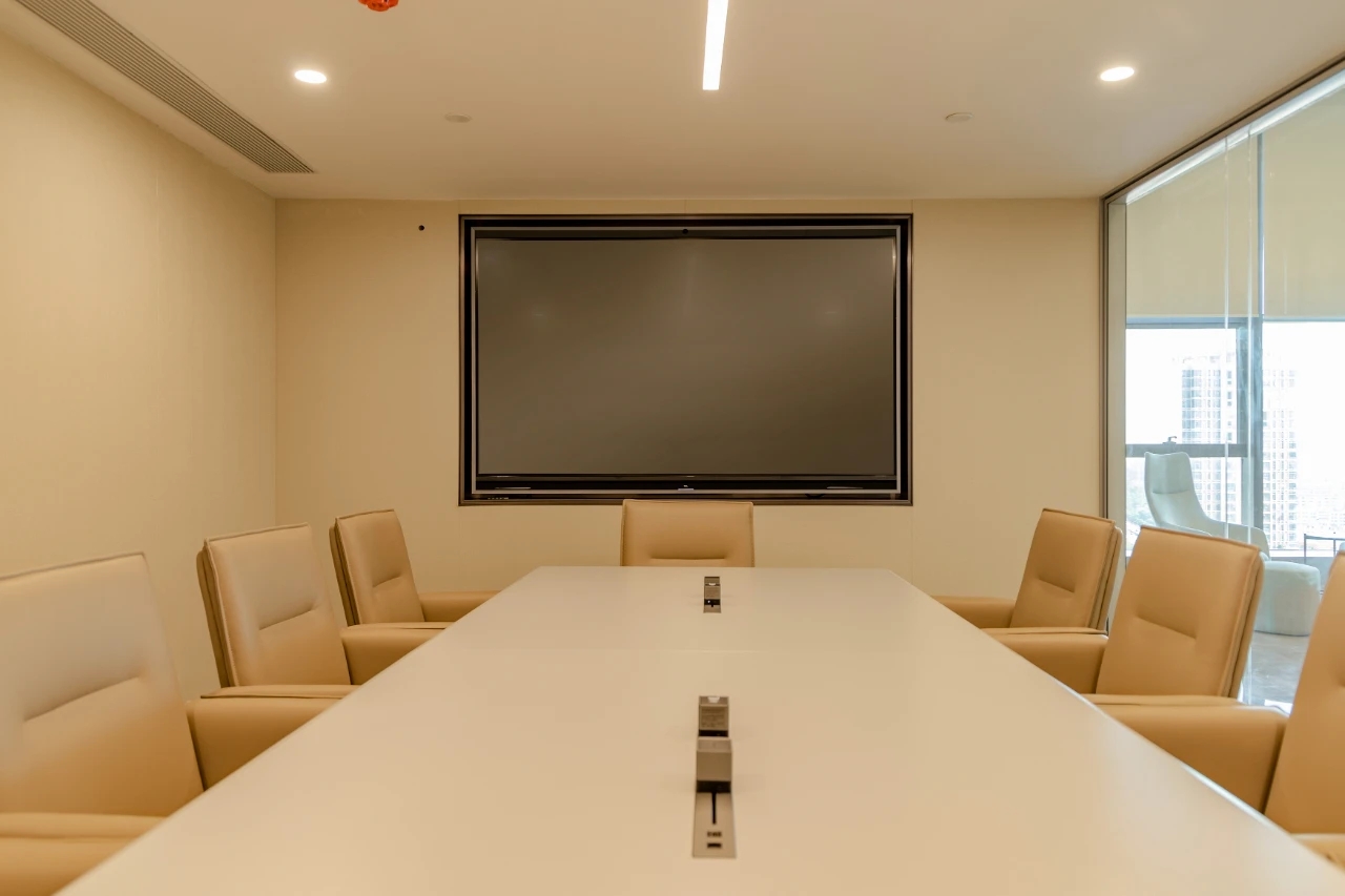 会议室沿用其深胡桃木色搭配属性,搭配黑色会议皮椅。公司会议是传达公司经营理念,集思广益解决问题,头脑风暴寻求创意的核心场所,更是商务洽谈的重要舞台。