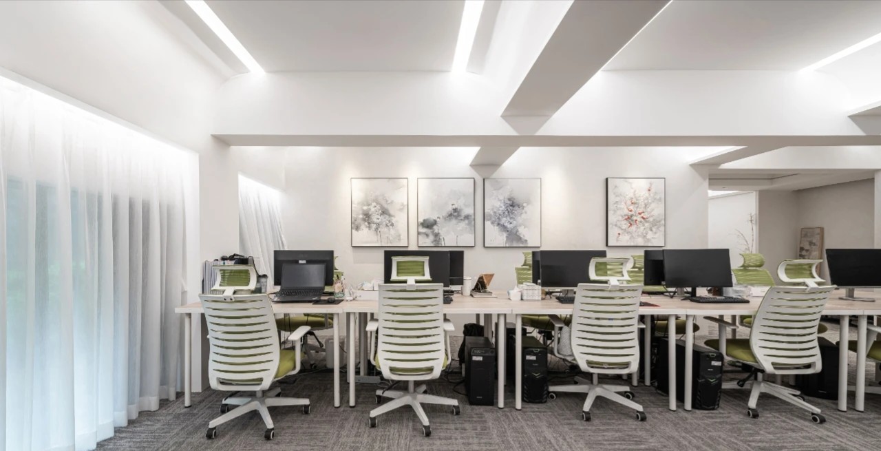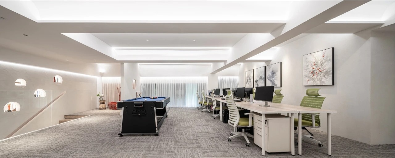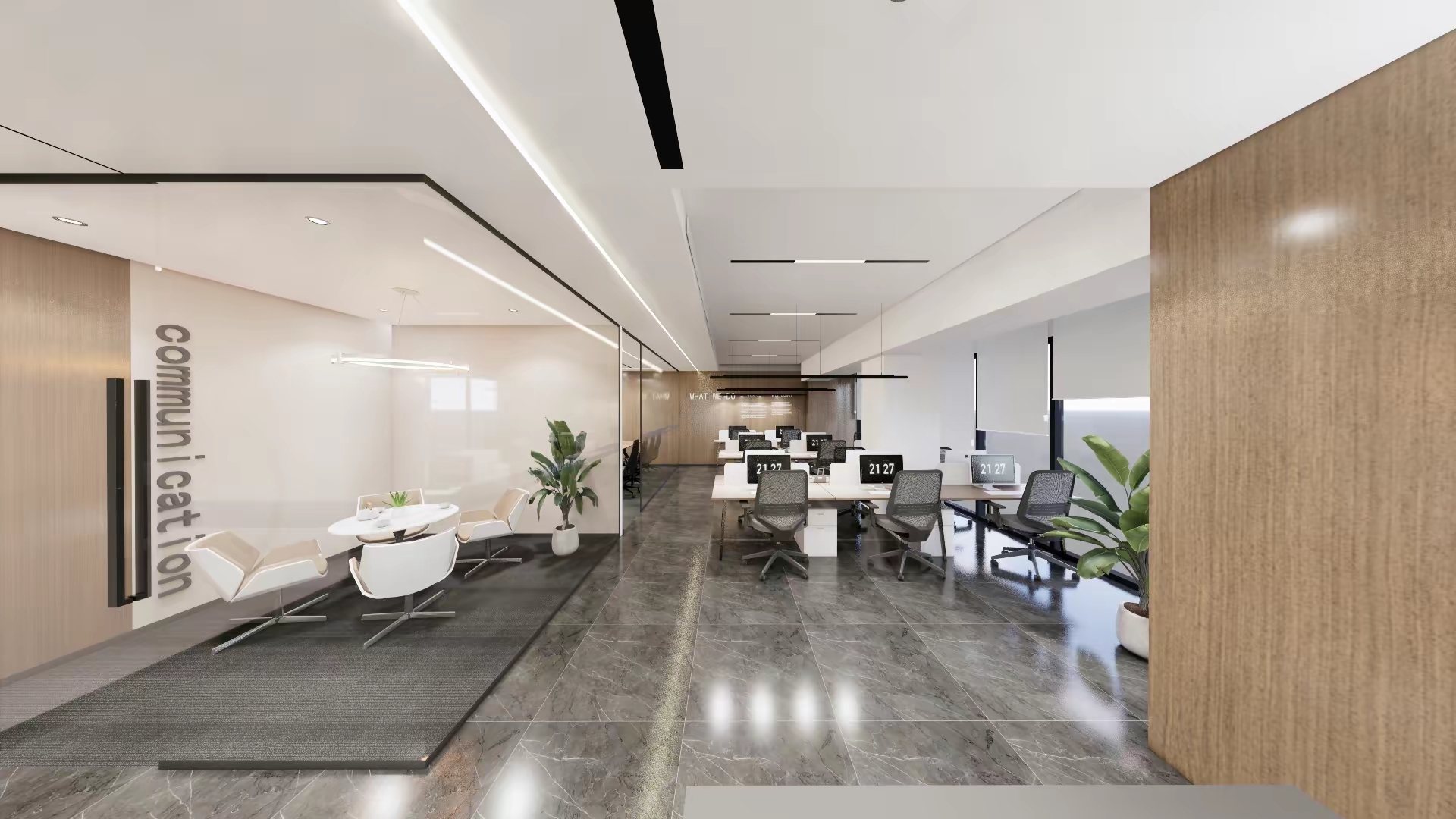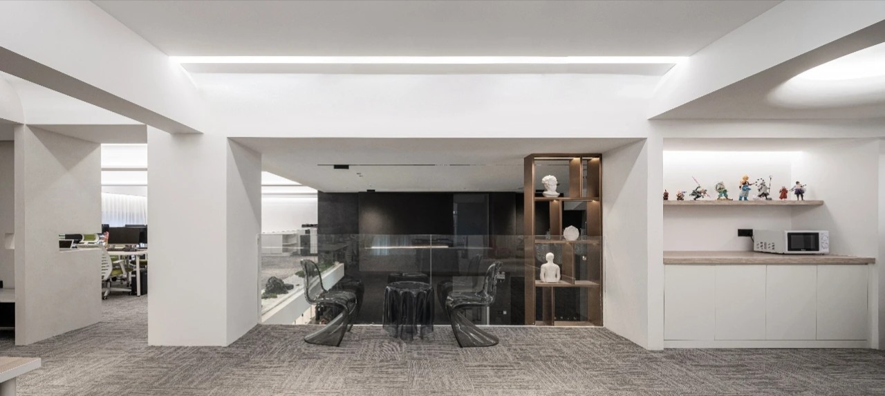 设计师通过对空间气质的分析,优先考虑将“直线”形态列为贯穿始末的特征元素,来强调办公空间的专业度,极简的直线元素表达着空间序列的美感。整个空间运用无主灯设计,摒弃传统的吊线灯,简约天花造型搭配室内定制家具,让空间变得大气、流畅。