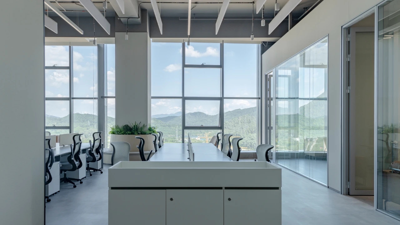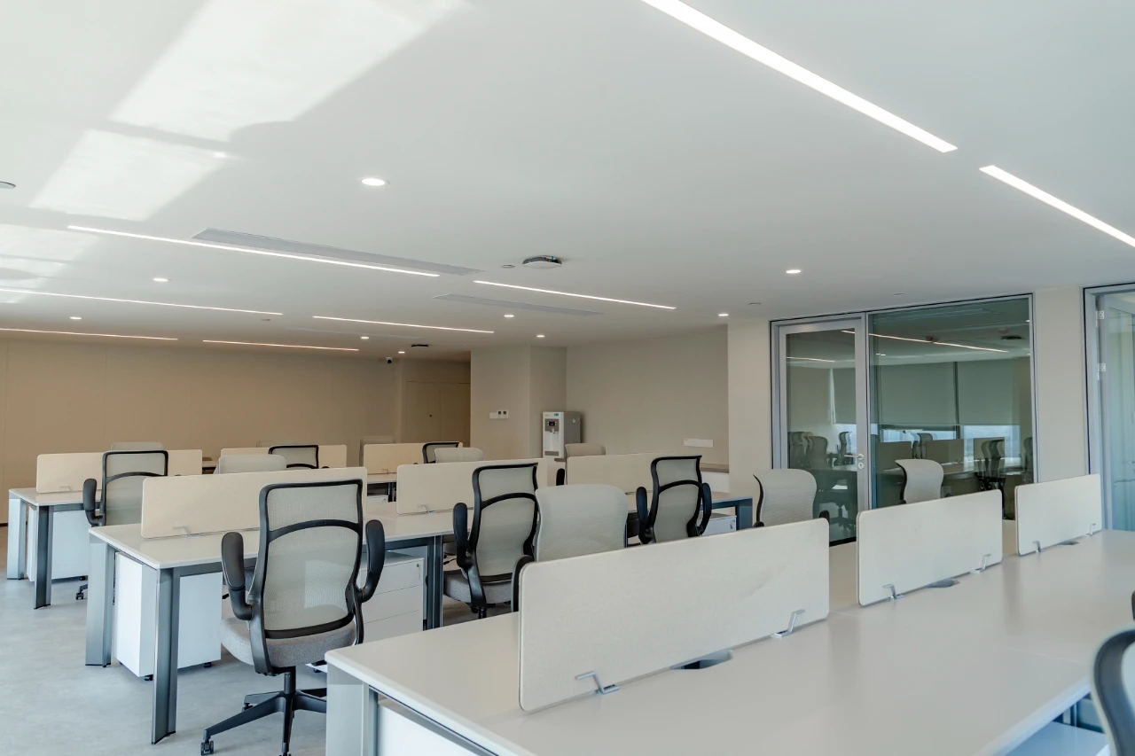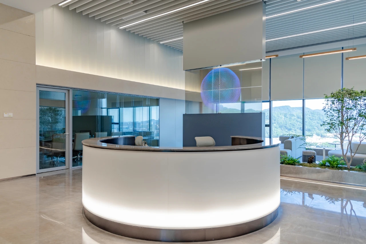设计师通过对空间气质的分析,优先考虑将“直线”形态列为贯穿始末的特征元素,来强调办公空间的专业度,极简的直线元素表达着空间序列的美感。整个空间运用无主灯设计,摒弃传统的吊线灯,简约天花造型搭配室内定制家具,让空间变得大气、流畅。