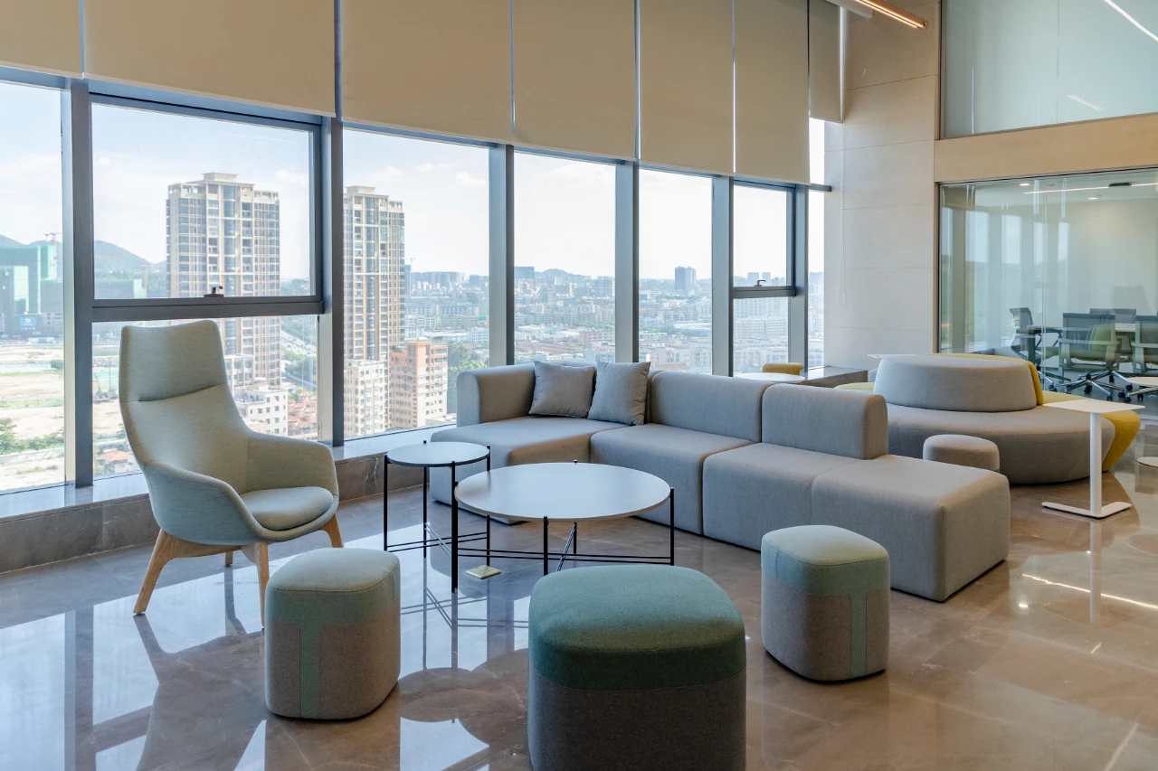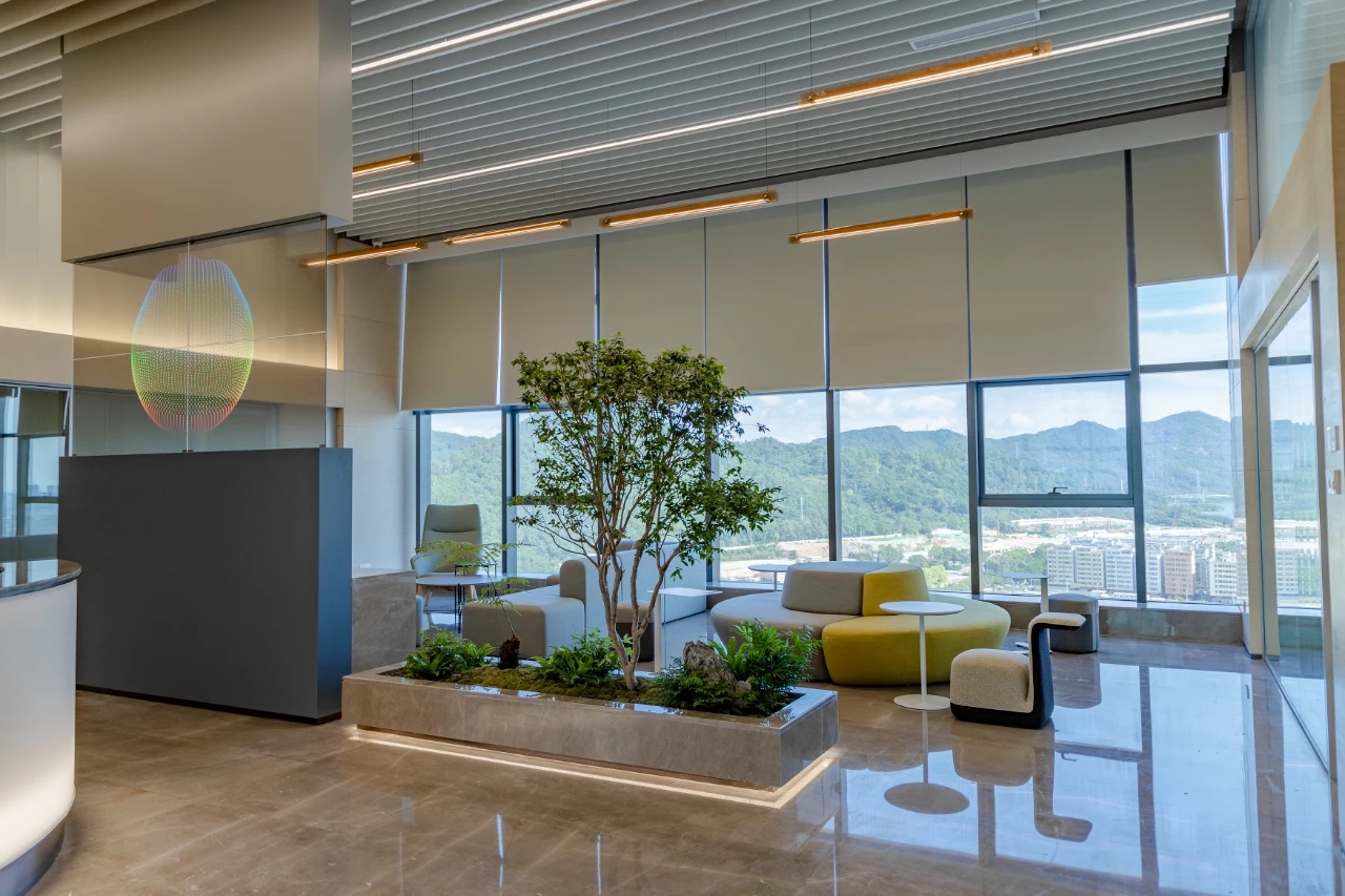 整体办公空间的搭配方案以打造“松弛感”办公环境为主旨,在前厅以明朗干净的设计打通开阔感。用盆景绿植分割出前厅的休闲区,右边设置阶梯式脑暴区,透露着现代和充满活力的态度。