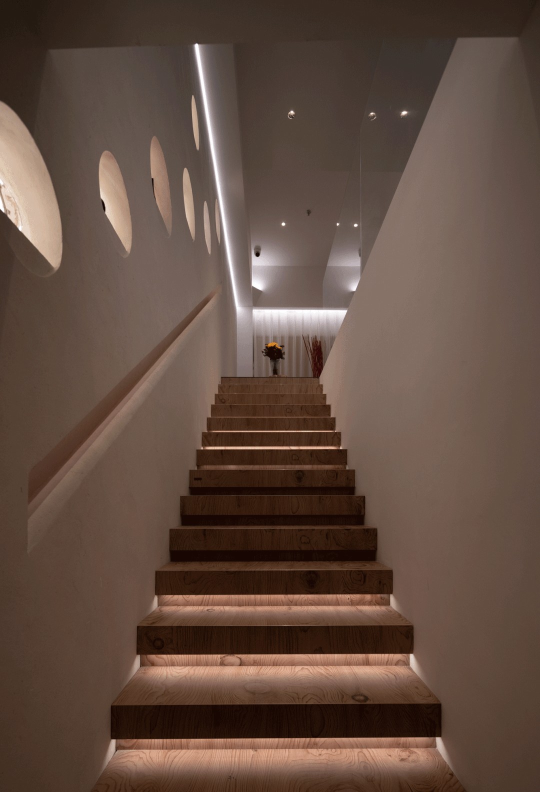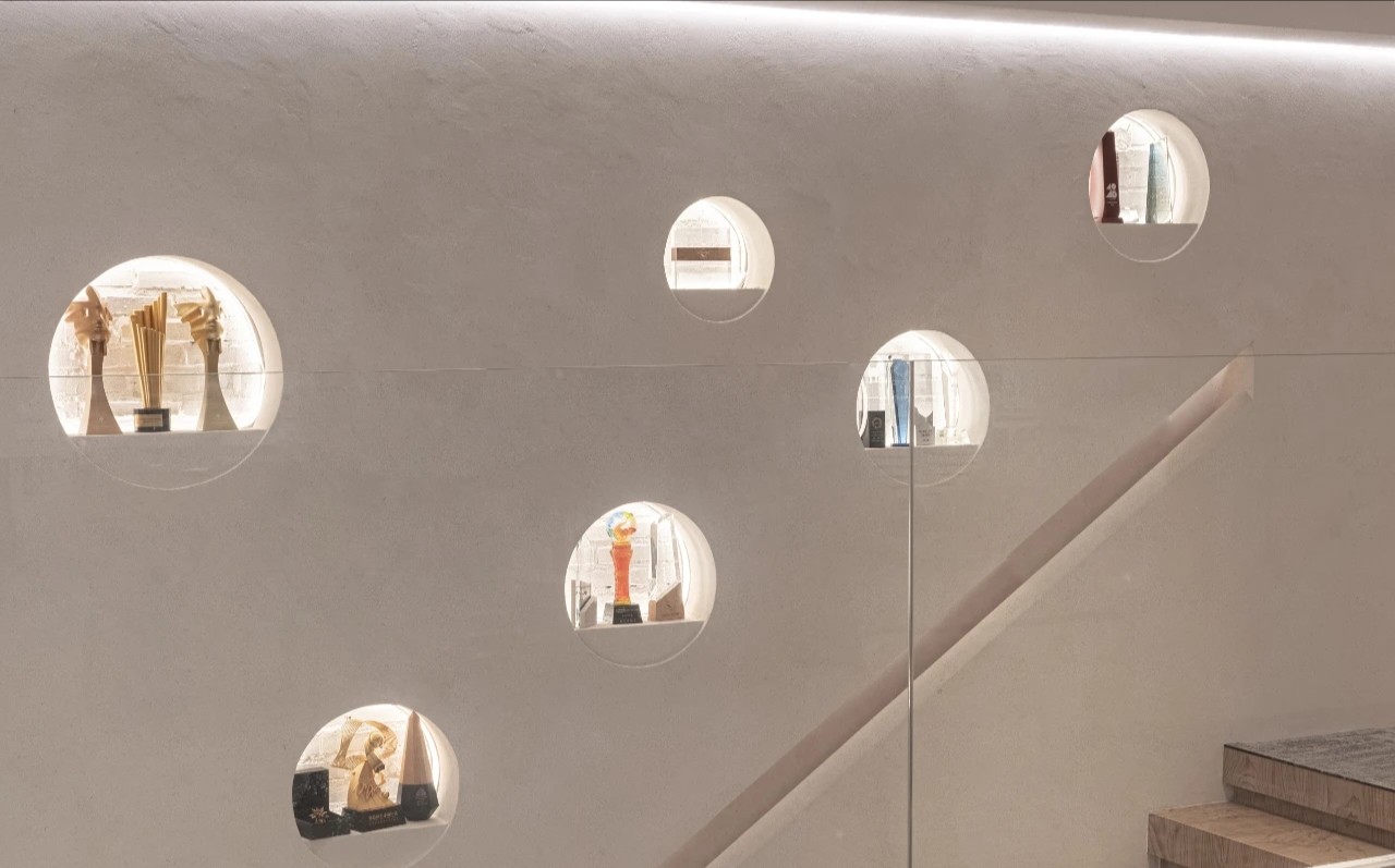 仿木纹砖台阶的步入式灯光让访客即可感受到设计的材质也让步入的仪式感墙面留白,大小不一的展示墙摆放着历年获得荣誉项目的奖项与业主赠予的认可奖杯