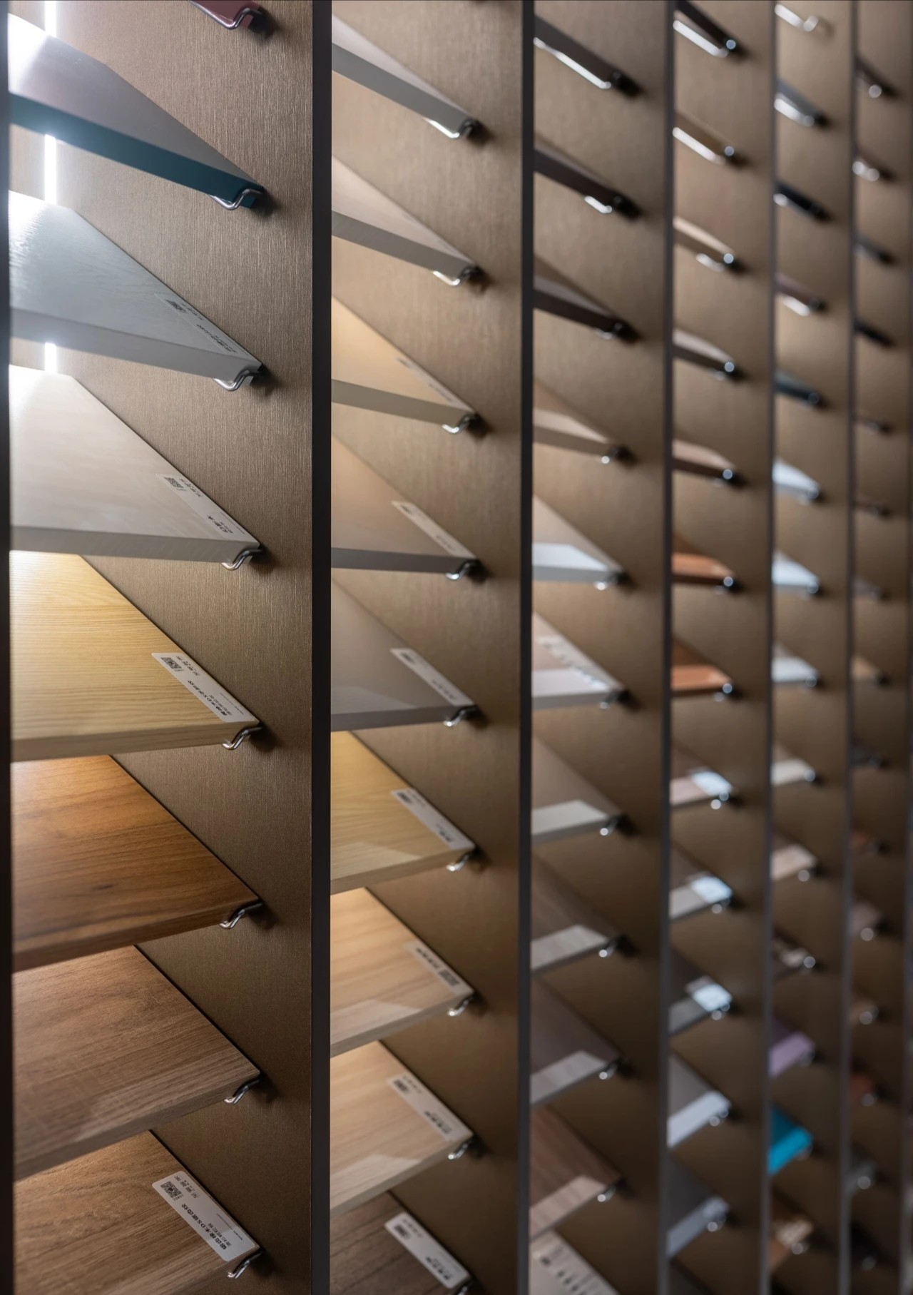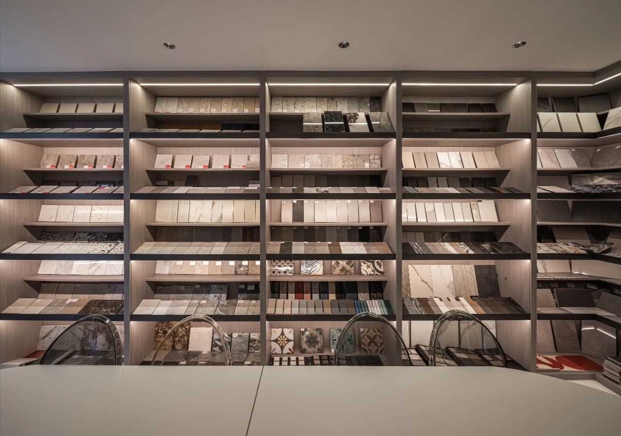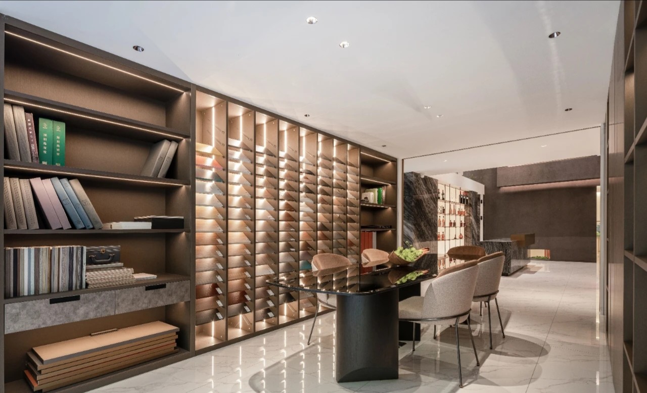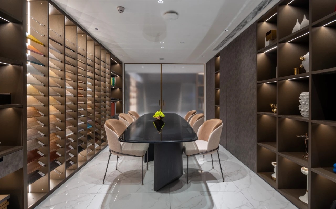 这不仅是一家设计公司,更是一家全屋定制展厅。形形色色的板材放置在板材厅,隐而不藏的灯光呈现出璀璨丰富的质感细节,以开放式的形式,与艺术对话。来访的客户可亲临感受到板材的材质与触感,真实感受到材质的纹理与细腻。