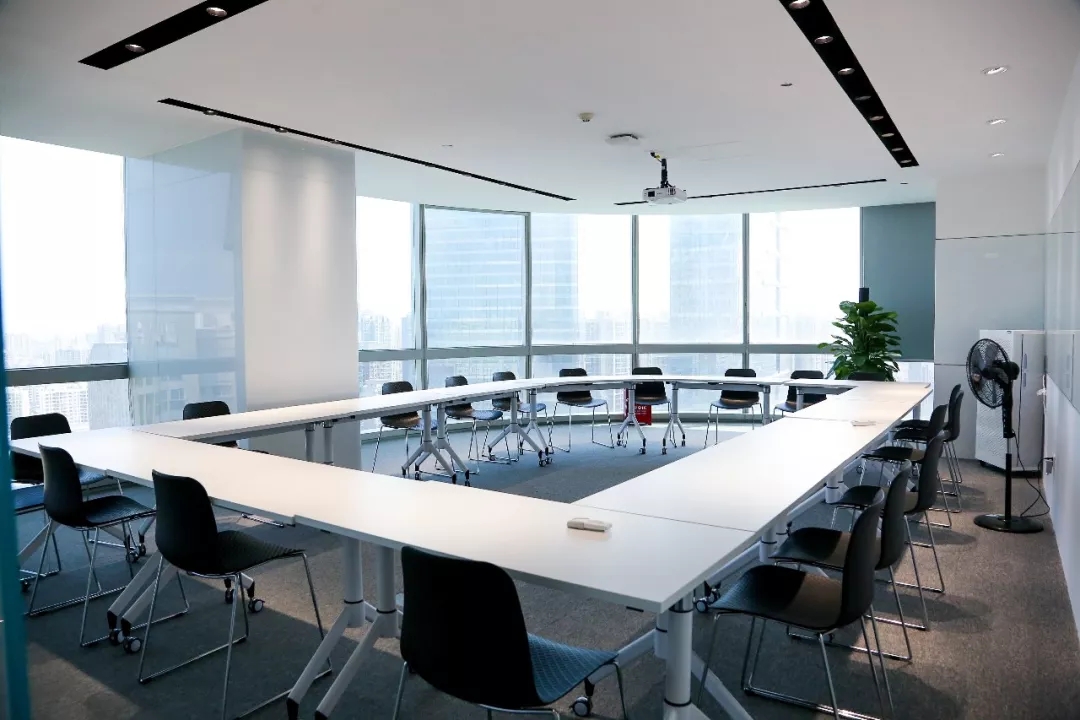 会议室采用高科技智能办公体系,可实现提前预约、视频会议等功能。顶面采用软膜灯光,光照均匀的同时模仿天光的自然效果,配合地面的海浪沙滩图案以及色调让整个会议室在显得大气的同时又别具一格。