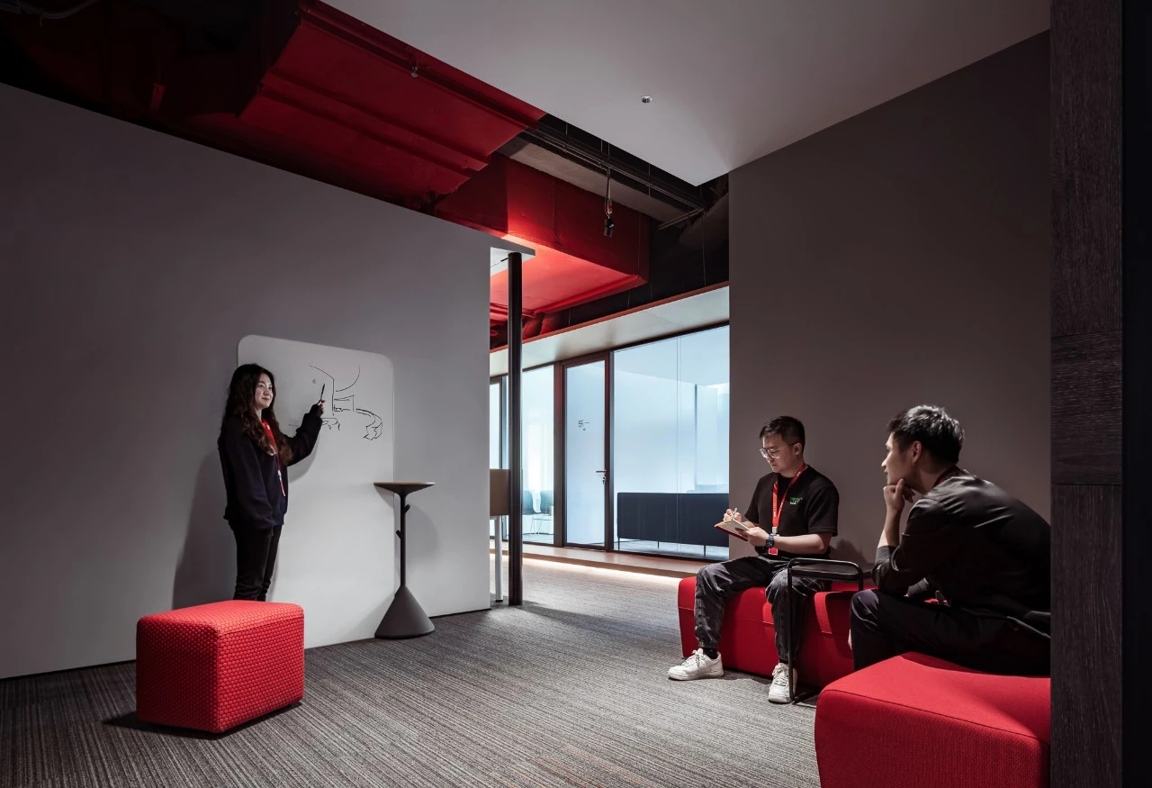 巧克力学院作为一个直播和教学空间,如果有过多的修饰反而会使得空间失去焦点,因此,设计师们遵循BARRY CALLEBAUT最基础的配色,整洁干净的白色空间配上金属质感的家具,红色的点缀为整个空间增添了一份靓丽。