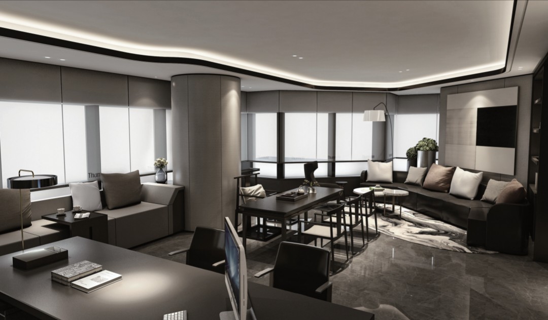 会议室沿用其深胡桃木色搭配属性,搭配黑色会议皮椅。公司会议是传达公司经营理念,集思广益解决问题,头脑风暴寻求创意的核心场所,更是商务洽谈的重要舞台。