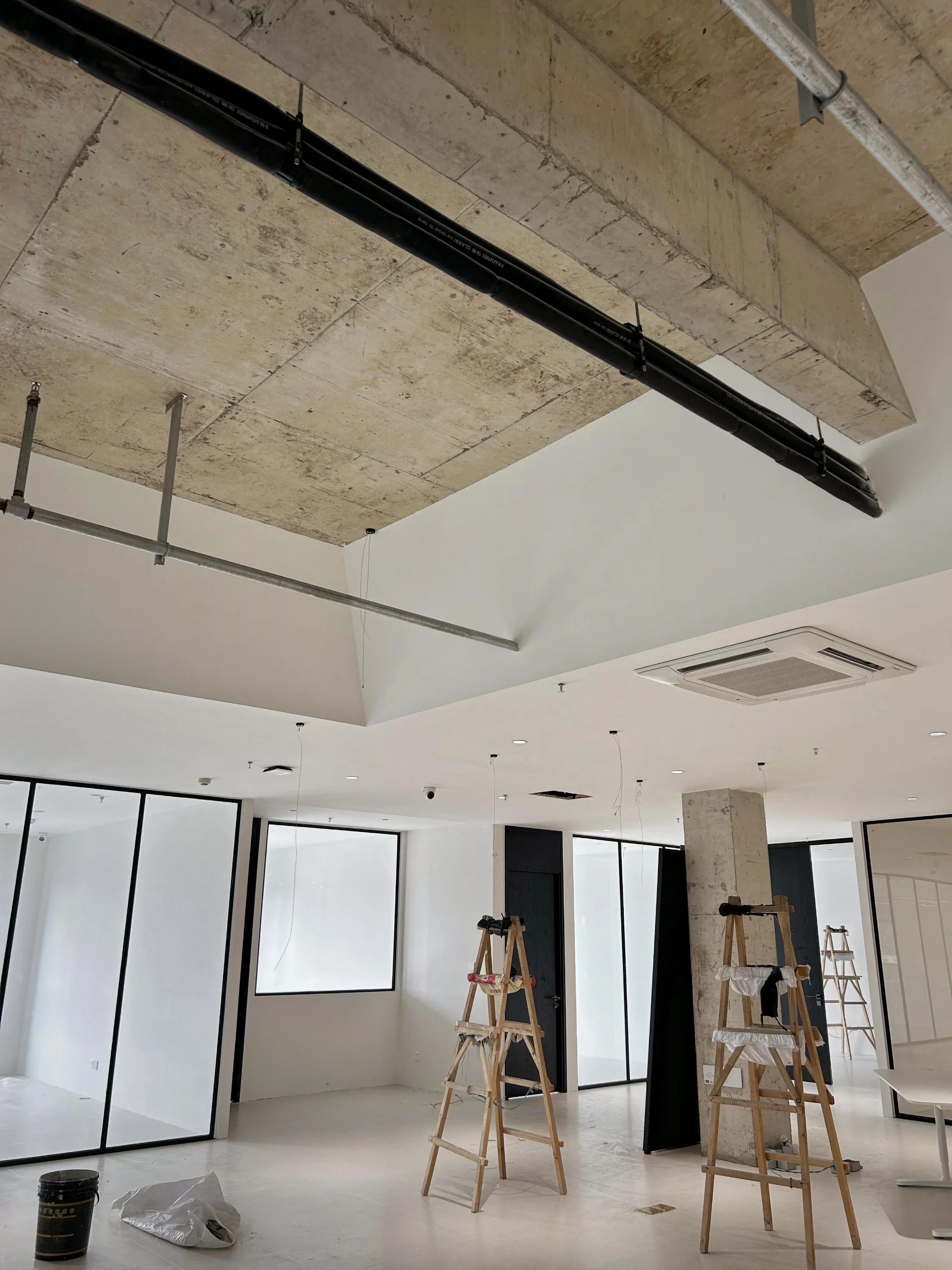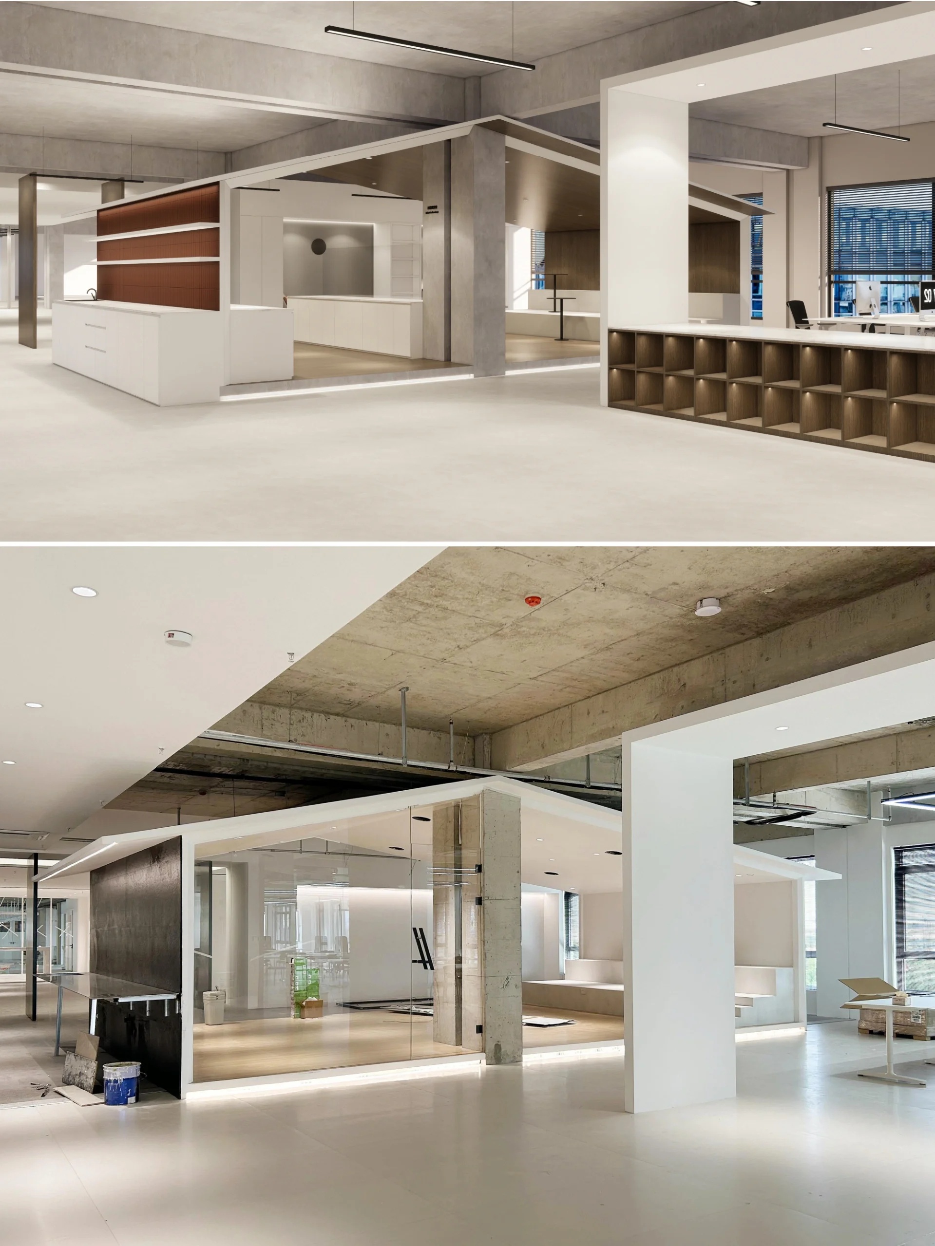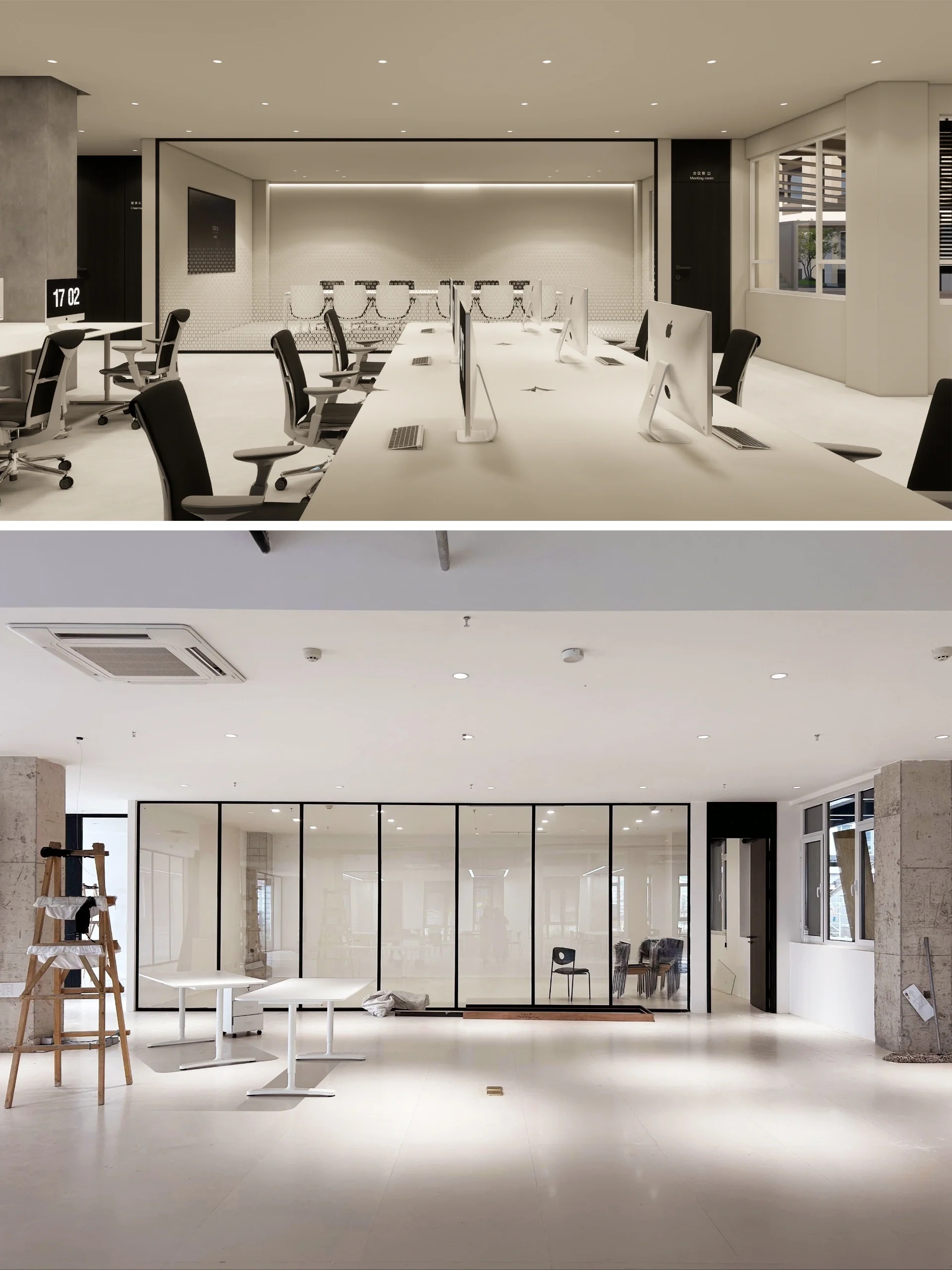 简单的办公空间 比较适合小团队或工作室 空间整体氛围简洁 干净 舒适 空间的部分柱子和梁保留了原始状态 让它呈现出更真实、自然的空间