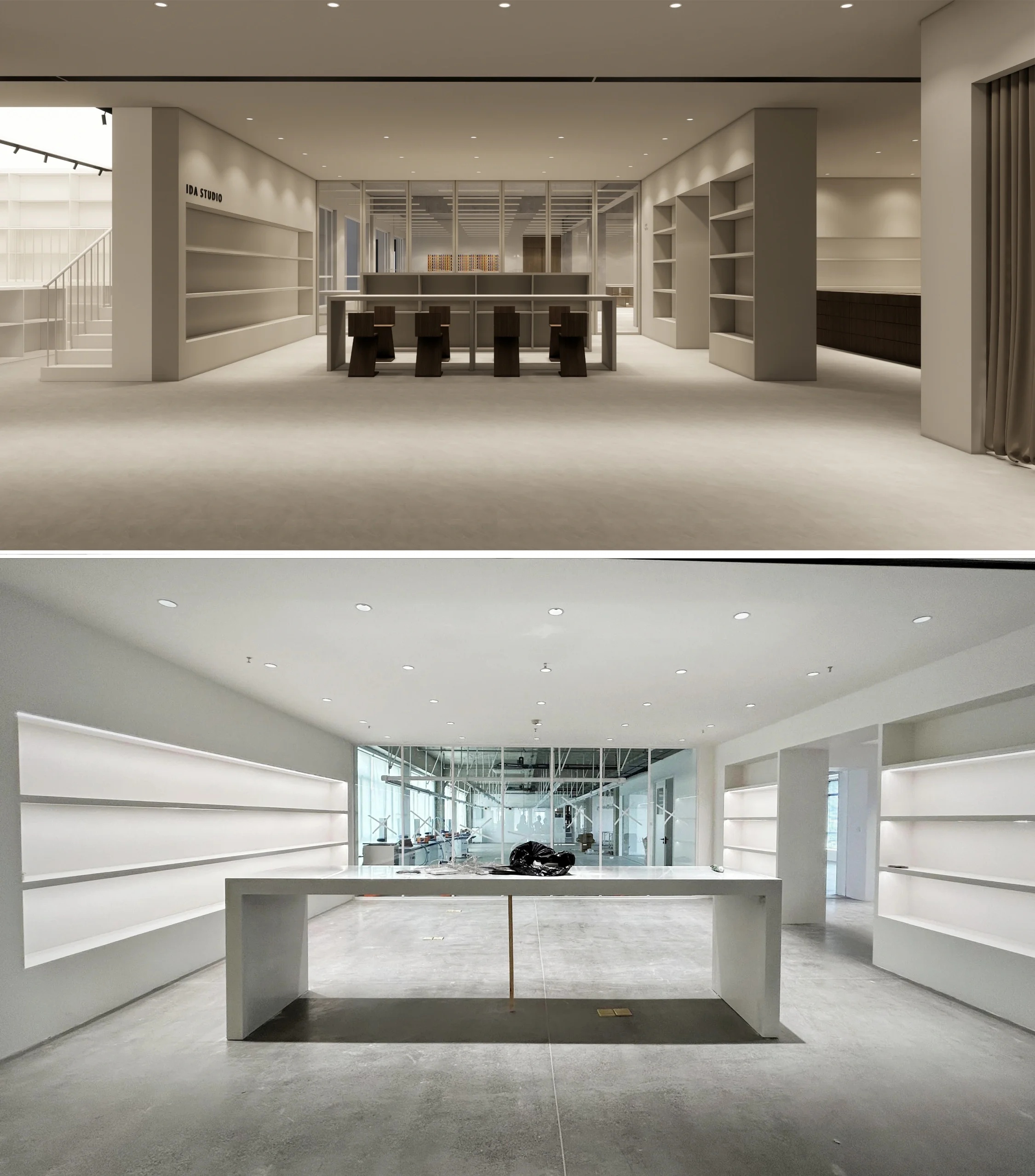 门口将地面抬高15cm做成一个盒子的形状,玻璃的结合自然形成一个小小天窗。类似夯土色泽的艺术涂料是最后反复挑选定稿的颜色,在具体有视觉冲击力的同时意外的也让人感受到平静。