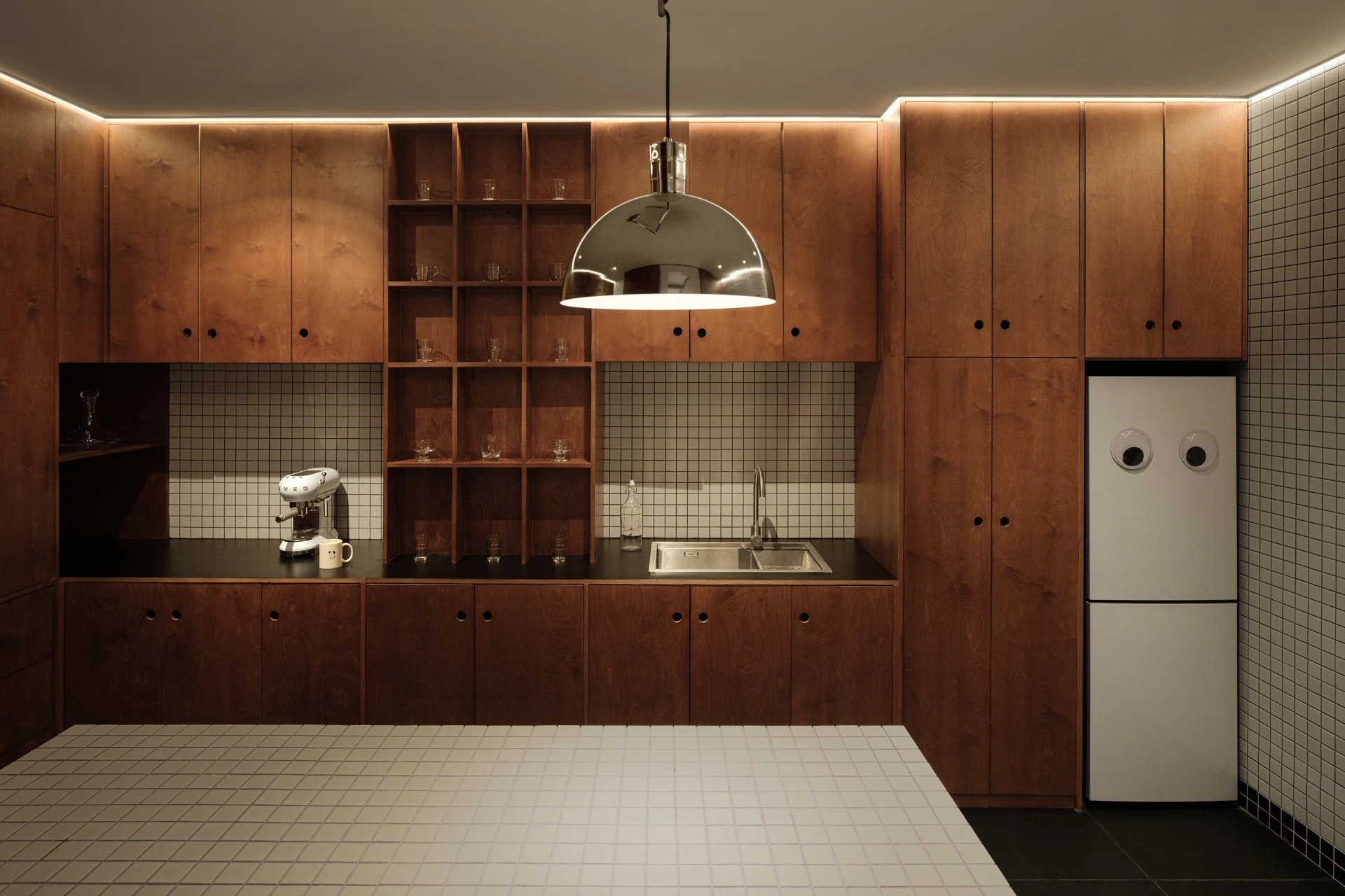 推开那扇“蓝色大门”,依然是温暖的木色铺成,让你自然地滑入另一个绮丽的梦境,点点的关于食物的温暖抚慰在你的胸口,暖黄的灯光打在马赛克的桌面,每一块马赛克都反射出关于美食的想象,与鳞次栉比的储物柜形成和谐的构成关系,延伸出空间的规则美感。