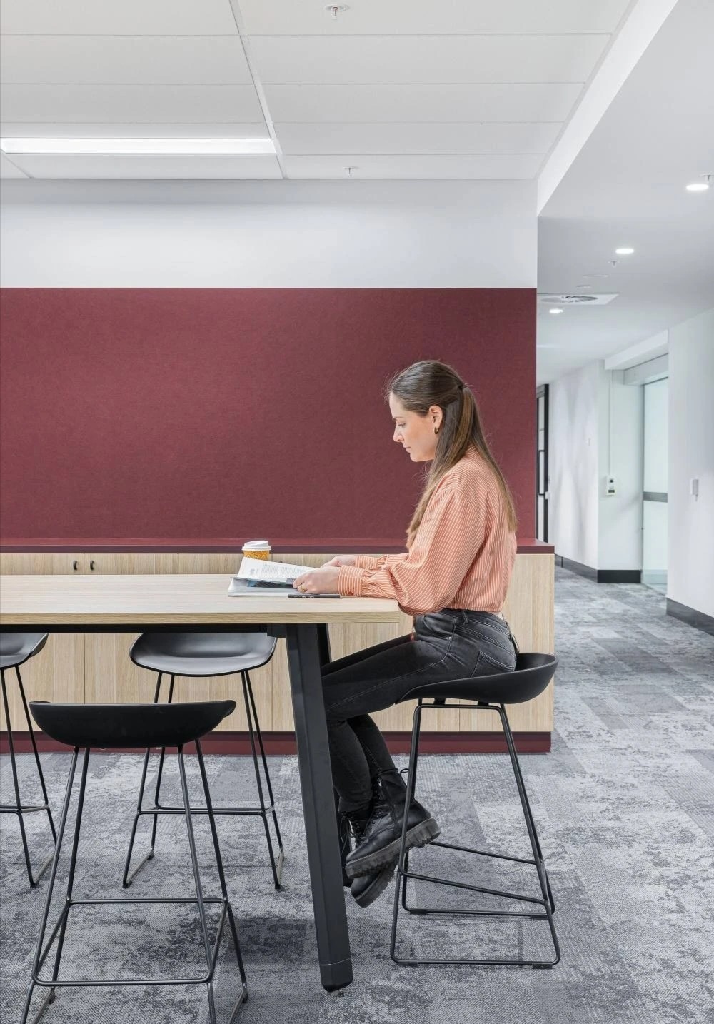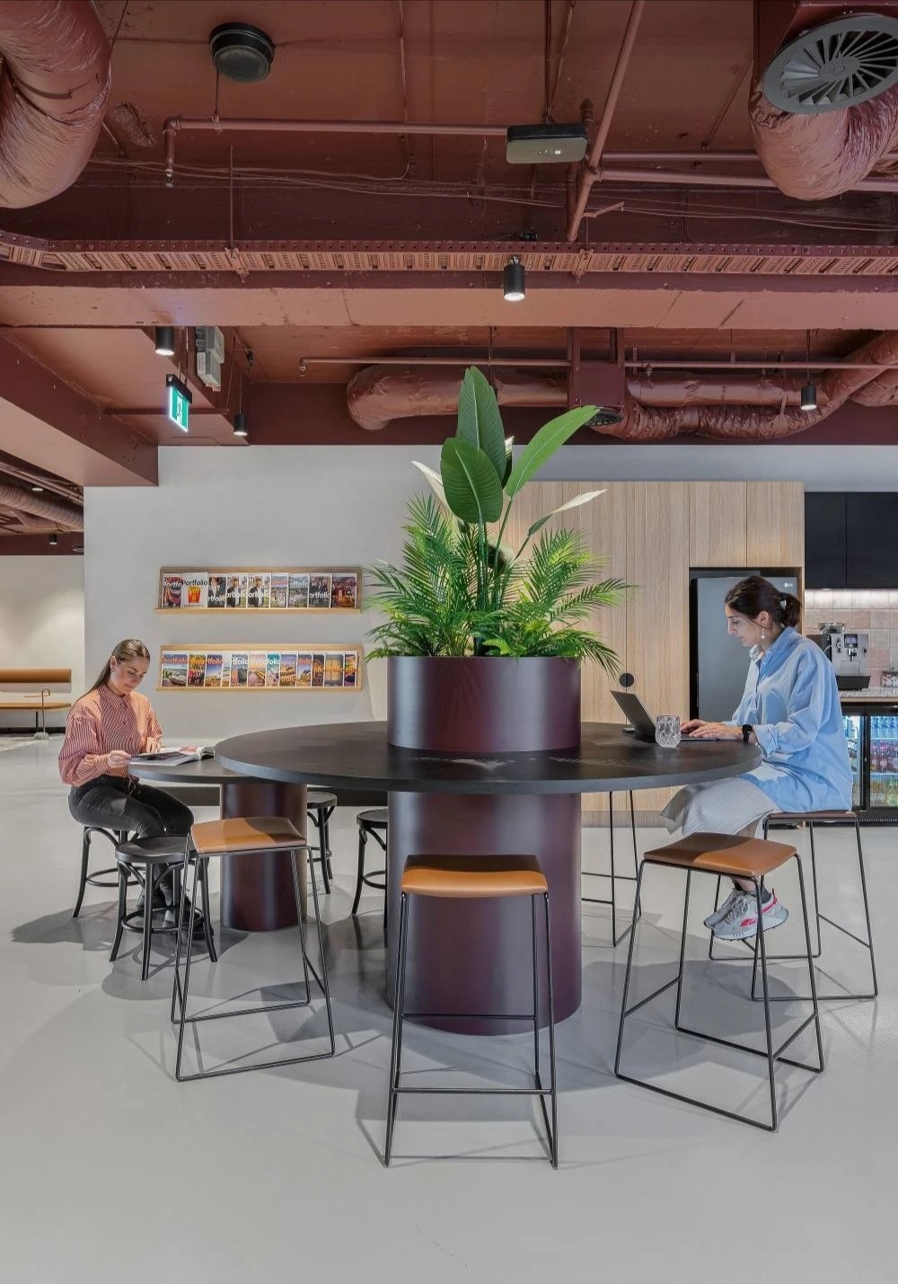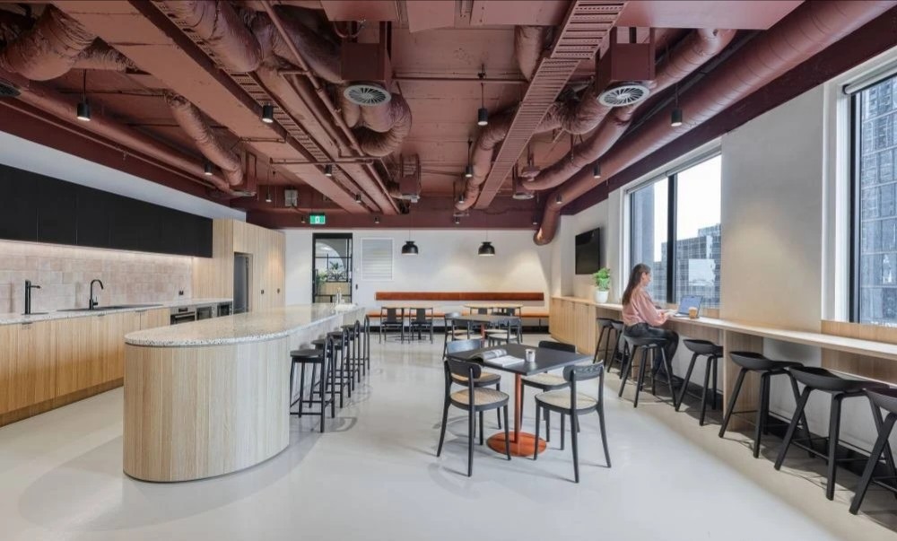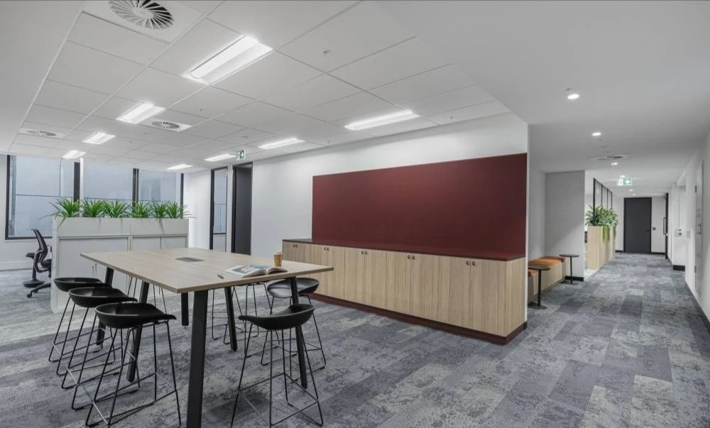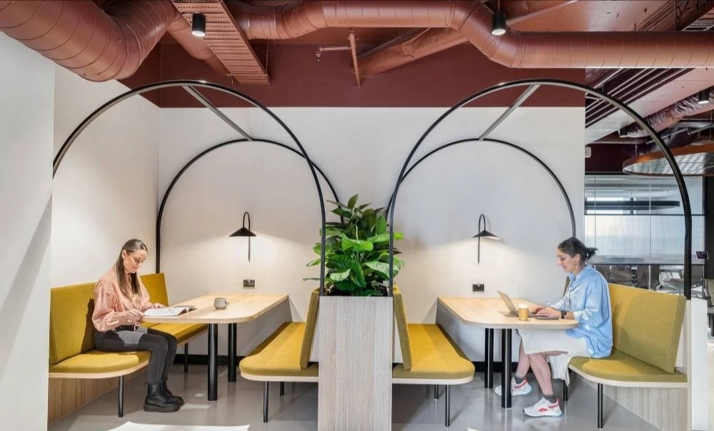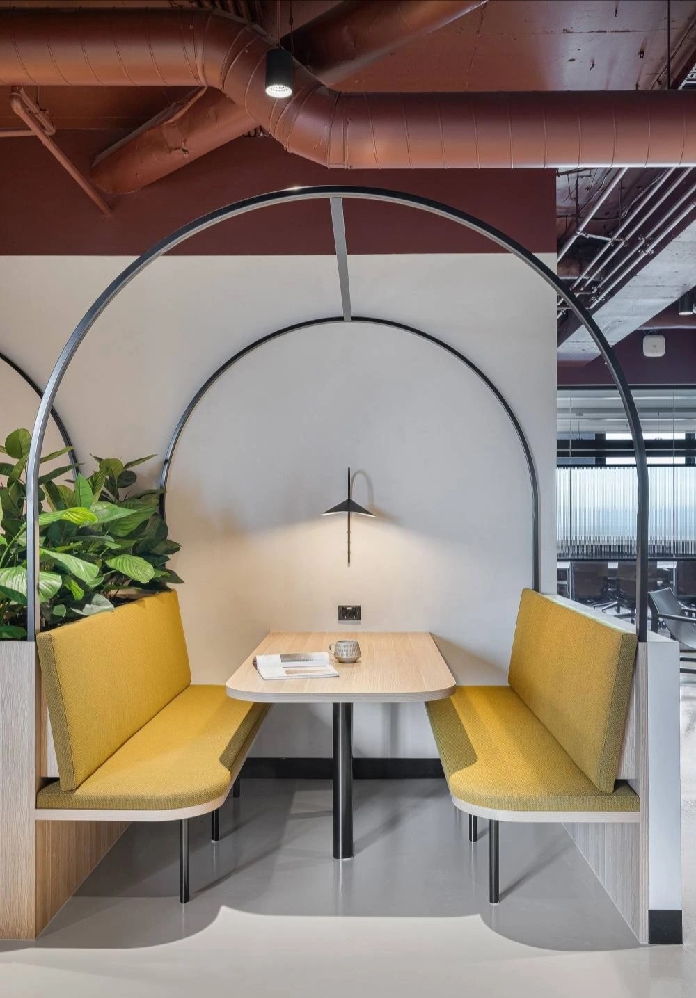 中庭位置是办公区与休闲区,没有明确的界限,只是一条过道,旨在实现激发活力和灵活开放的区域,为员工创造更多的交流互动的机会。休憩区以一面面隔墙隔开,营造个人感更强的空间氛围,工作之余随时可以坐下喝一杯咖啡,来一通电话,享受个人放松的专属时间。摒弃传统办公的吊装灯具,桌面灯具徐徐向上辐射无眩光,保证个人使用舒适之余,为整体空间带来柔和温畅之感。色彩明快的休闲区座椅和随处可见的绿植,都是作为打破整体视觉的颜色点缀。