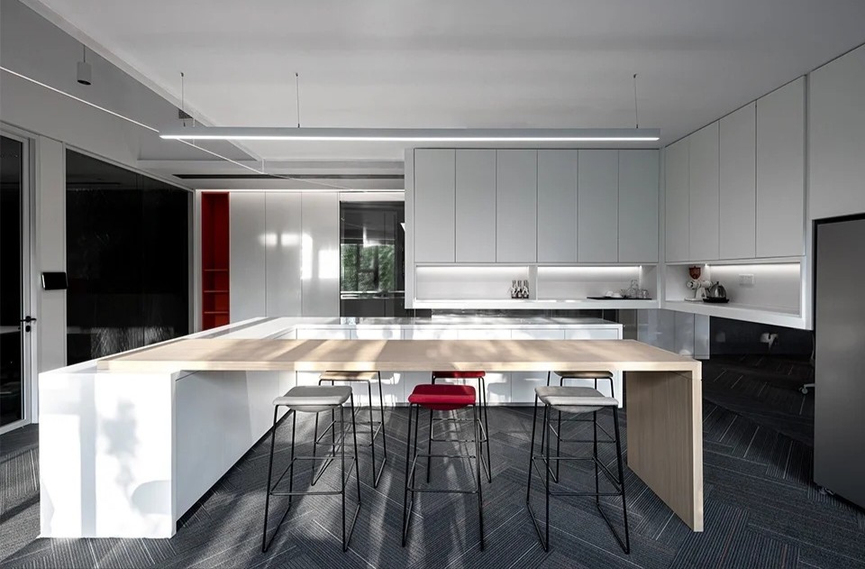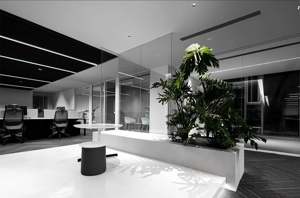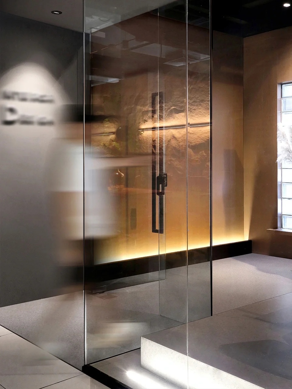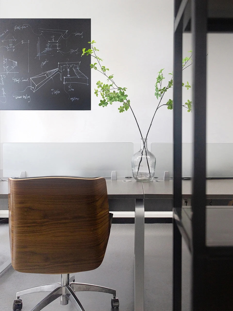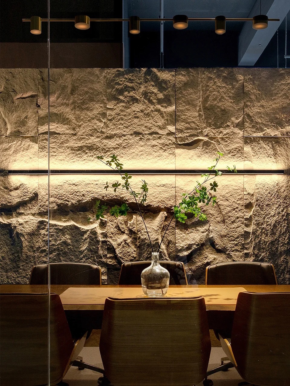 我们希望打破常态化办公空间的格局,光与影映射在墙面的肌理石皮上,探索如何构建办公空间的高级感。当阳光穿过玻璃砖的一瞬间,描绘出光与影的性感线条,与自然形态的芦苇干支相衬托,抒发着一种流光疏影之意。我们设想了一种以“感知”和“探索”为核心的空间系统,从尺度感知、行为感知、色彩感知、序列感知和多维感知为核心的一个具有多元探索的全新办公空间。