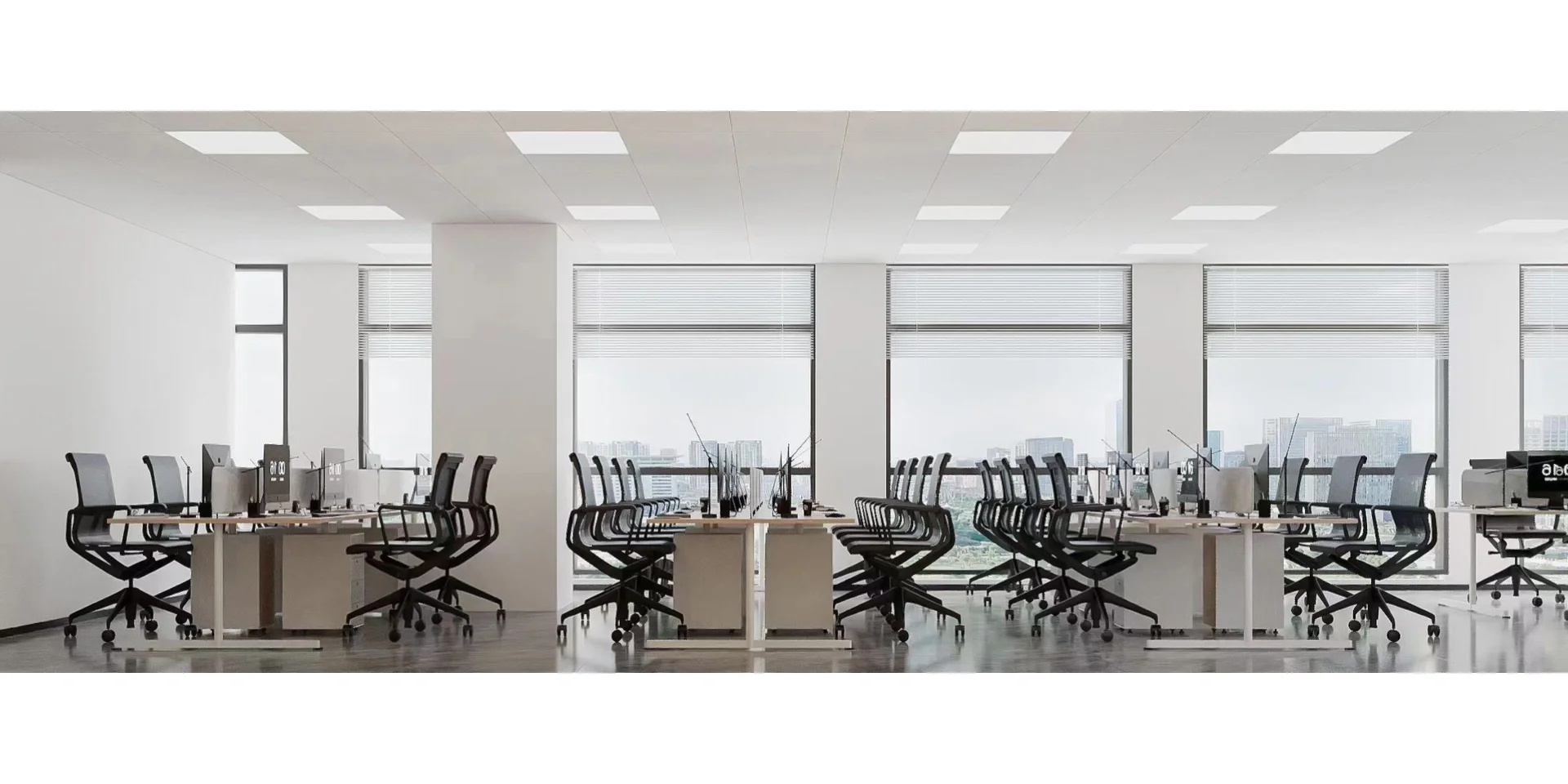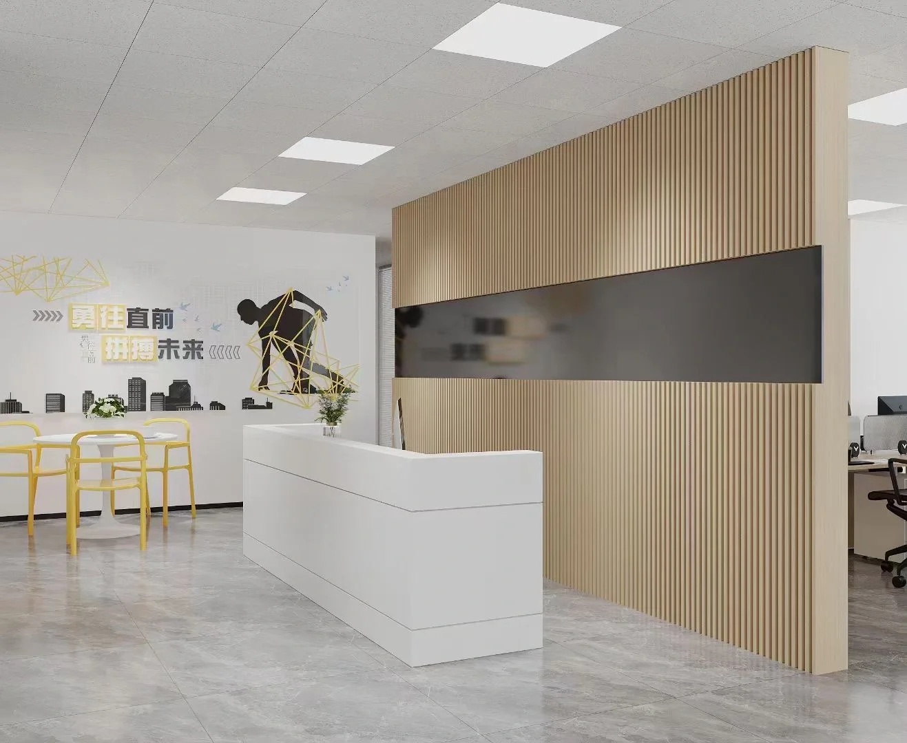 办公空间作为员工最常用的办公区域,舒适感和实用度是第一考虑的标准。在设计中,我们通过地毯的拼色将办公区域分割成列,使整个区域整齐规划。同时背景的彩色文化墙为区域增添色彩,减少工作氛围的压抑感,以关键词的方式展示的标语也时刻提醒着合作的重要性。