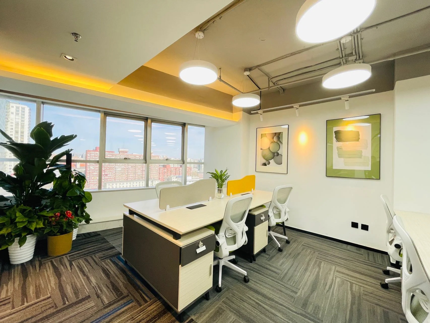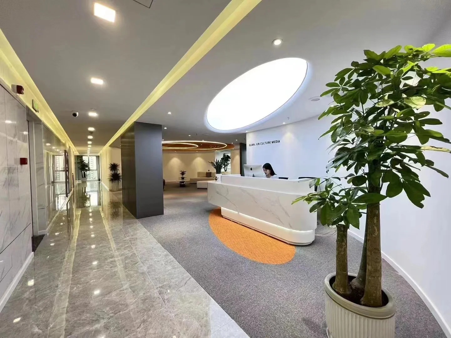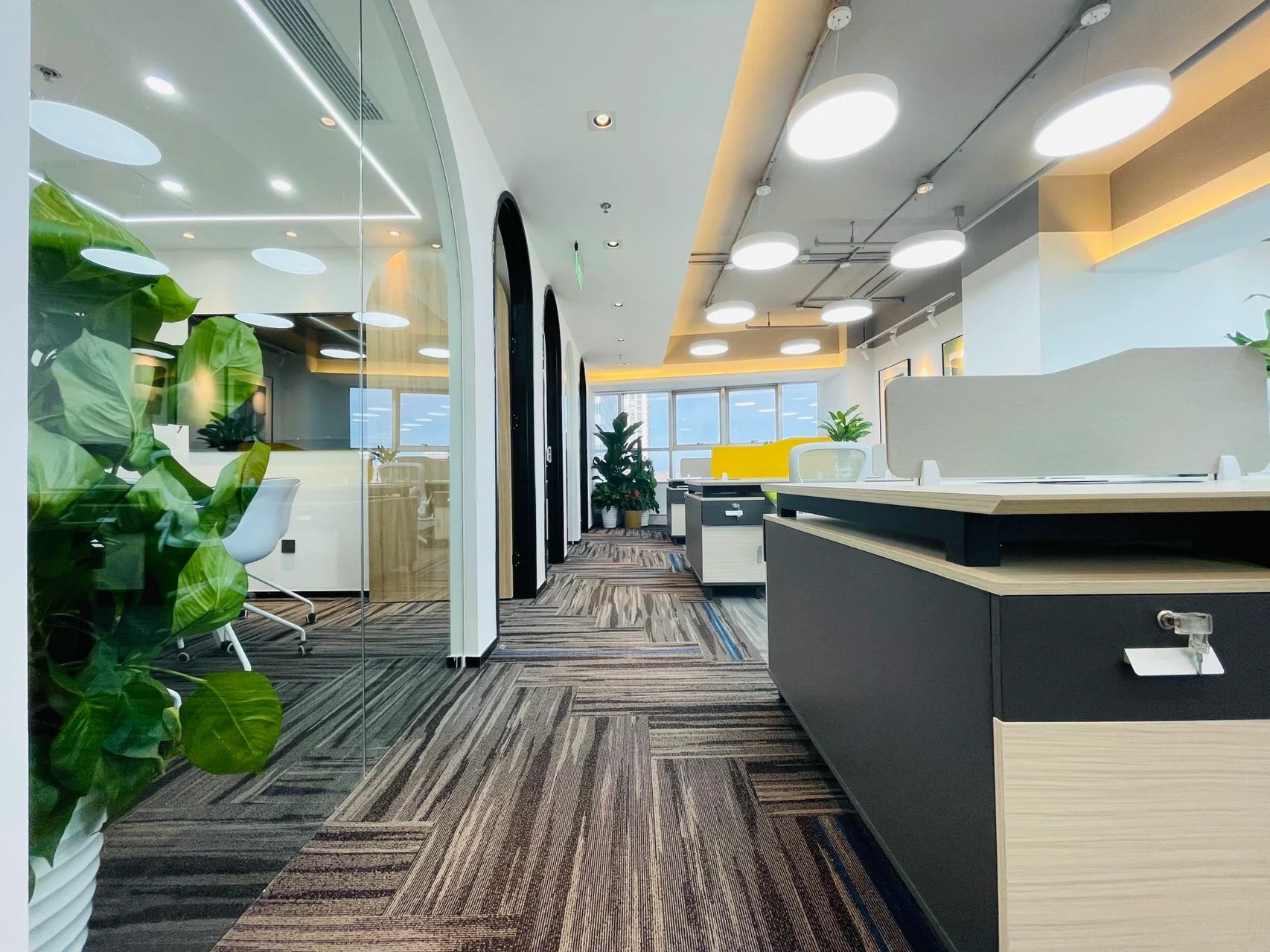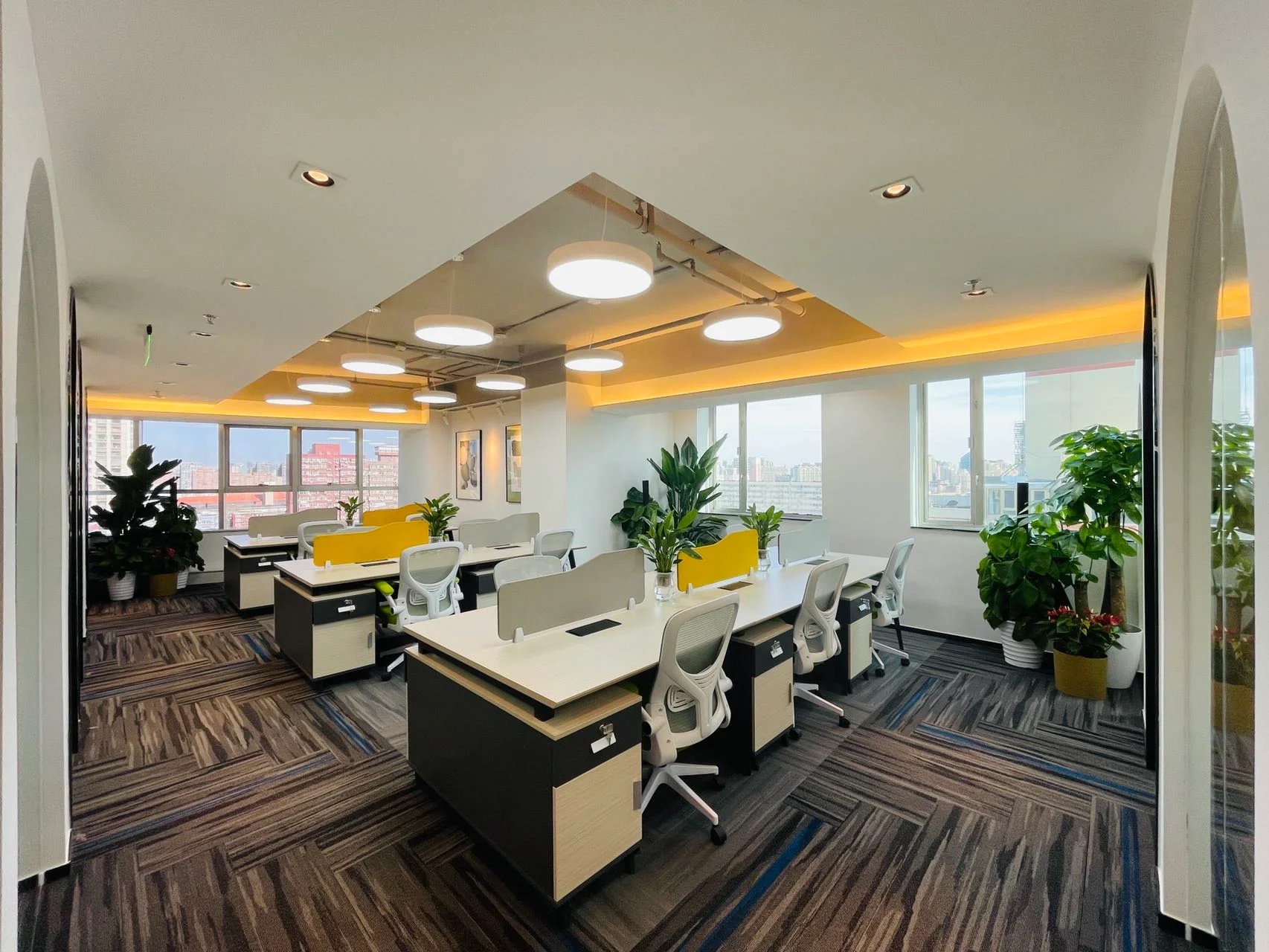 天圆地方的设计理念,全新装修简约时尚!精心设计、定制家具配备全齐,房间内均采用单层钢化玻璃到顶隔断。给您一种氛围式的办公体验。