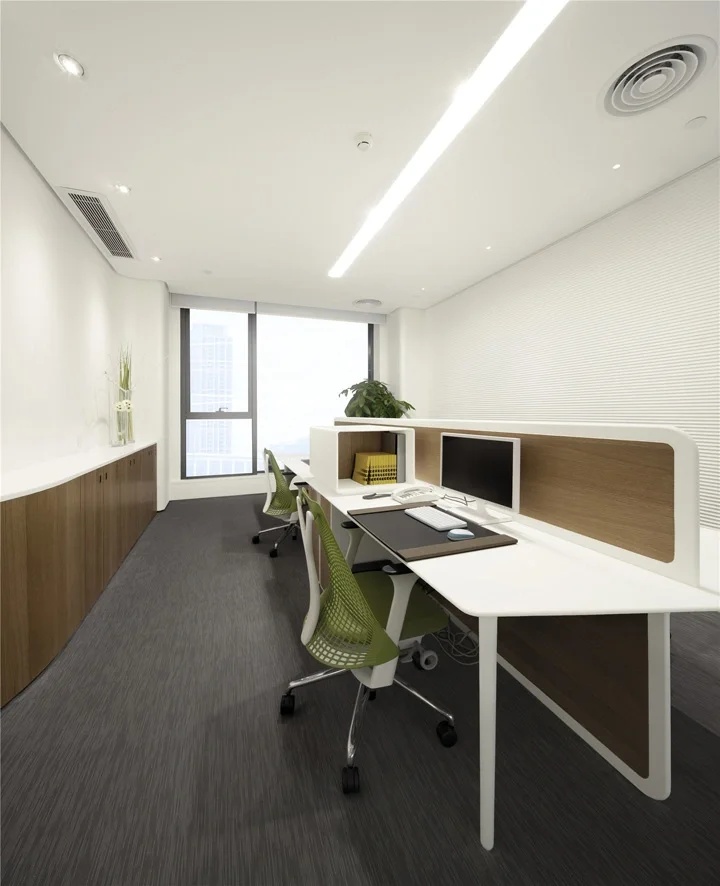 这个项目的装修风格属于极简风细节中带着一点色彩点缀让办公氛围更加活跃轻松采用全透明玻璃隔断,让整体环境更加明亮通透大面积办公区陈列整齐划一方便管理休息区随性舒心会议桌采用原木大桌面高级感十足