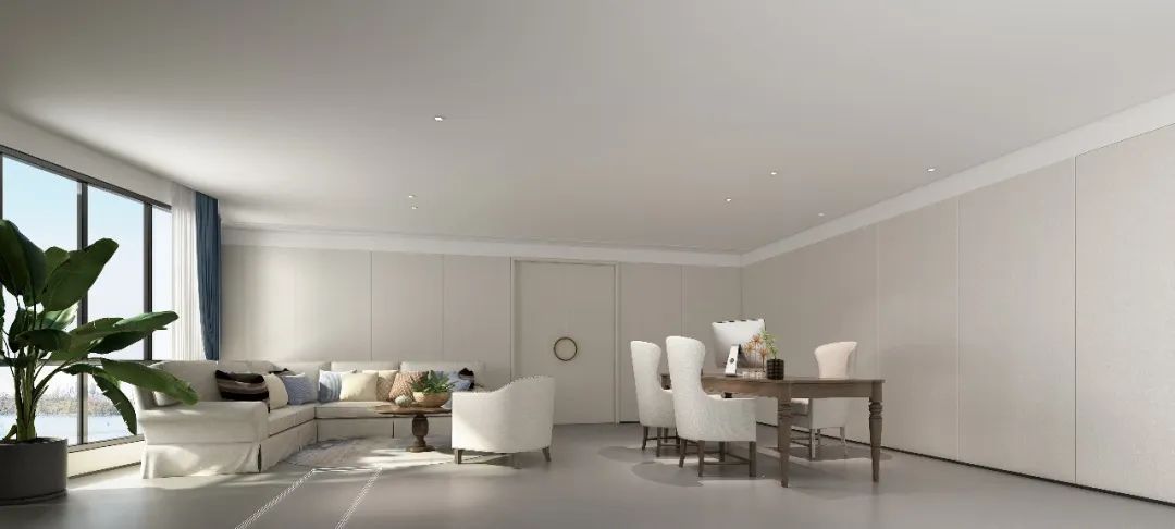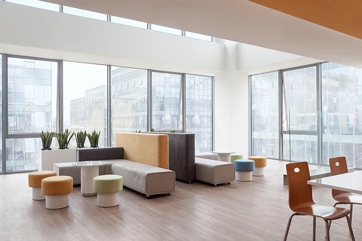 “回形空间”办公设计空间以白色为基调,同时呈现平整,树皮纹,方格纹,斜拼砖纹四种不同的质感。白色与木色的划分丰富了空间的层次感,黄色与蓝色的点缀则增加了空间的生机和活力。设计师打破了原本沉闷的工作环境,结合超高层高、裸露的天花留白和工业感的吊灯,重新创造一个明亮开阔的空间,为员工营造一个愉悦的工作环境。