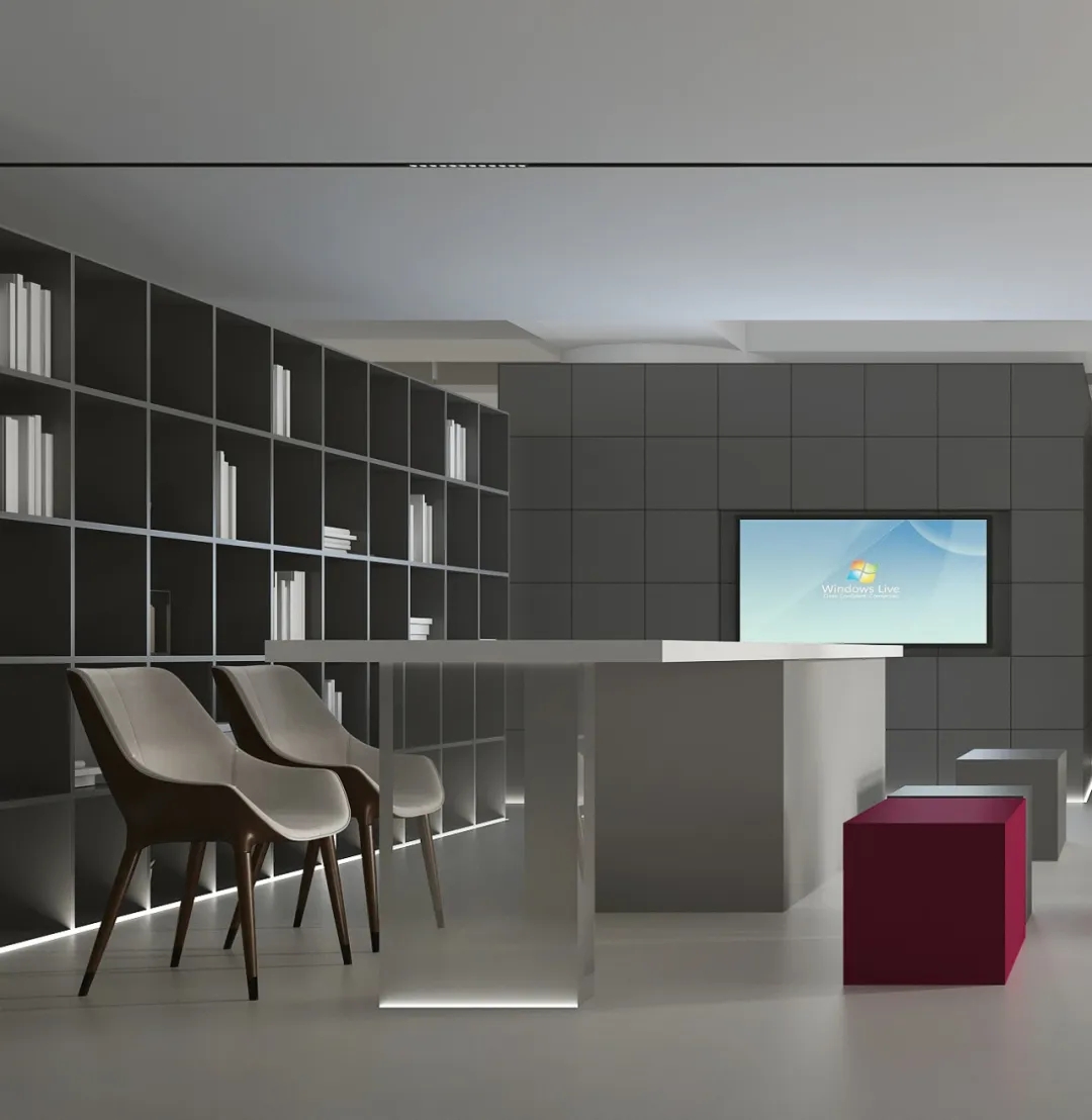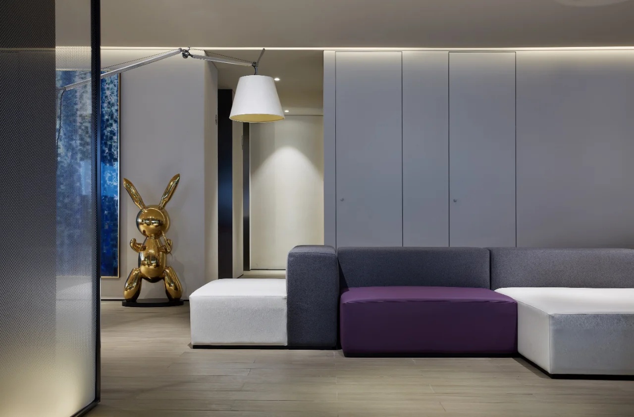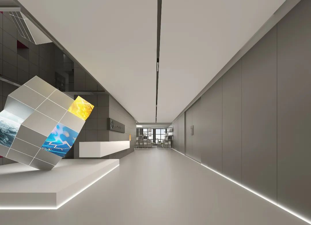 设计师将想象中的未来世界放入现实,超现实的风格元素,闪跃的踏步发光梯板,轻盈跳跃的色块,打造了一个具有科技感的办公空间。