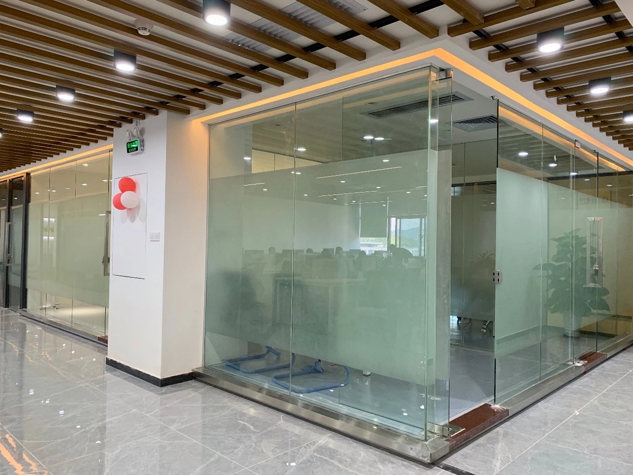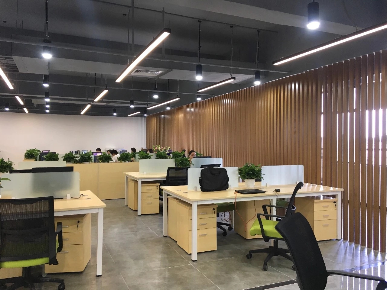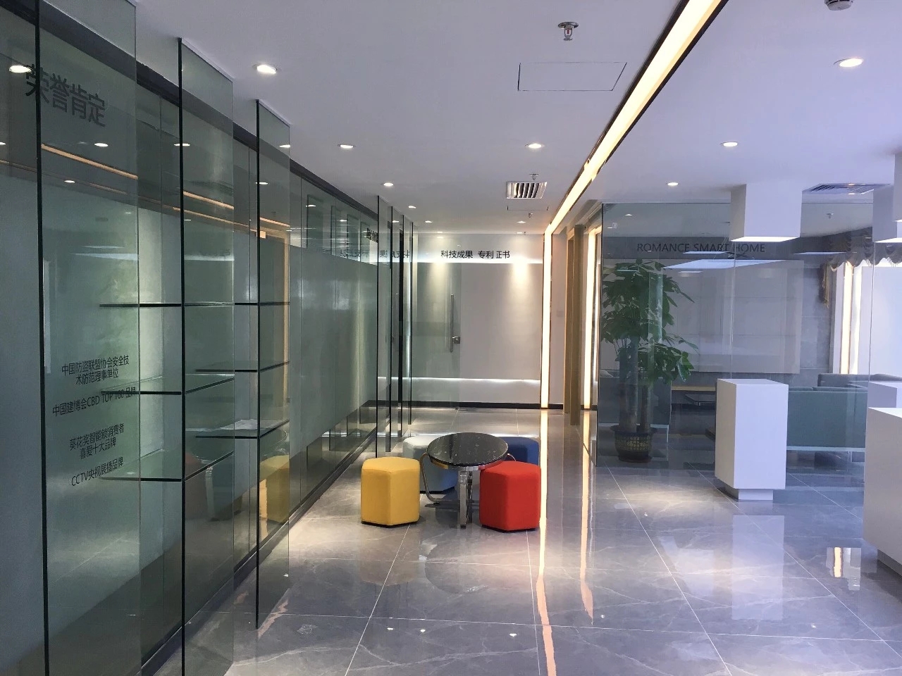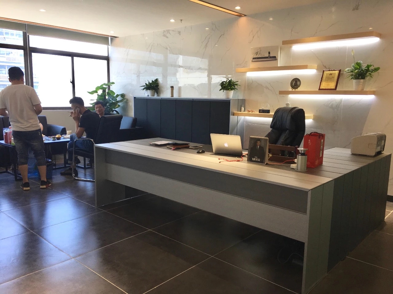 简约不失视觉冲击力的前台斜面立体造型跃然眼前,黑金石结合LED灯和爵士白大理石背景墙相互呼应,给人以格调不失力量,将公司的科技创新,奋发向上的文化深刻表达了出来