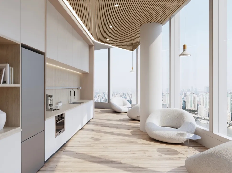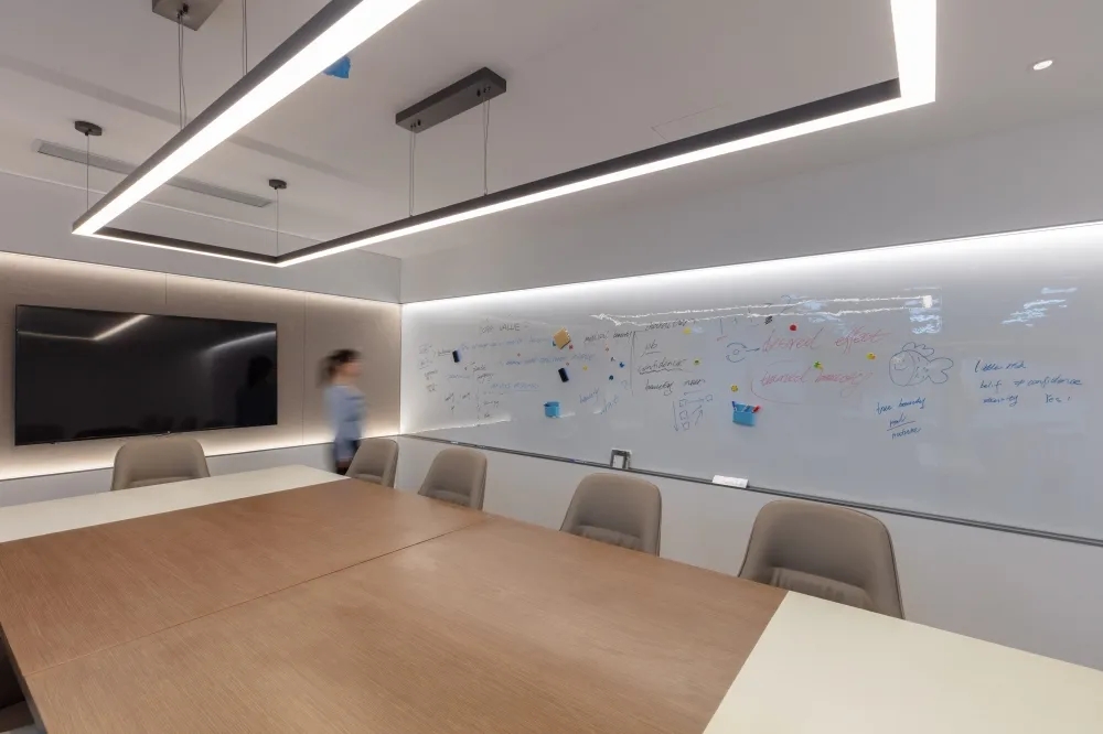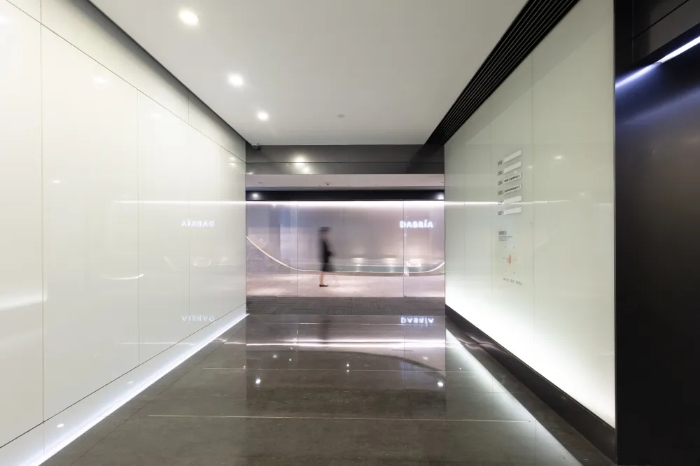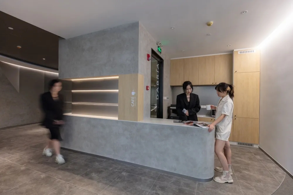 用建筑的思维进行办公室设计,用工作方式的角度去思考空间的连接形式,实现动线区分和视线连通。在不将一家公司割裂的前提下,BES找到需求的共通点,通过硅藻泥和铝板两种材质贯穿整个空间设计。注重人与空间的情绪交流,模糊概念界限,提高利用率和空间活性,强调流通的重要性,整体流线中环环相扣,增加空间延伸性和功能性。