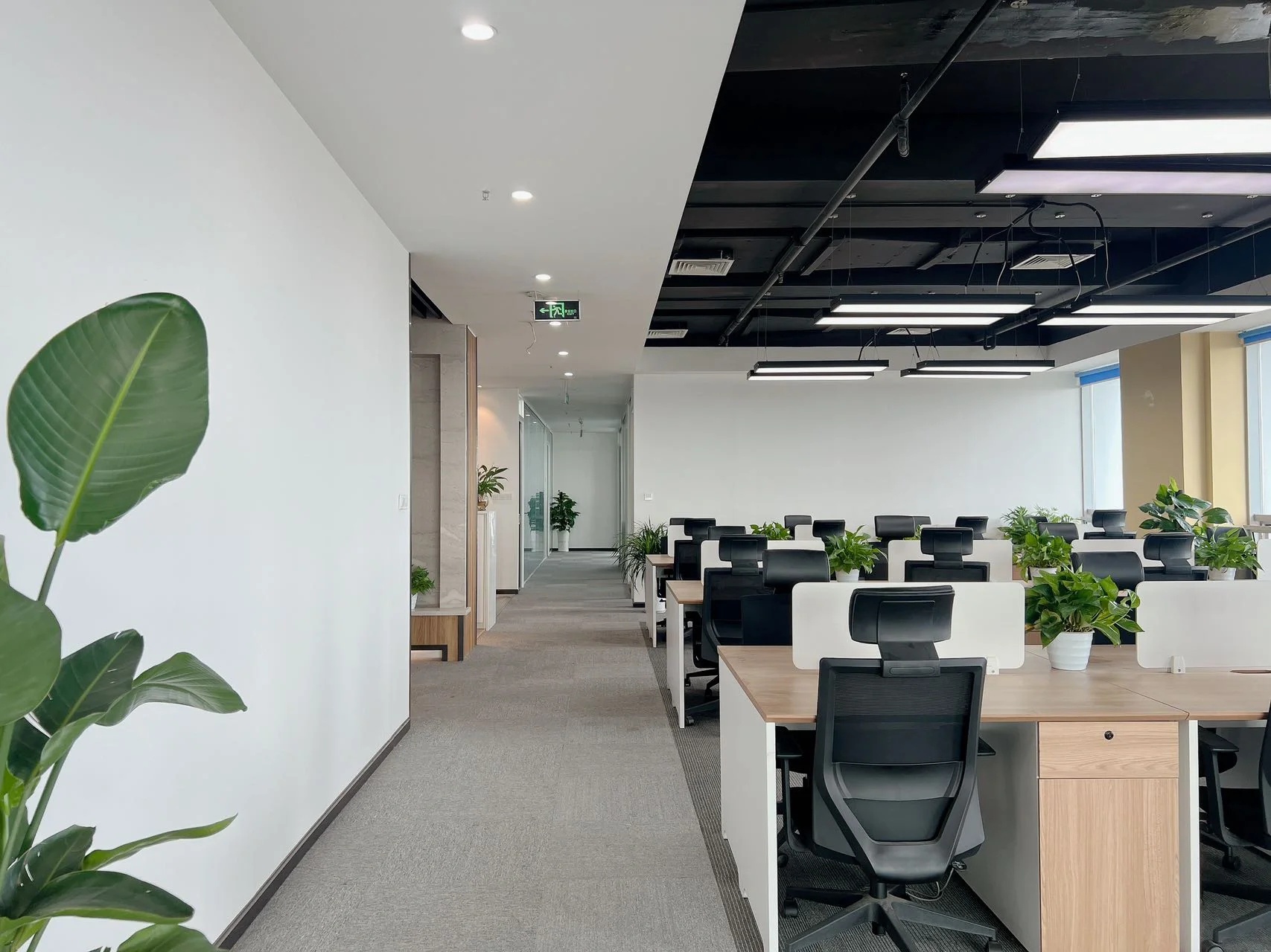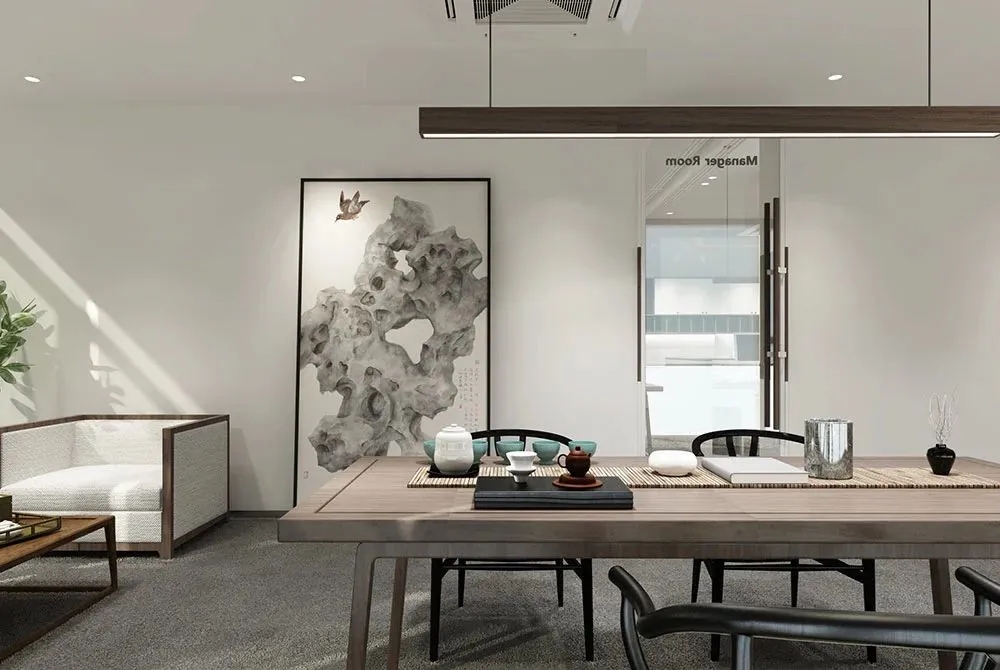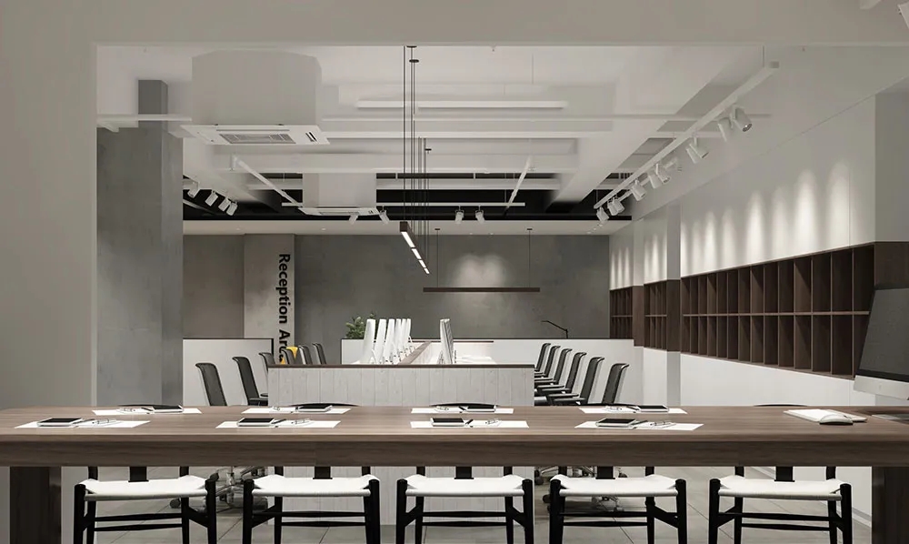 宽敞且简约特点的空间设计,让更多的阳光撒透过窗户洒落在这片空间里面,使得屋内充满温暖惬意的氛围,附带加入各种黑白灰的时尚元素与之轻松搭配,线条分明、独特别致。裸露的天花与石膏板吊顶、整体刷白的墙体、地坪漆与地砖的铺设,使整个空间简洁大气,自在舒适,利于缓解员工紧张工作压力,激发员工创新潜力,更为舒适高效的工作。