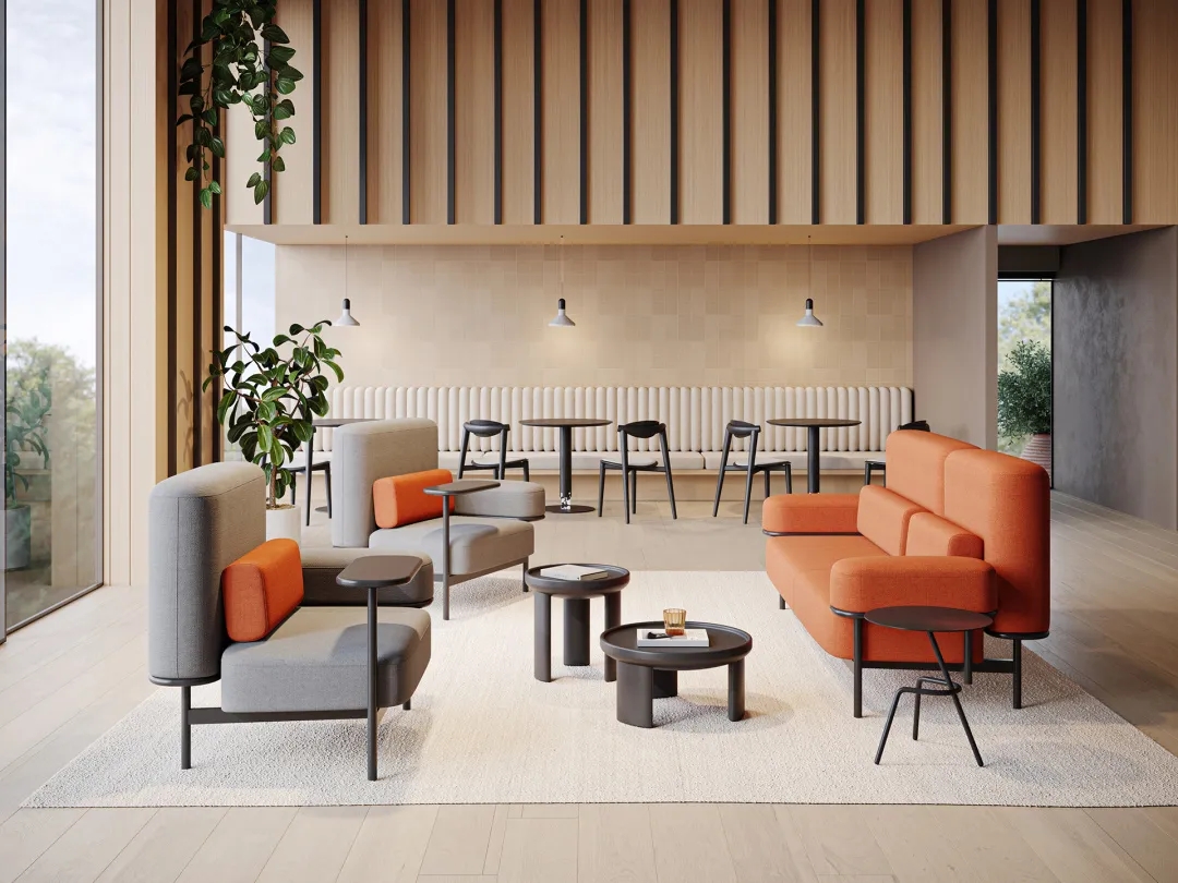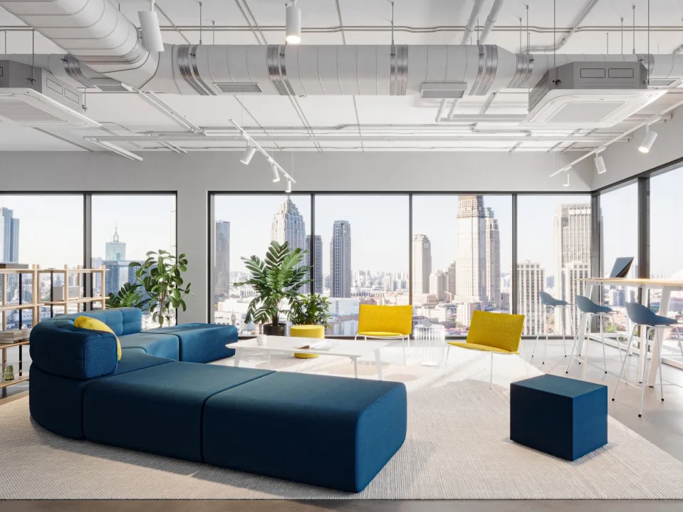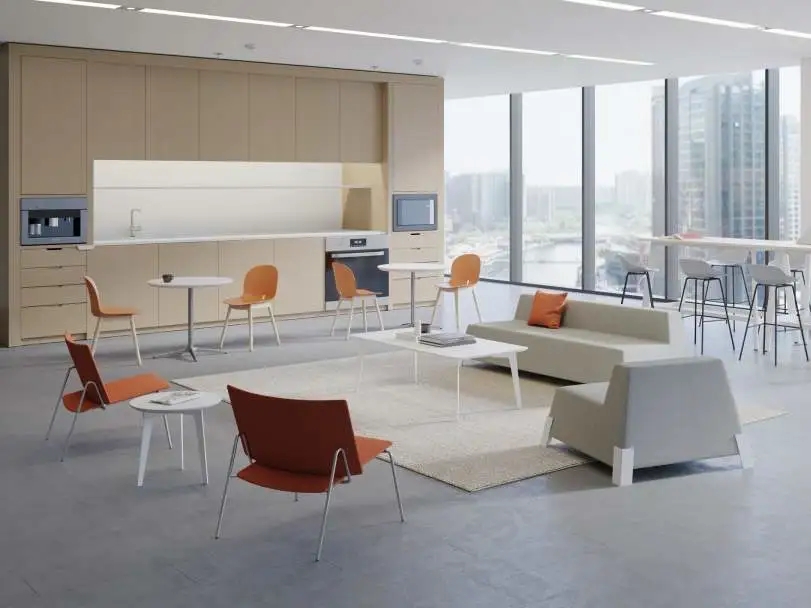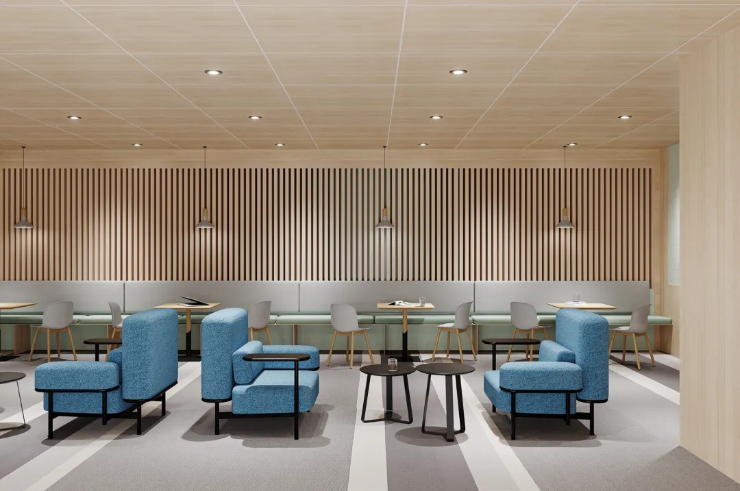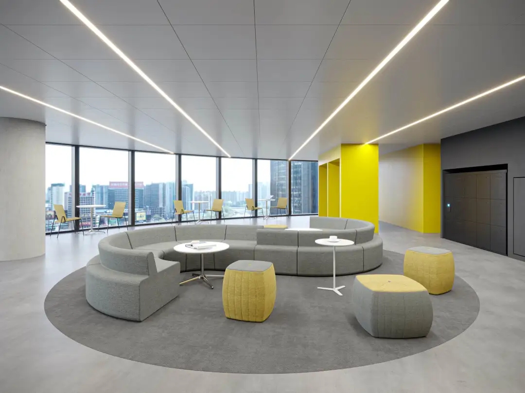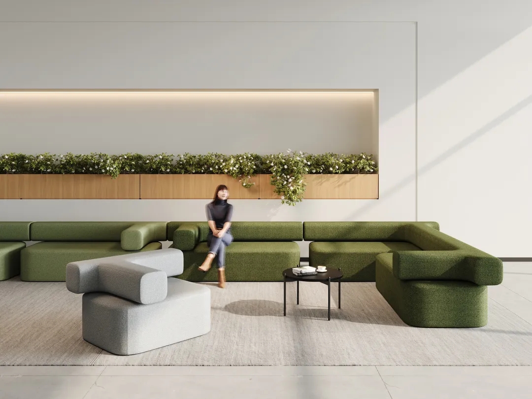 互动交流区的沙发通常以鲜明的颜色、独特的形状和多样的布艺设计为特点,营造友好的氛围,激发员工的创造力和想象力。沙发明亮的色调能与办公区域拉开差距,让员工进入后可以很快转换心情。