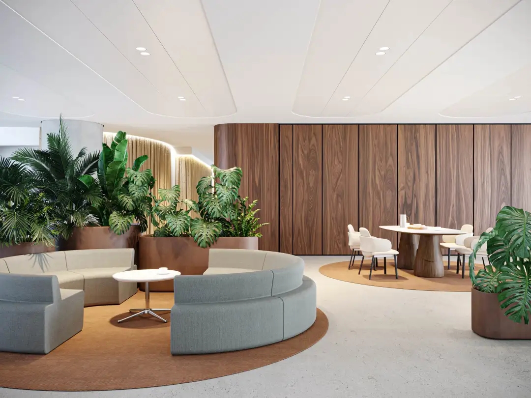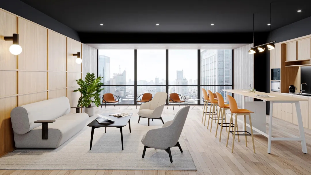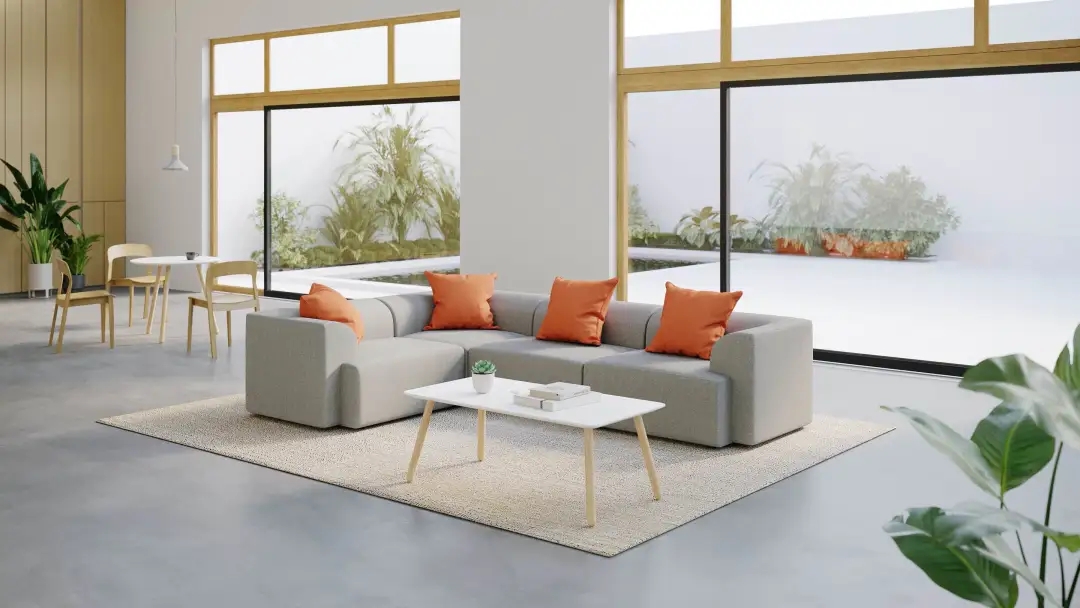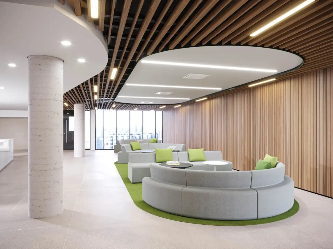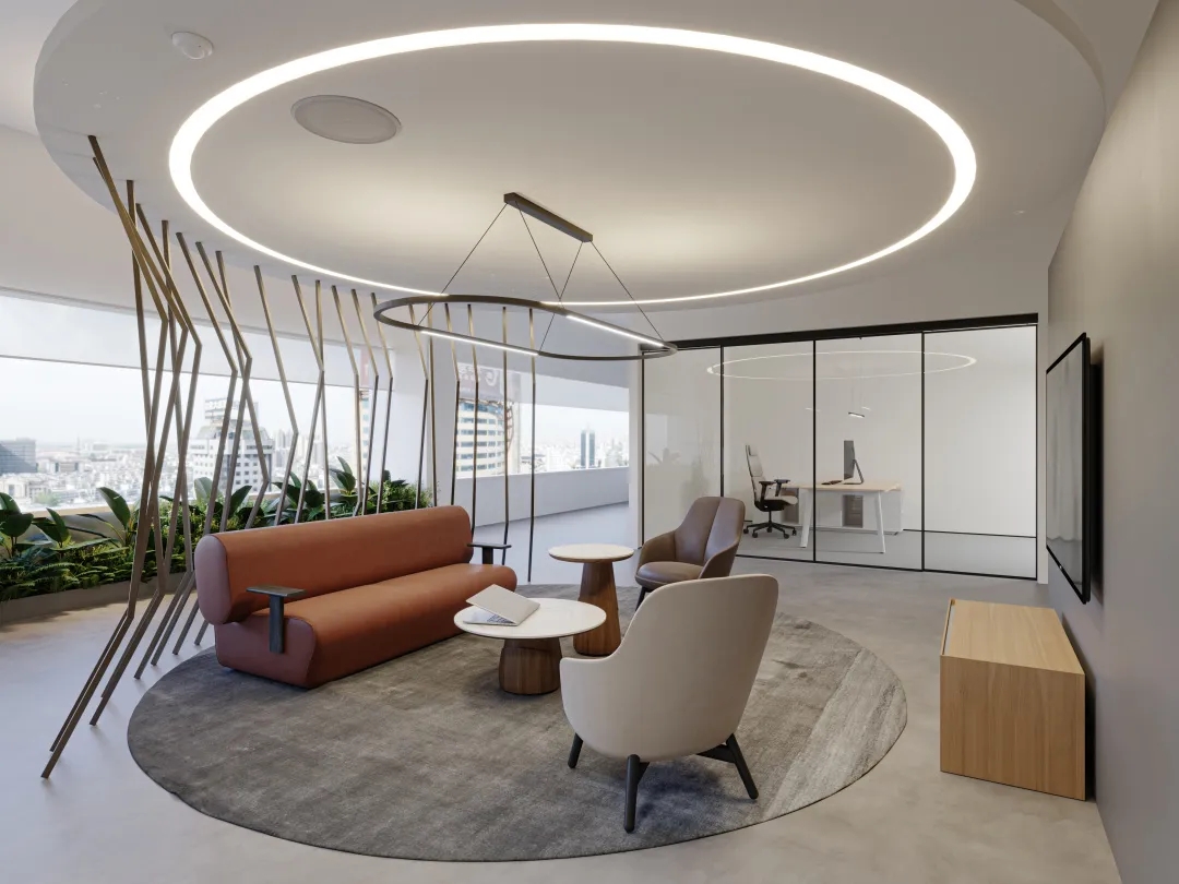 互动交流区的沙发通常以鲜明的颜色、独特的形状和多样的布艺设计为特点,营造友好的氛围,激发员工的创造力和想象力。沙发明亮的色调能与办公区域拉开差距,让员工进入后可以很快转换心情。