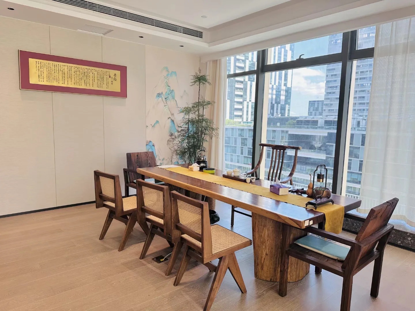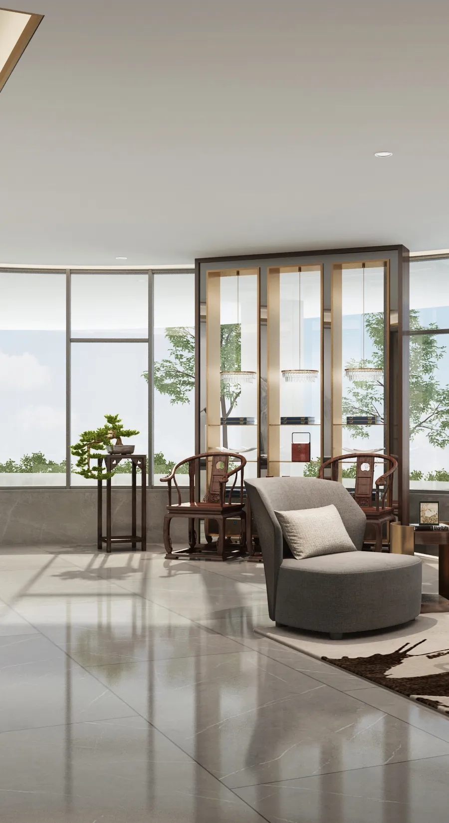 以自然风光为主体,将庭院与室内的融为一体,加上深红色、金色和象牙白等颜色既有传统中式元素,又有现代商务气息,能够给人带来强烈的视觉效果,也处处体现了崇尚自然的写意气息