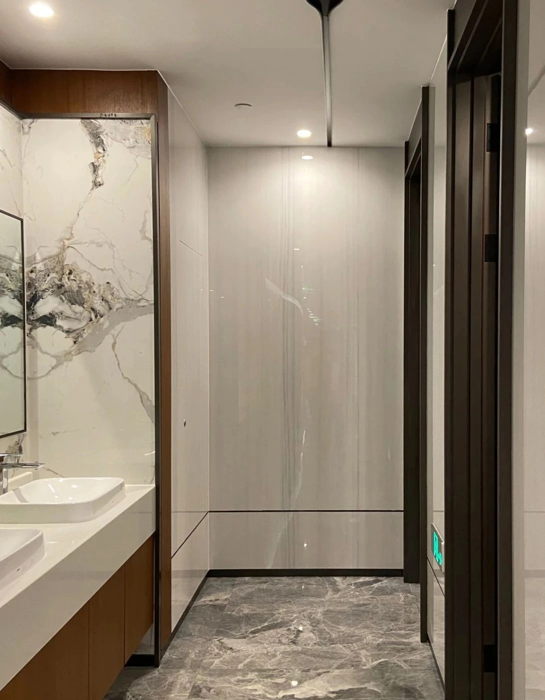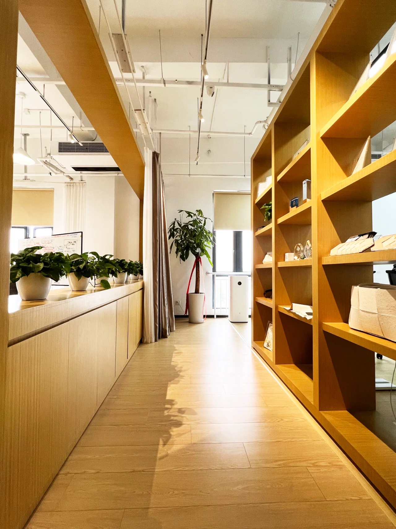 新办公空间的设计,首先在室内主材上延续了原办公室的柚木饰面和钢化玻璃(隔墙),同时亦增加两种主材:穿孔铝板和烤漆玻璃。这两项新的材料主要使用在围绕核心筒的走道上方和墙饰面,浅色系的核心主色同复兴路SOHO的电梯厅风格上更好地衔接,并对核心筒外侧的单跨柱网使用空间形成了一定的光反射辅助效果。