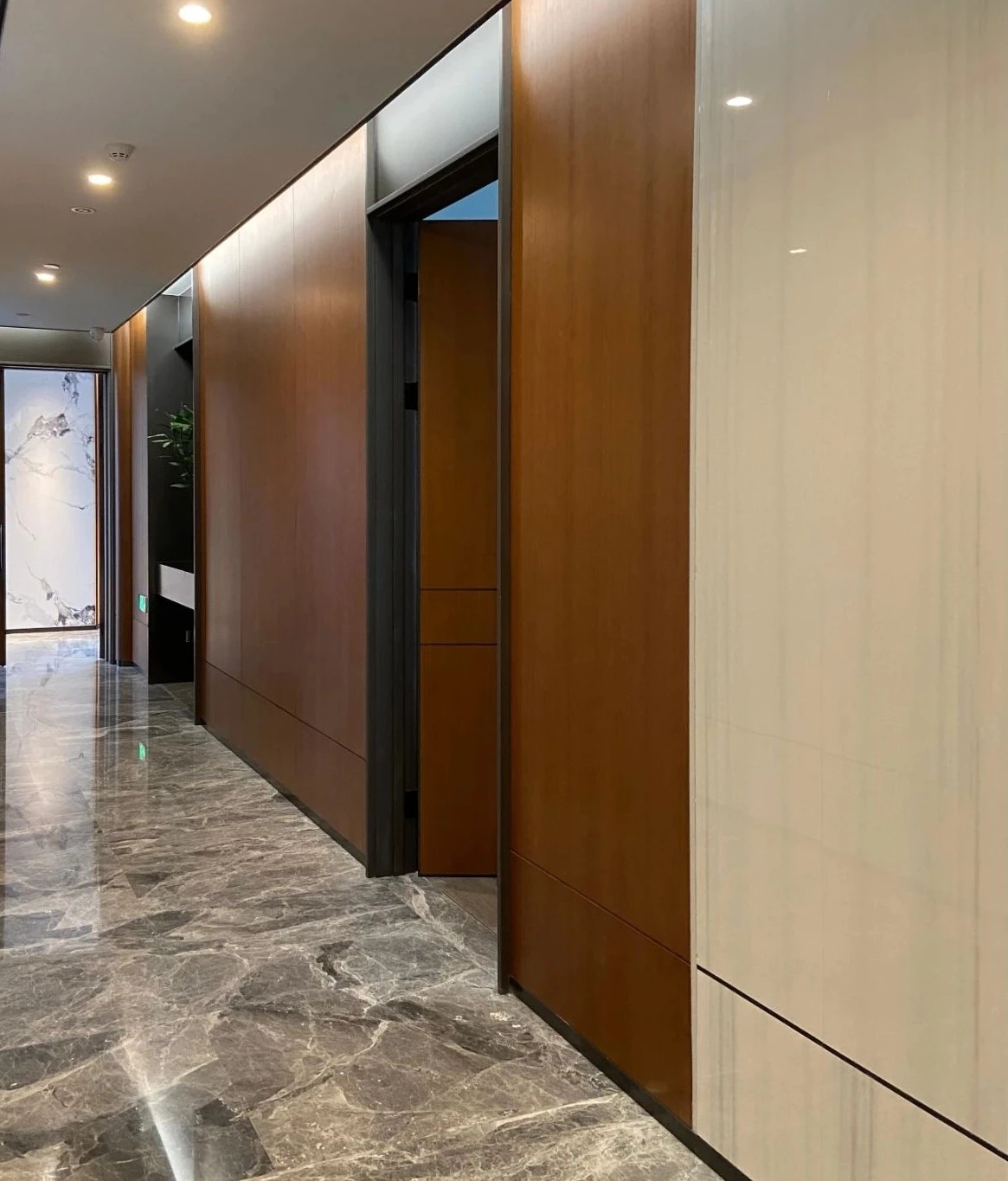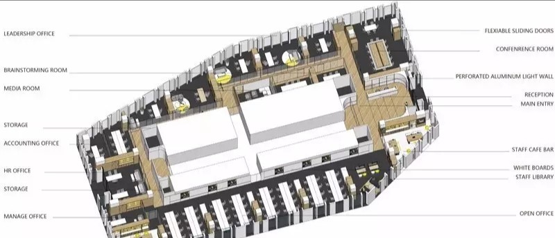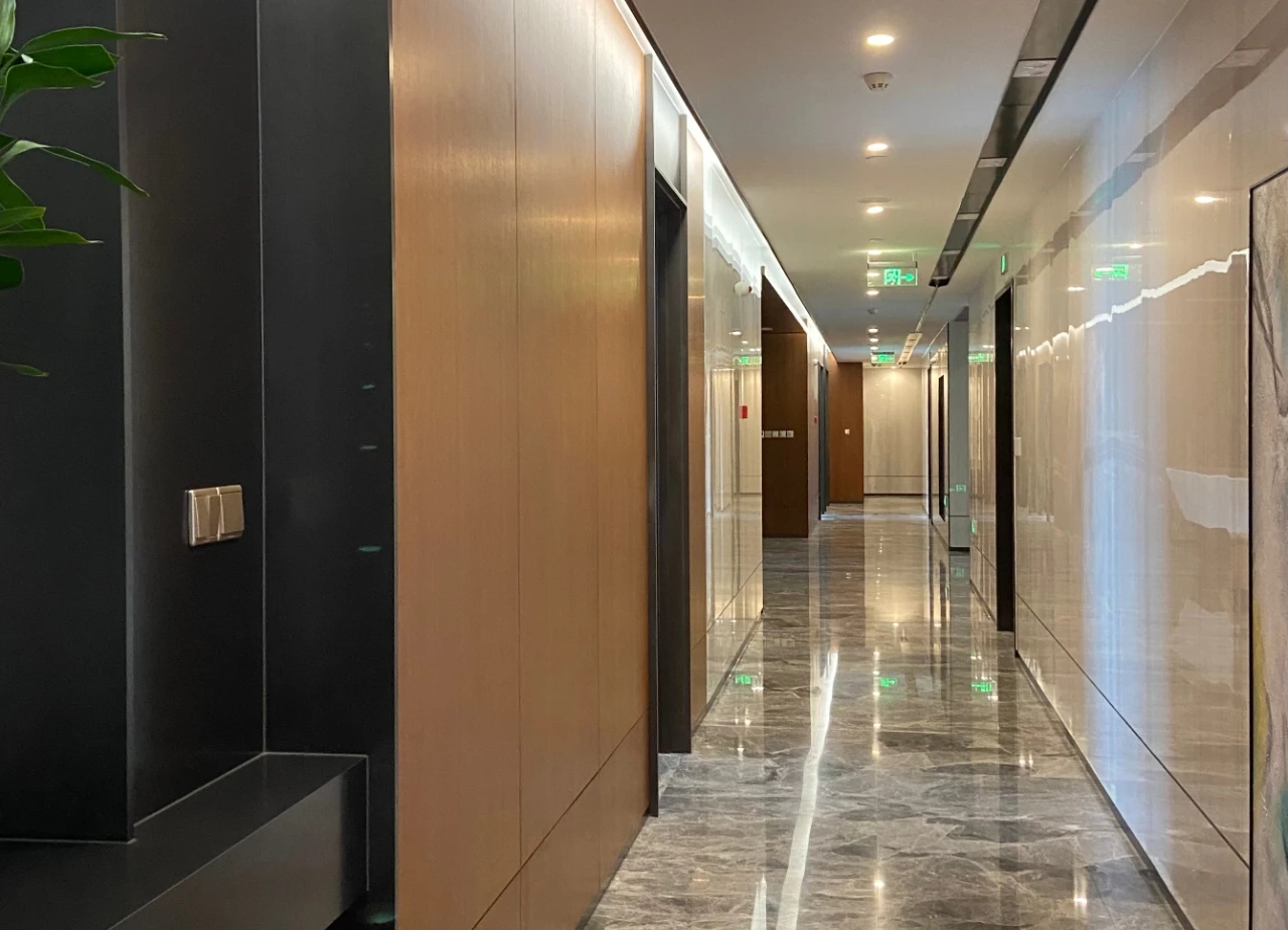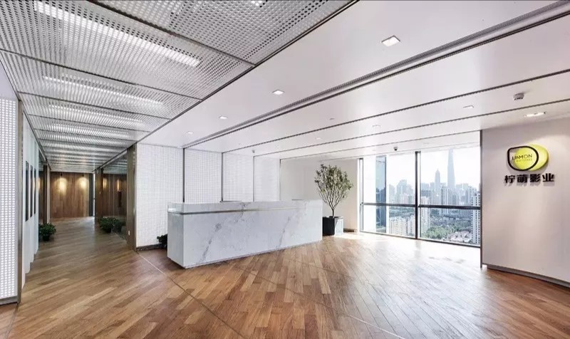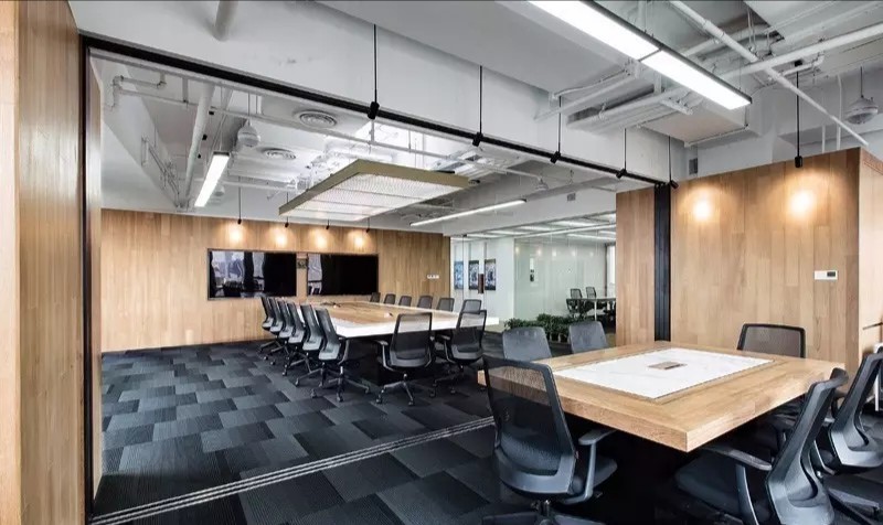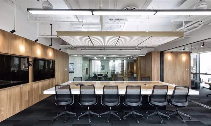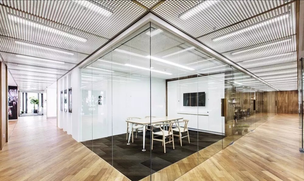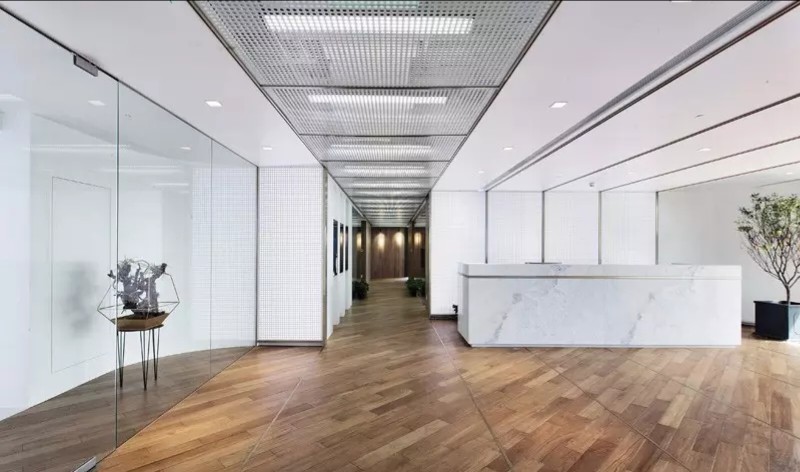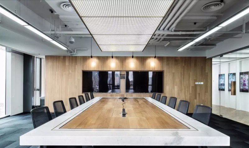 平面流线上基于核心筒居中的环形走廊展开,平面的一半为开放办公区,而另一半为高管办公及会议室,两个区块通过两个休息区衔接。大量木饰面的使用,提升了亲切感,墙地面材料均为实木复合地板错拼。环形走廊上部为穿孔铝板吊顶内藏灯带,导向性比较明确,同两侧的玻璃隔断形成戏剧化的反射效果。