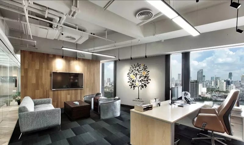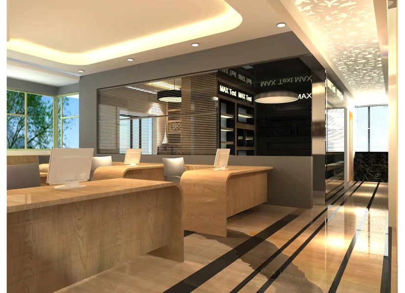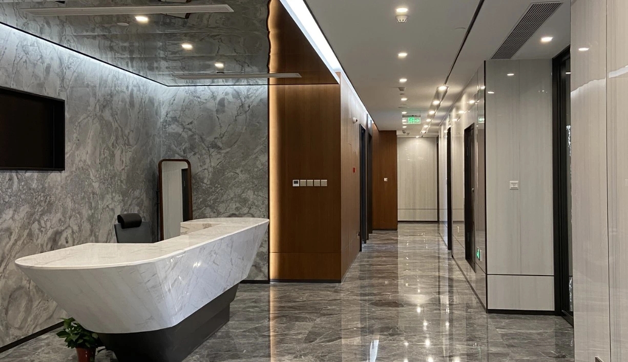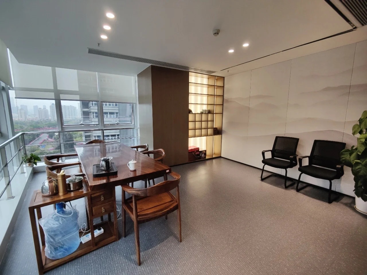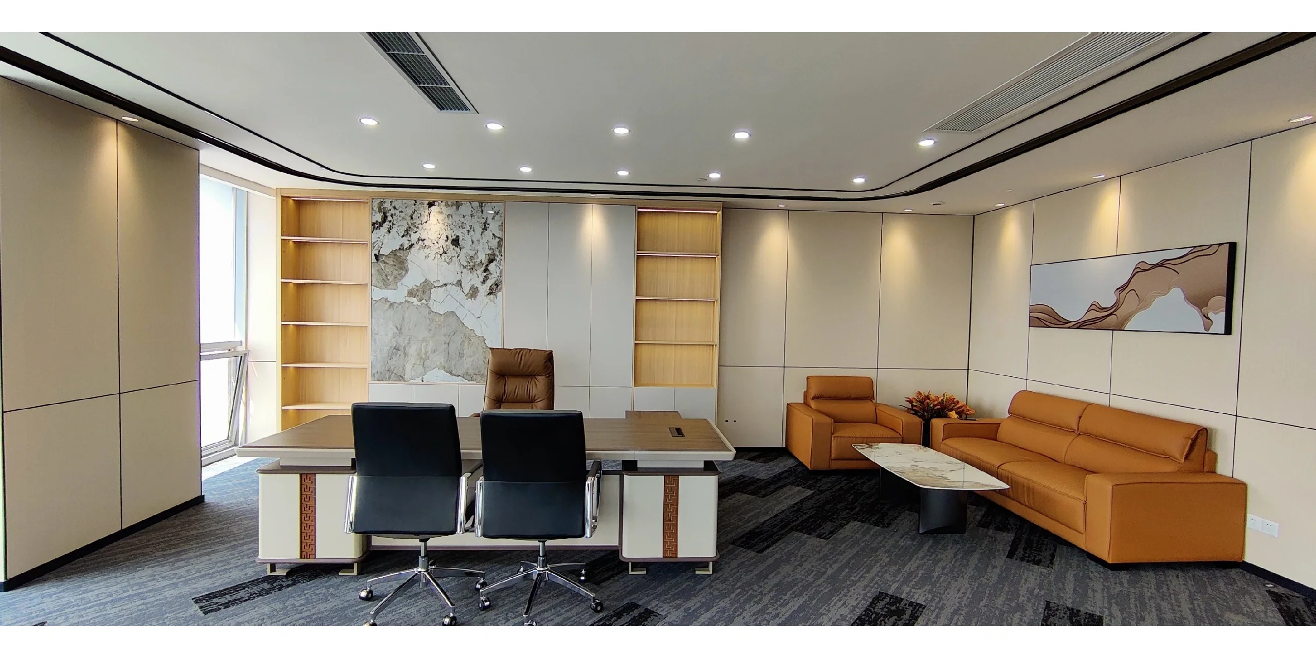 平面流线上基于核心筒居中的环形走廊展开,平面的一半为开放办公区,而另一半为高管办公及会议室,两个区块通过两个休息区衔接。大量木饰面的使用,提升了亲切感,墙地面材料均为实木复合地板错拼。环形走廊上部为穿孔铝板吊顶内藏灯带,导向性比较明确,同两侧的玻璃隔断形成戏剧化的反射效果。