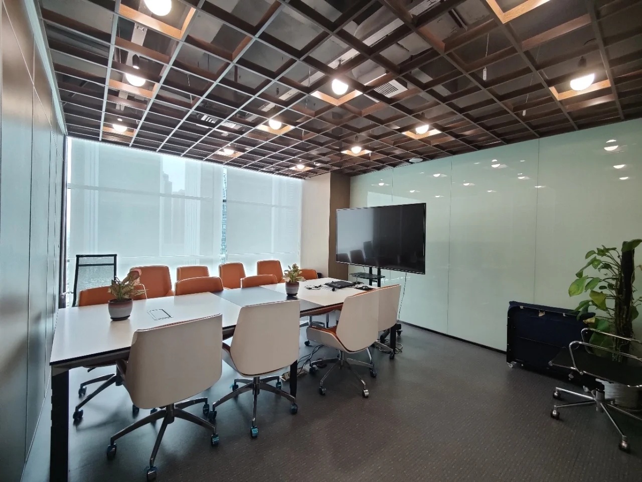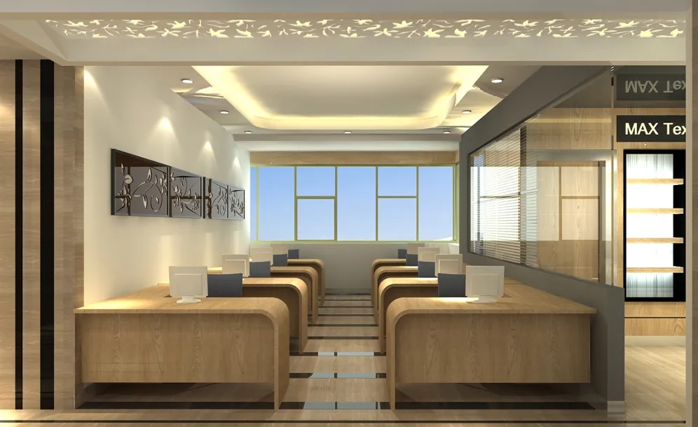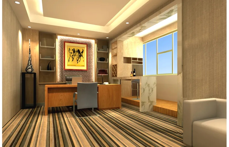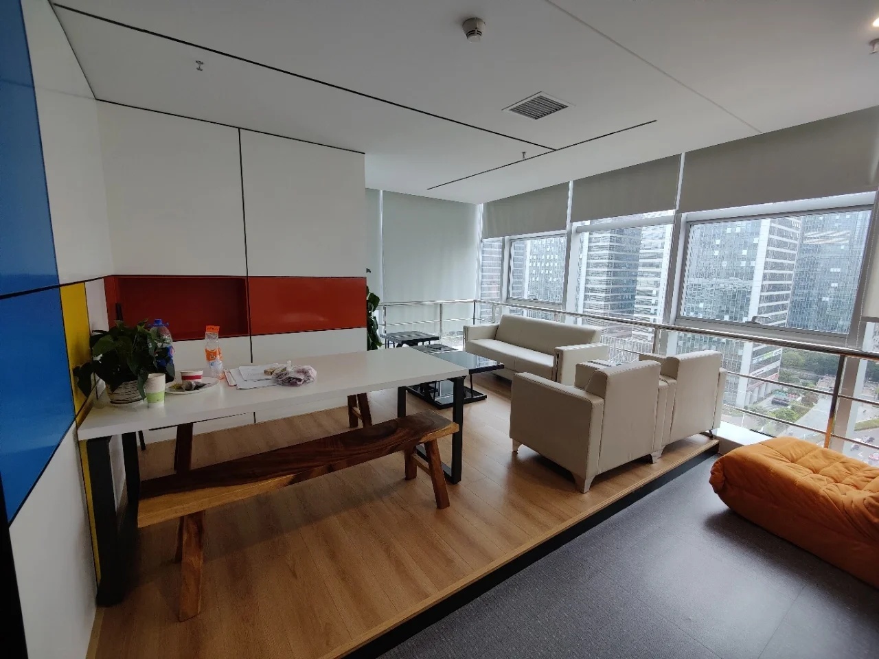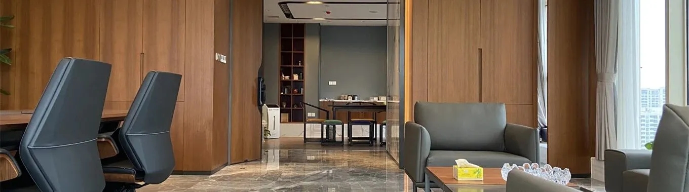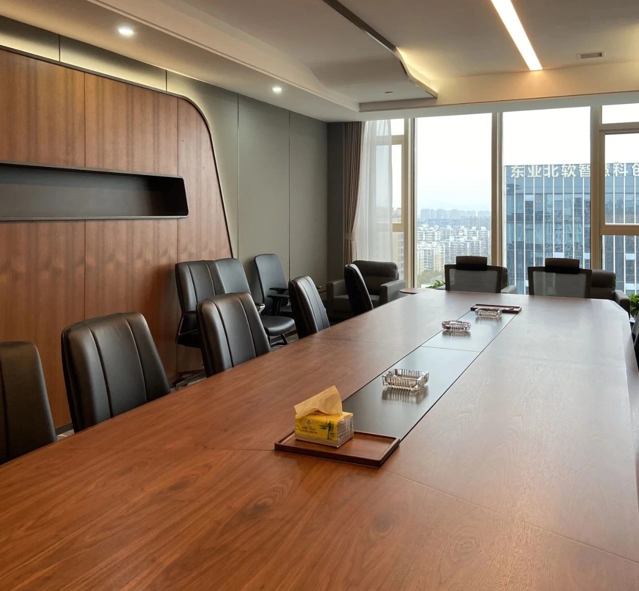 平面流线上基于核心筒居中的环形走廊展开,平面的一半为开放办公区,而另一半为高管办公及会议室,两个区块通过两个休息区衔接。大量木饰面的使用,提升了亲切感,墙地面材料均为实木复合地板错拼。环形走廊上部为穿孔铝板吊顶内藏灯带,导向性比较明确,同两侧的玻璃隔断形成戏剧化的反射效果。