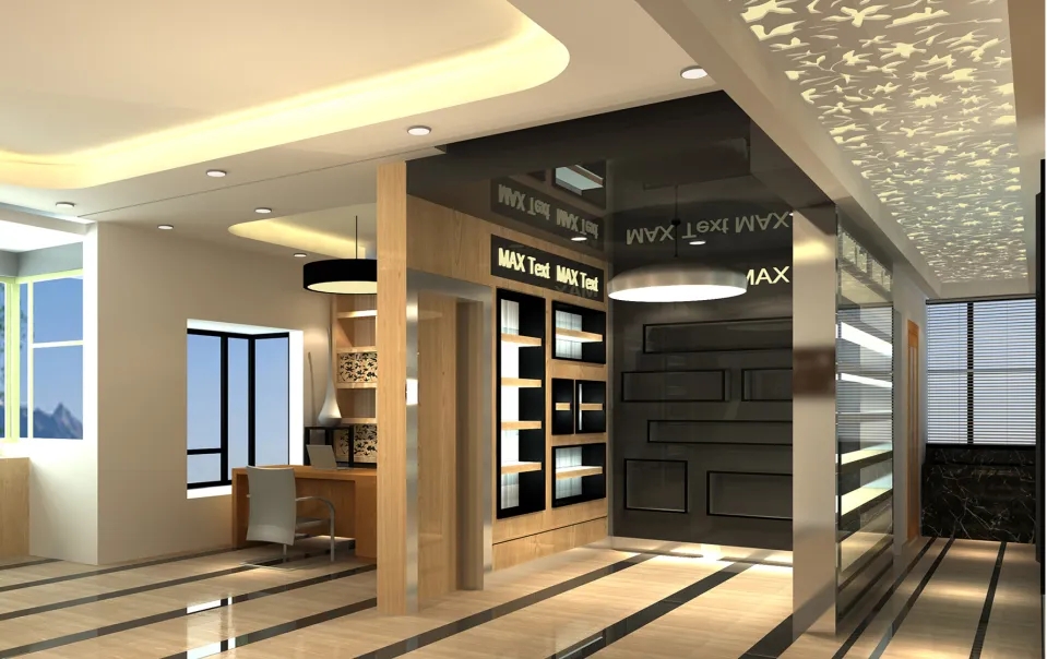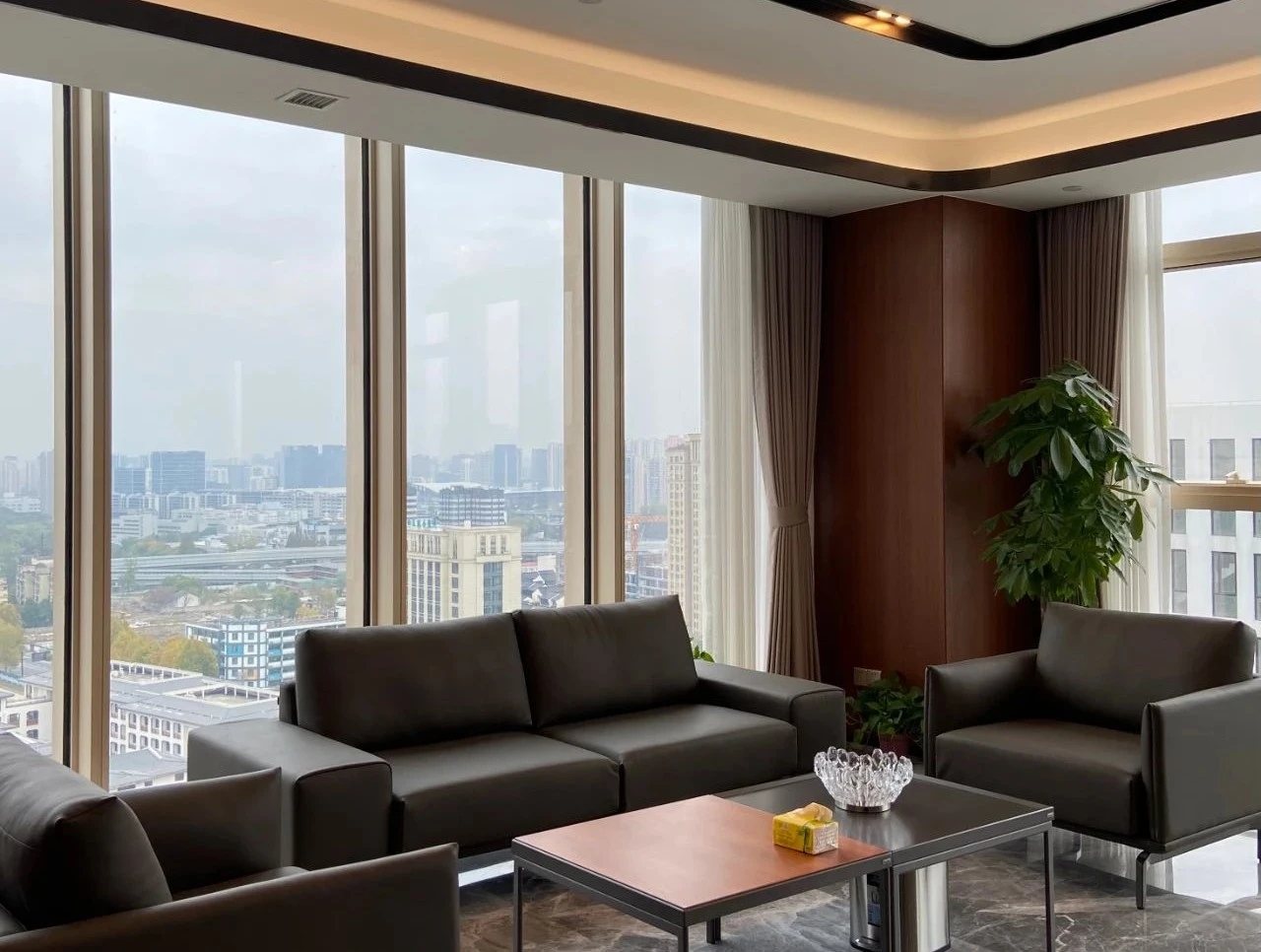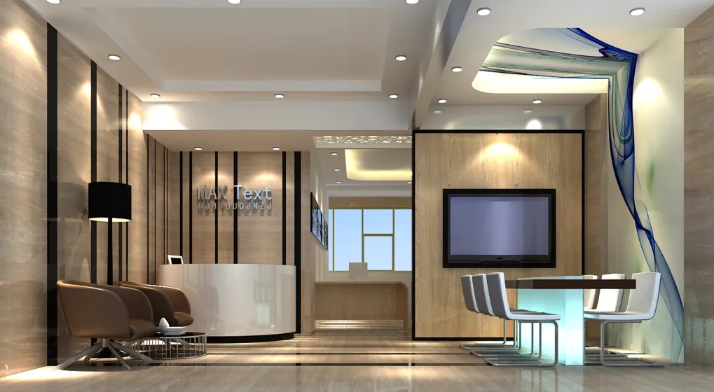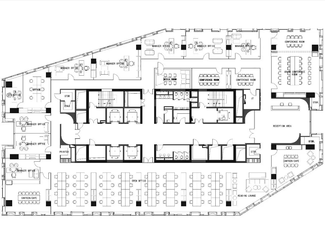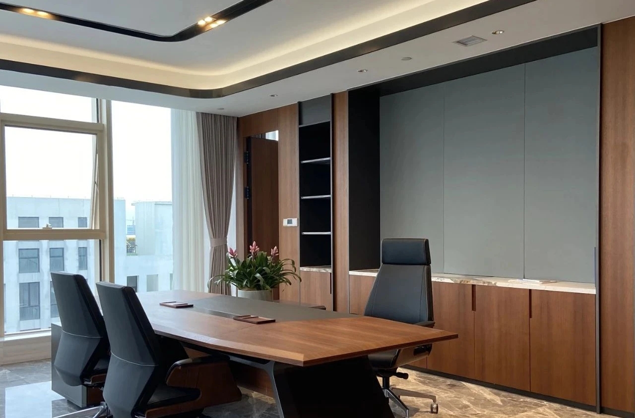 平面流线上基于核心筒居中的环形走廊展开,平面的一半为开放办公区,而另一半为高管办公及会议室,两个区块通过两个休息区衔接。大量木饰面的使用,提升了亲切感,墙地面材料均为实木复合地板错拼。环形走廊上部为穿孔铝板吊顶内藏灯带,导向性比较明确,同两侧的玻璃隔断形成戏剧化的反射效果。