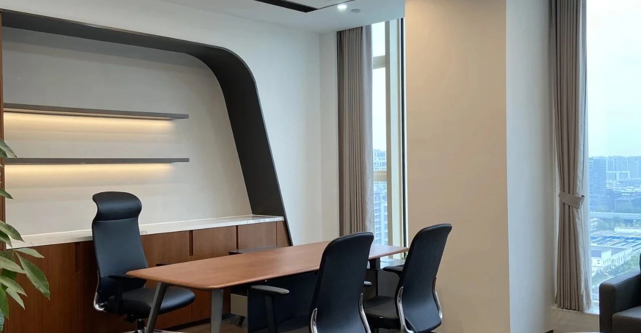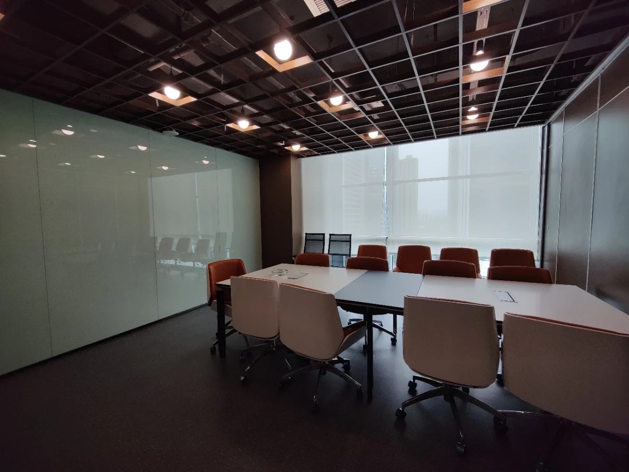 然而,场地呈狭长的“凸”字形,因此最要紧的任务是如何利用这个并不宽敞的地方,满足如此多的功能要求。我们构思了一组空间分隔的装置,以此代替封闭的隔墙,这样既可以对空间流线进行隔断、阻拦,又不为本身就狭小的空间再“添堵”,保持了原有的开放性。两个通高的柜体划分了16人办公位的对内区域和多功能共用的对外区域。同时,围绕对外区域的部分,我们又在另一侧布置了窗帘轨道,可以轻易地通过窗帘的拉动,改变空间的封闭或开敞。清晰的动静区域的划分,让办公位上的员工完全不受他人的影响。多功能区域宽敞舒适,成为大家常常互动和交流的场所。