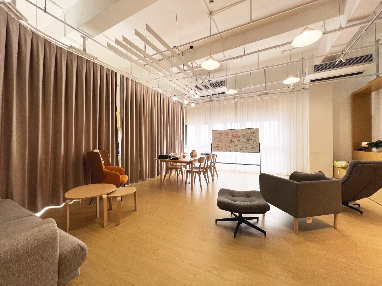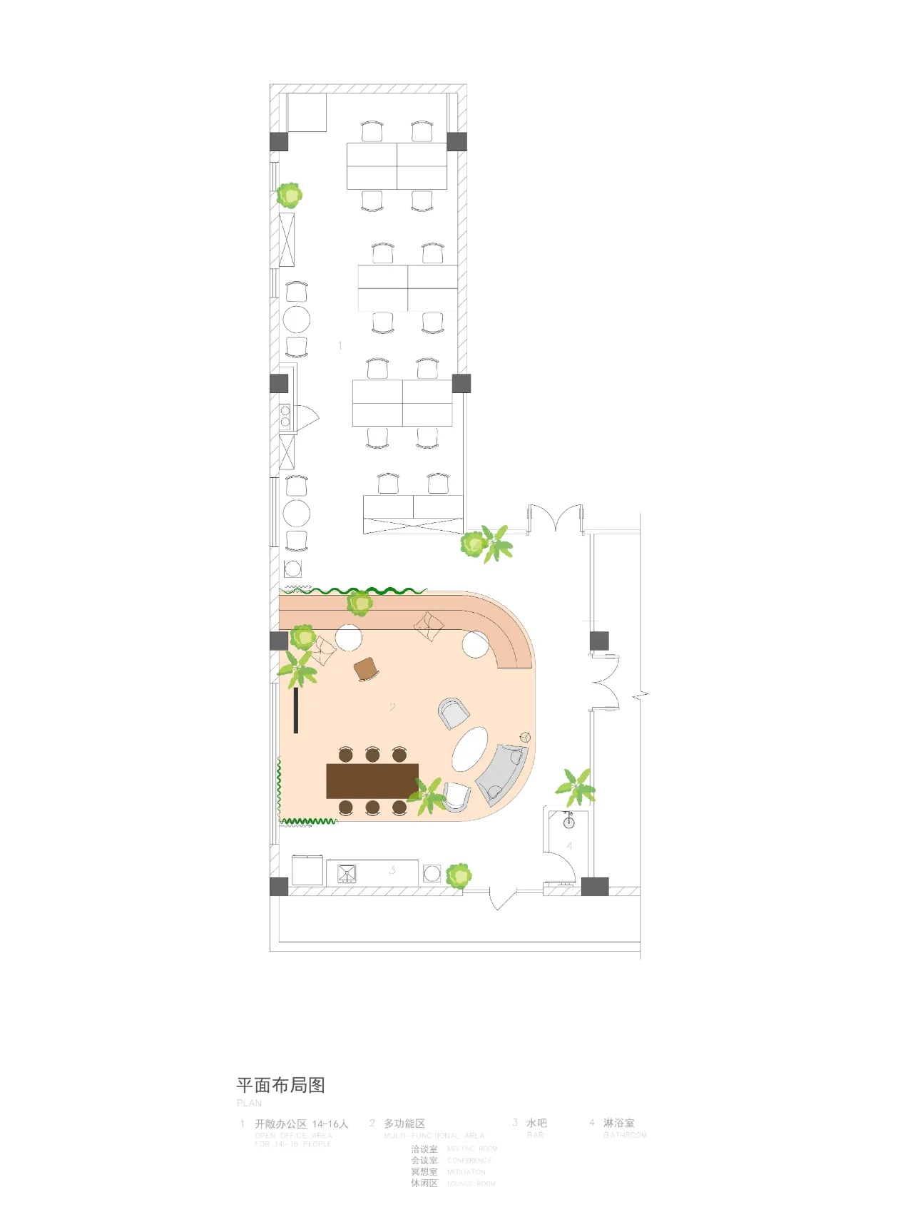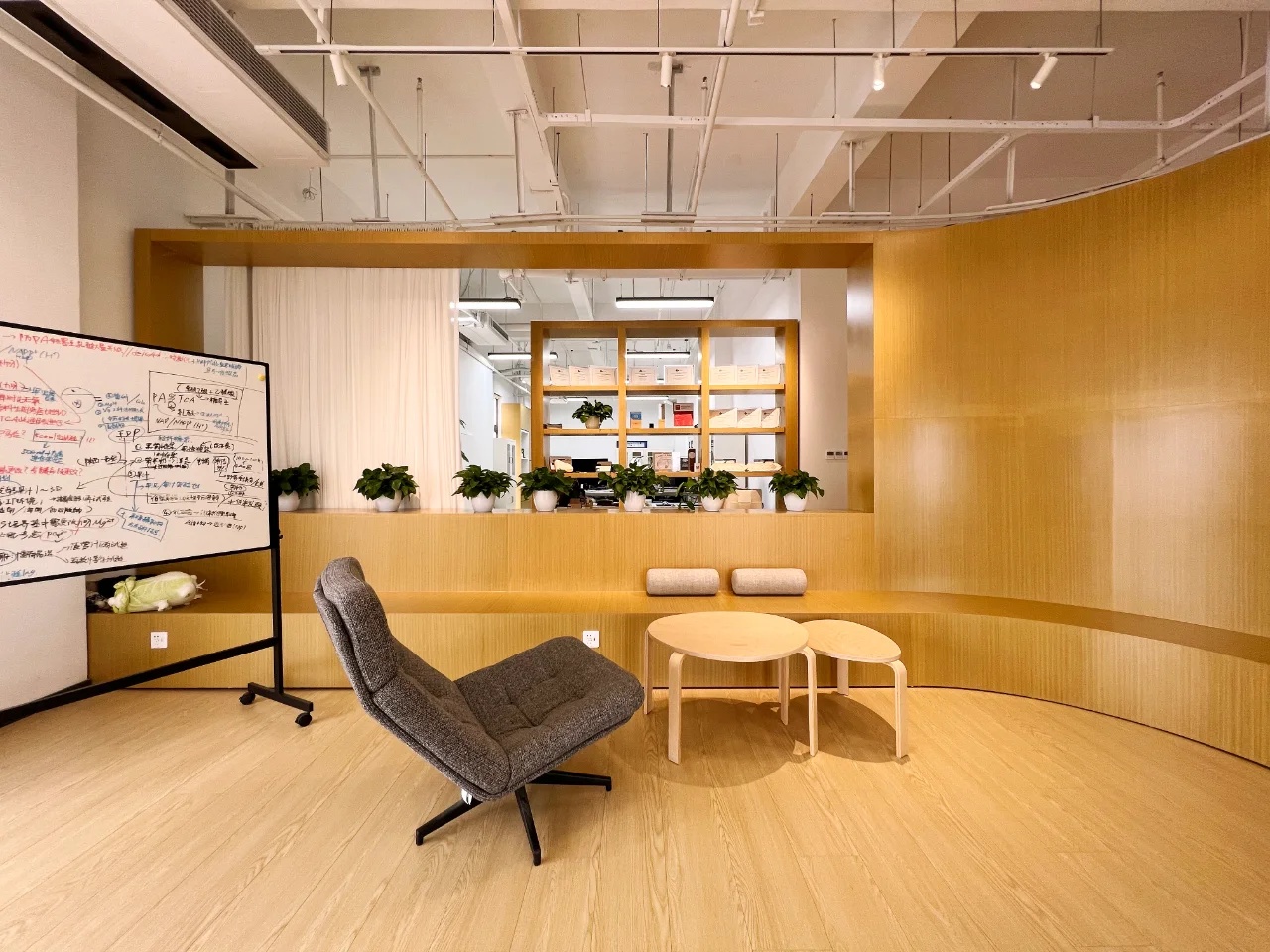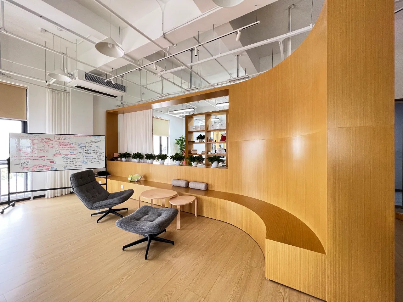 项目业主Synmetabio贻如生物科技是一家由三位年仅二十出头的年轻创业者成立的初创公司,这里是他们成立公司的第一个办公空间。项目整体包括一个约300㎡的实验室,和约130㎡的办公区,我们负责的便是后者。在一个仅有130㎡的空间内,业主提出需要14-16人办公位,同时还要提供对外洽谈的空间、宣讲的空间、会议的区域、员工休息的水吧、甚至包括“可供大家一起头脑风暴的冥想空间”。