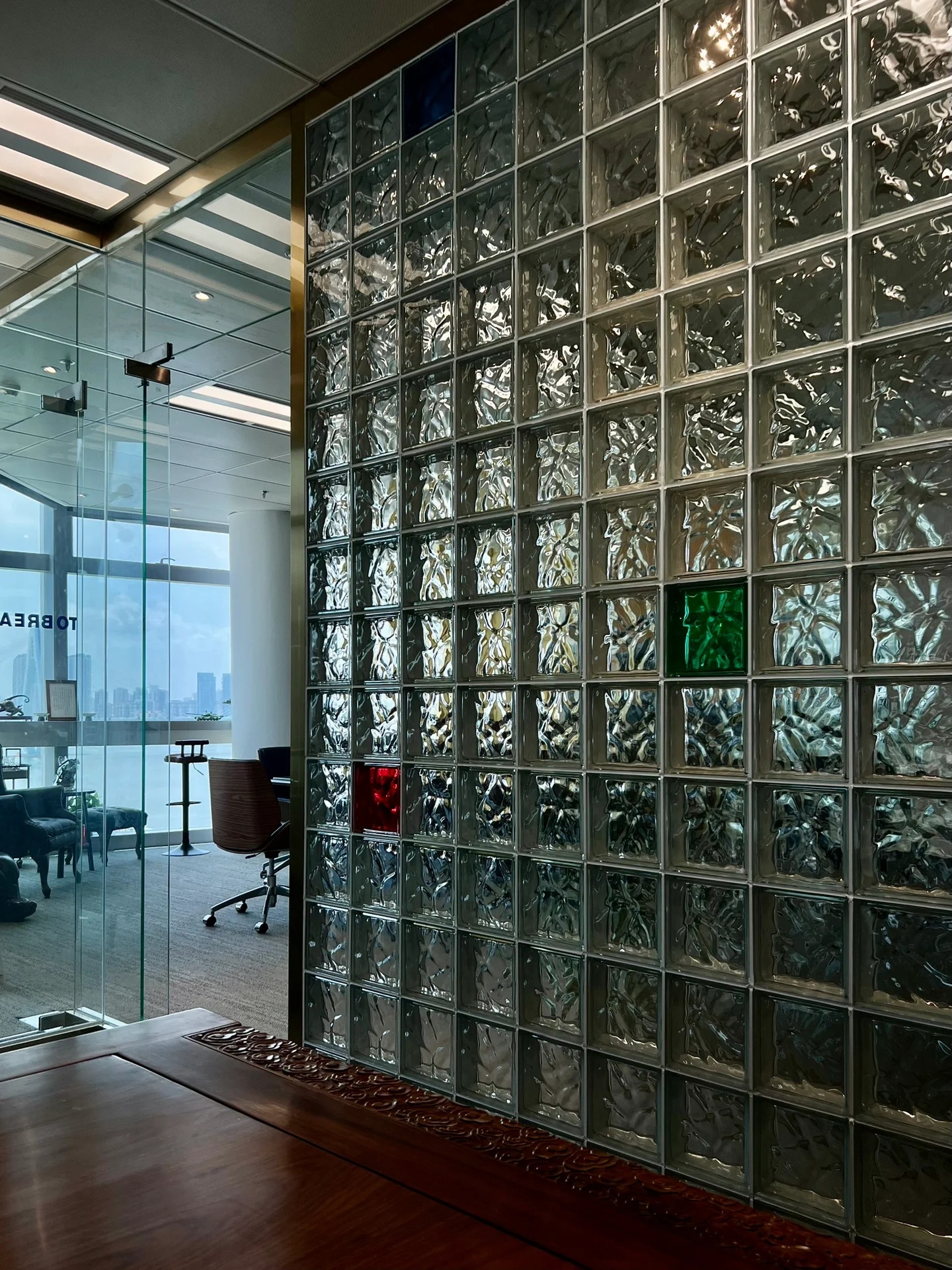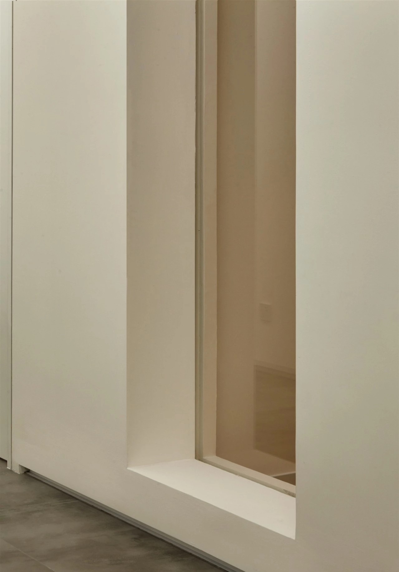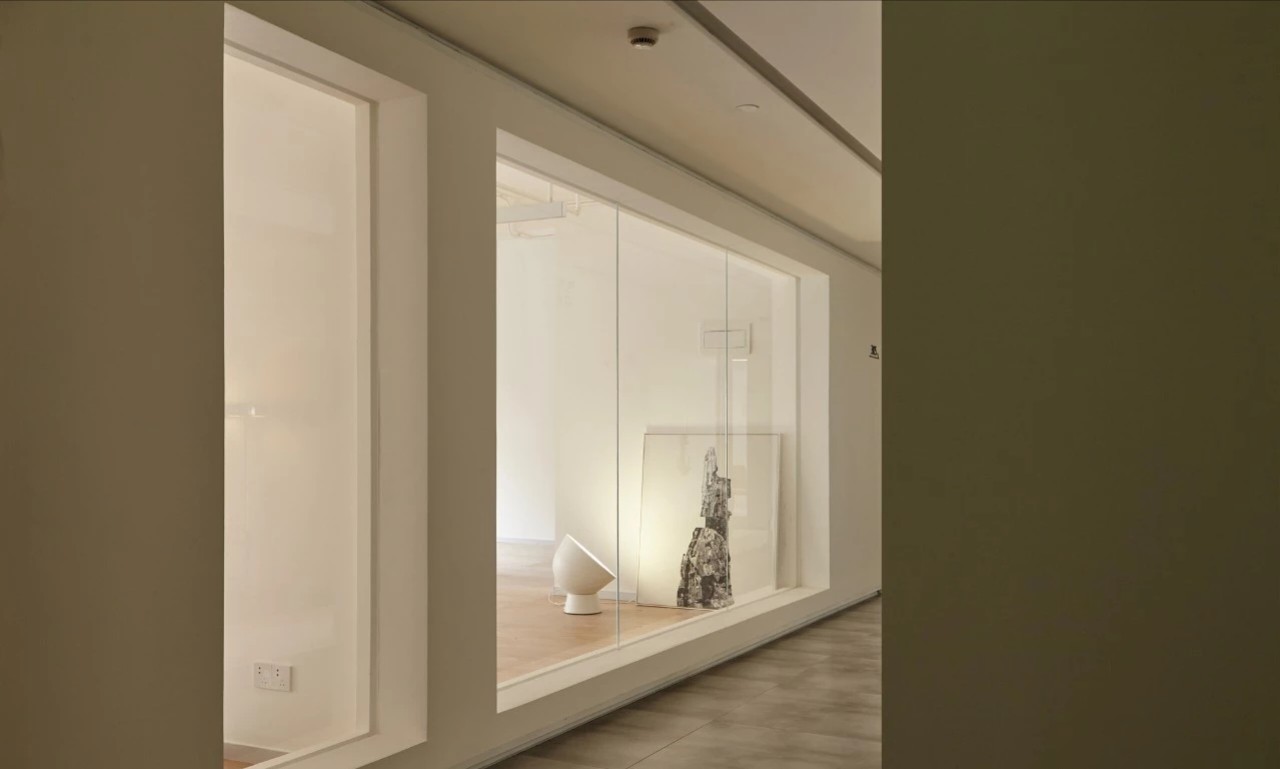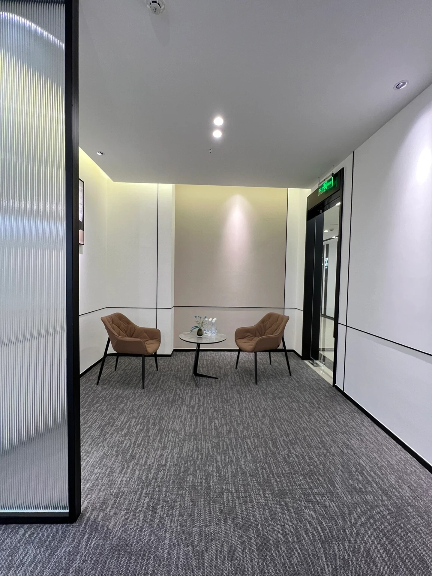 墙面材料使用了超白磨砂烤漆白玻,同soho内大量使用的烤漆白玻形成呼应、却又更加柔和,从电梯厅空间的高反射,过渡到前台接待区的温和低反射。