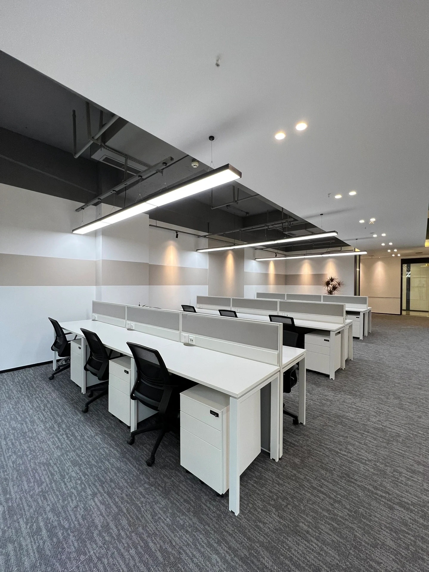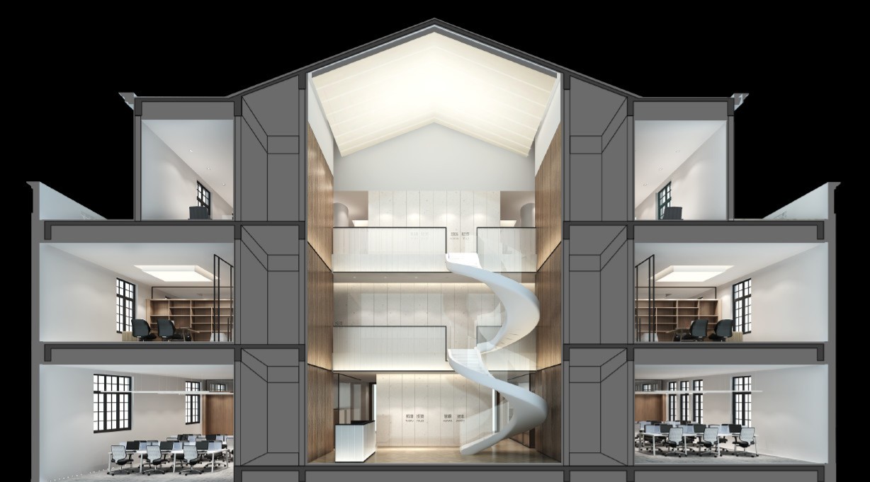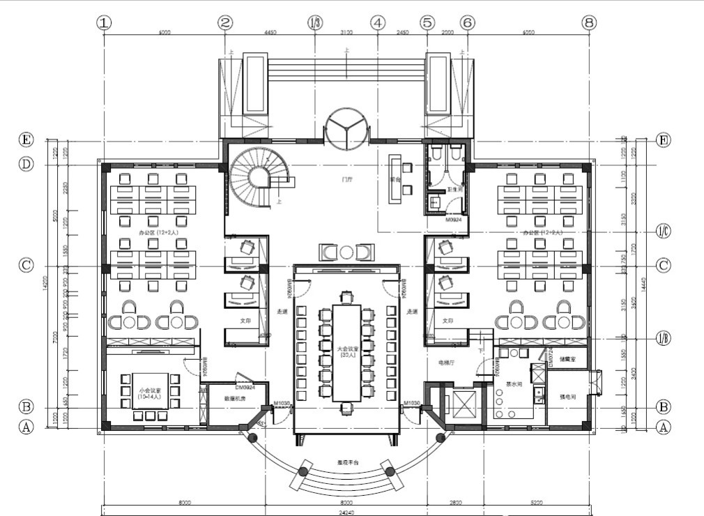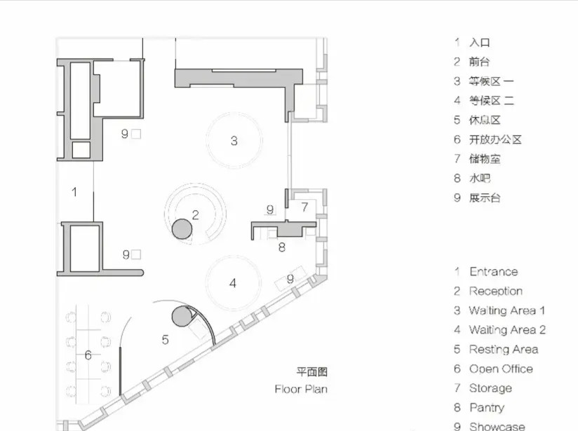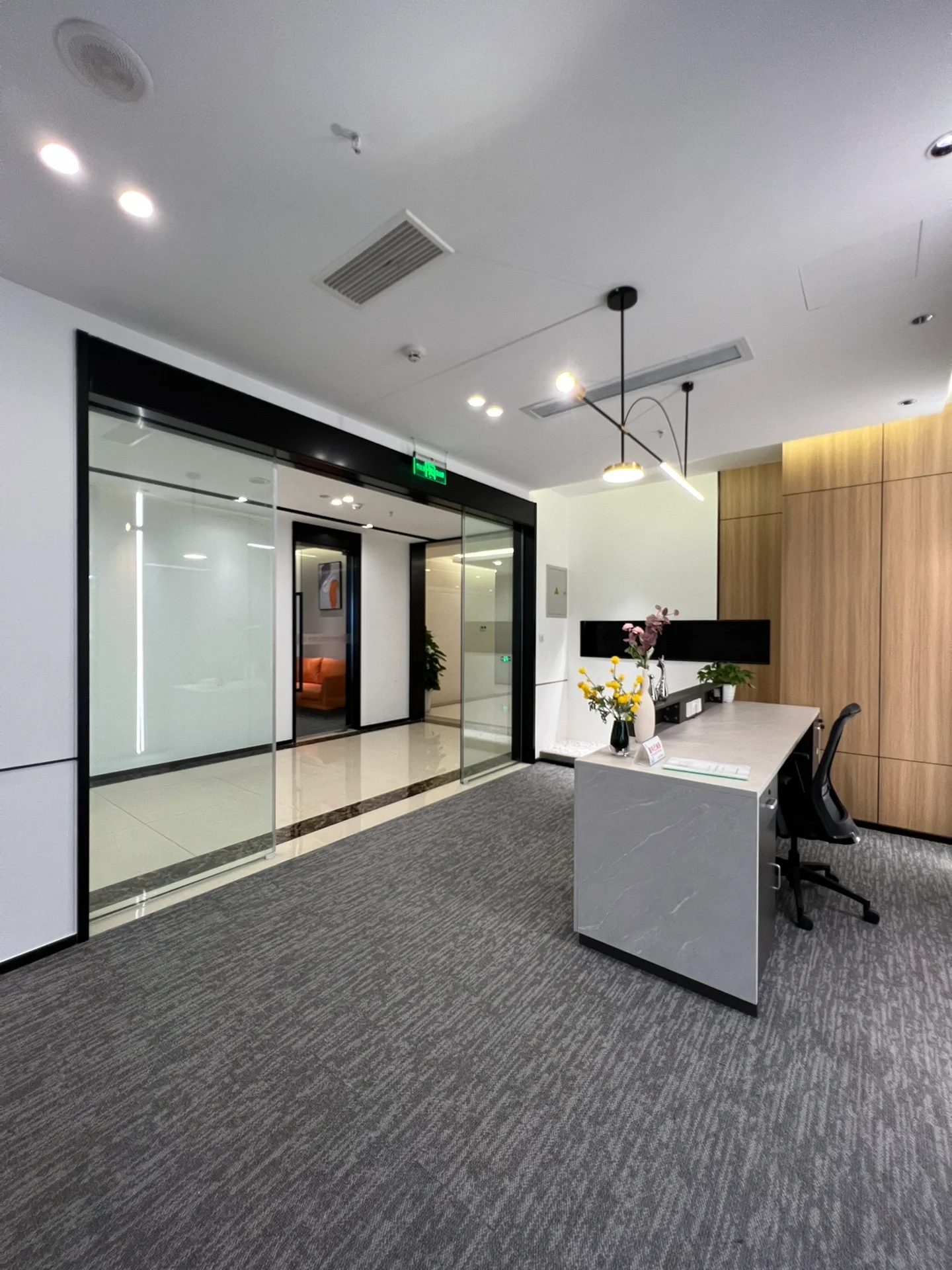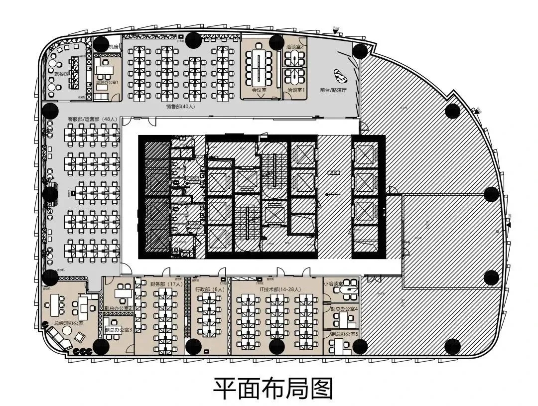 了解两个公司的需求之后,平面功能布置上采取了“左中右”的结构,既左右为两个公司各自的使用空间,中间为共享空间、如大会议、前台等候区等。