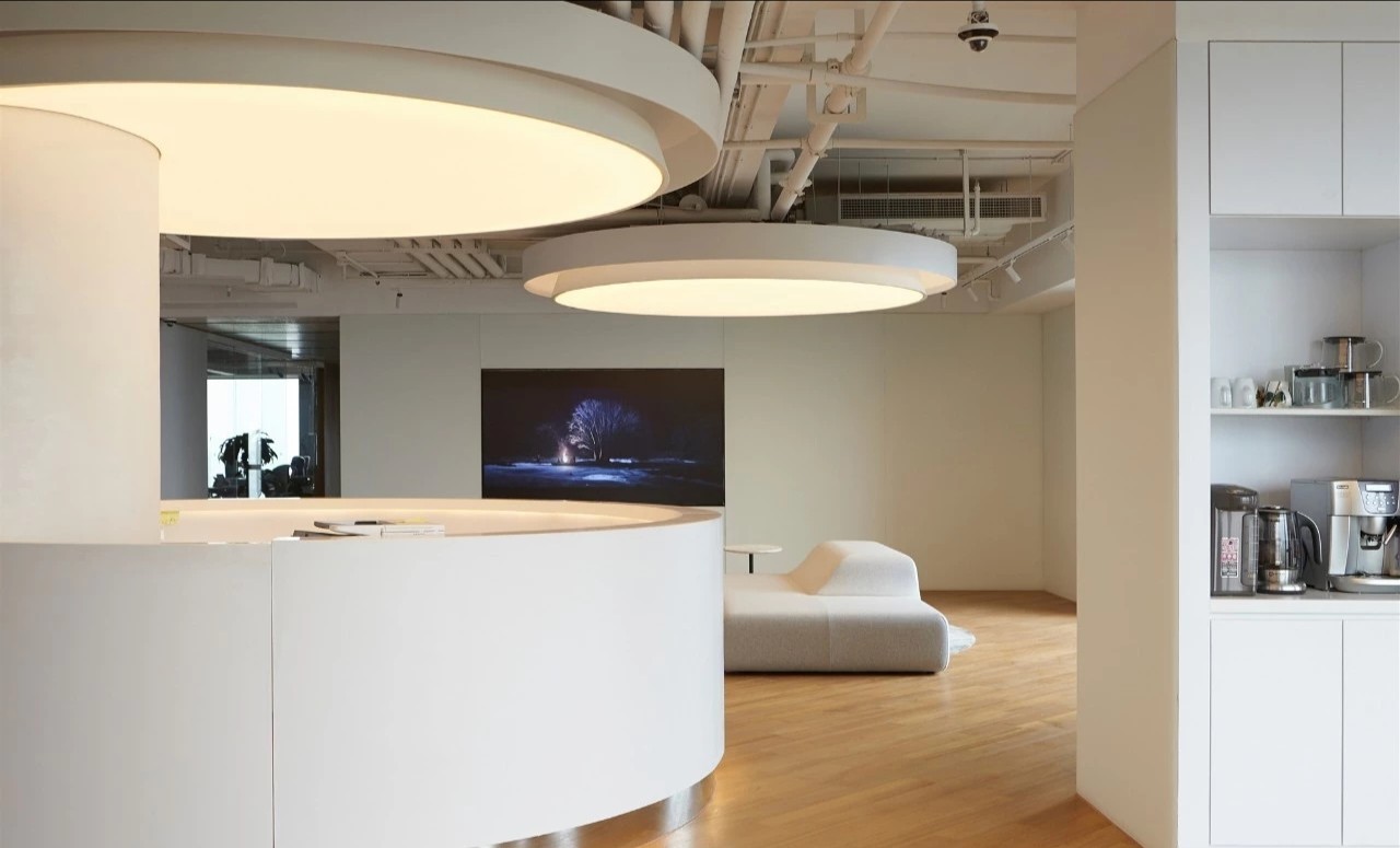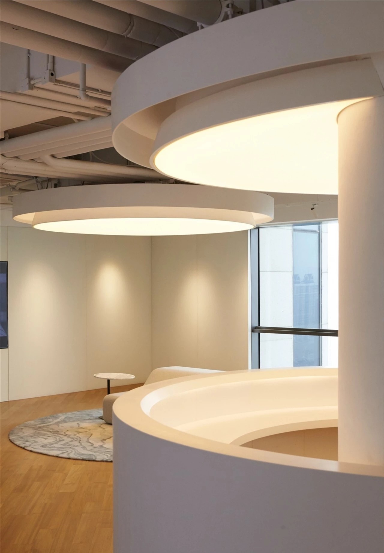 相比改造前的前台,本次设计引入了曲线的元素,两处圆形定制地毯和大面积软膜天花定制灯具的组合,再辅以环型前台和顶部的灯盘,让整个接待区照明更为柔和。