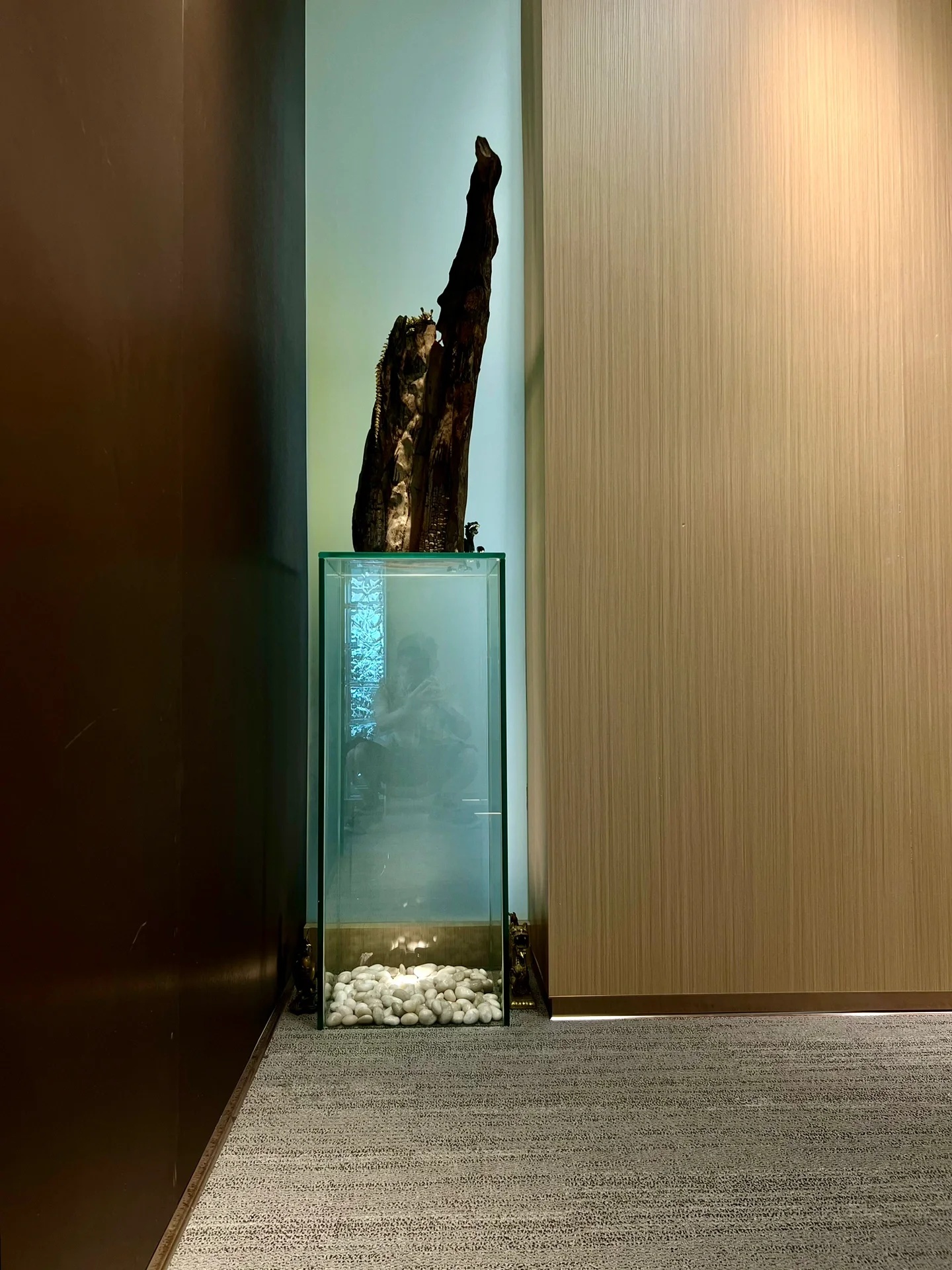 旋转楼梯的另一侧是前台及两层高的木饰面墙,整个中庭上部设计了一个巨大的软膜天花照明,给整个前台提供了柔和的照明。前台本身也是用内衬LED的玻璃体围合,目的是匹配整个空间的纯净白亮的效果。黄杨木饰面、橡木人字拼地板和米色的洞石,这些偏暖的材质平衡了白色涂料和玻璃营造的冷色调。