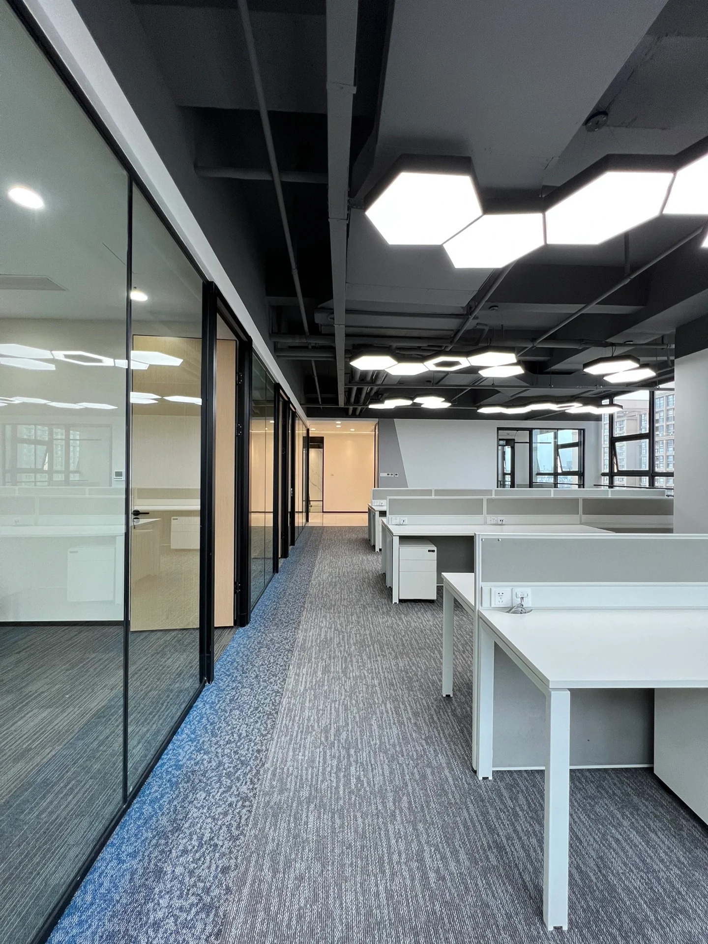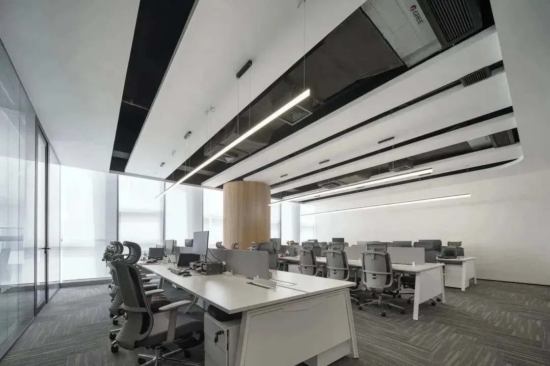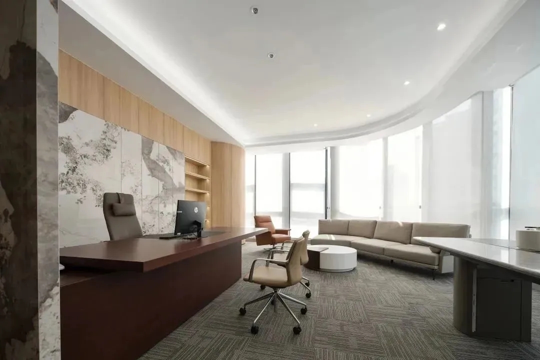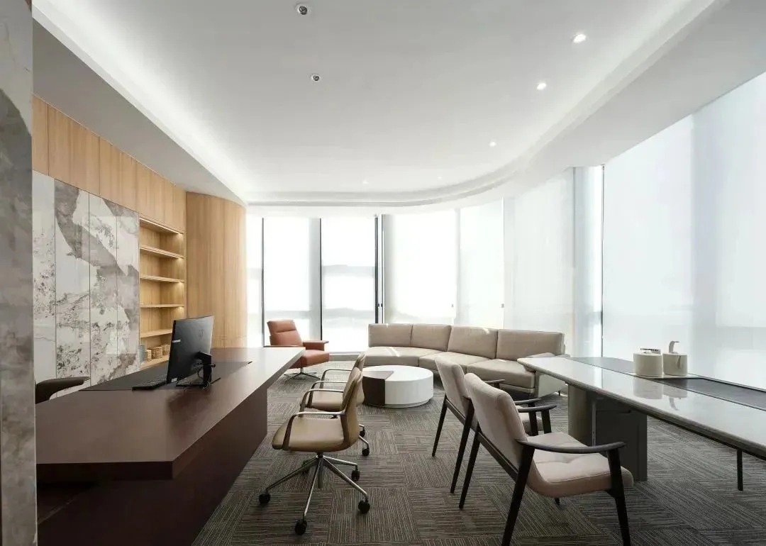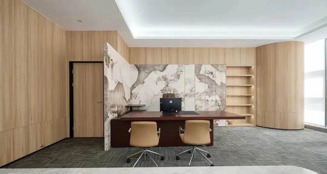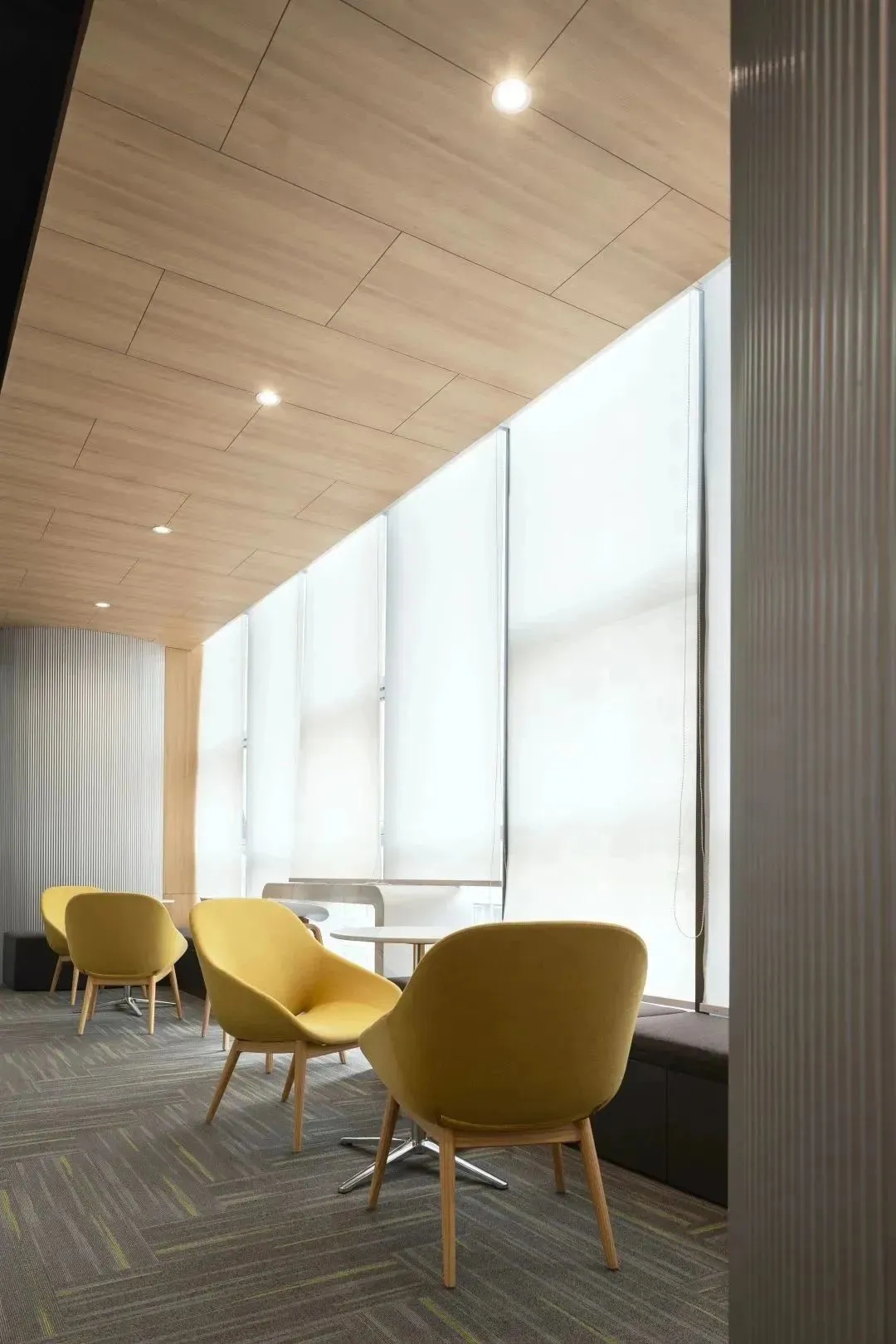 顶面采用浅色木饰面做装饰,搭配灰色系地毯以及黑色系办公家具,整个空间搭配出来的感觉非常稳重和大气.
