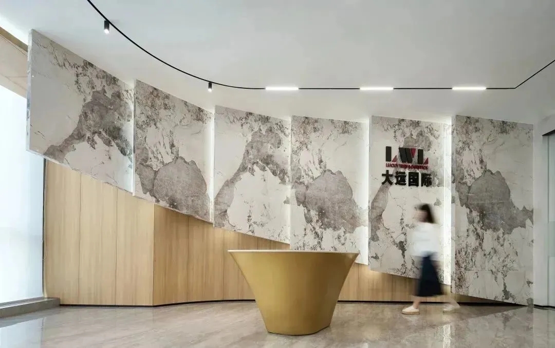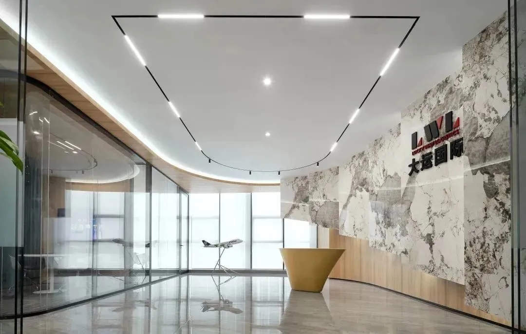 公司前台接待区,我们以飞机上升的机翼形态,设计了一个步步往上盘旋姿态的前台背景,既是模仿飞机起飞状态的机翼,也预示着公司步步高升的含义,此为“开门行大运”,即“开运”.