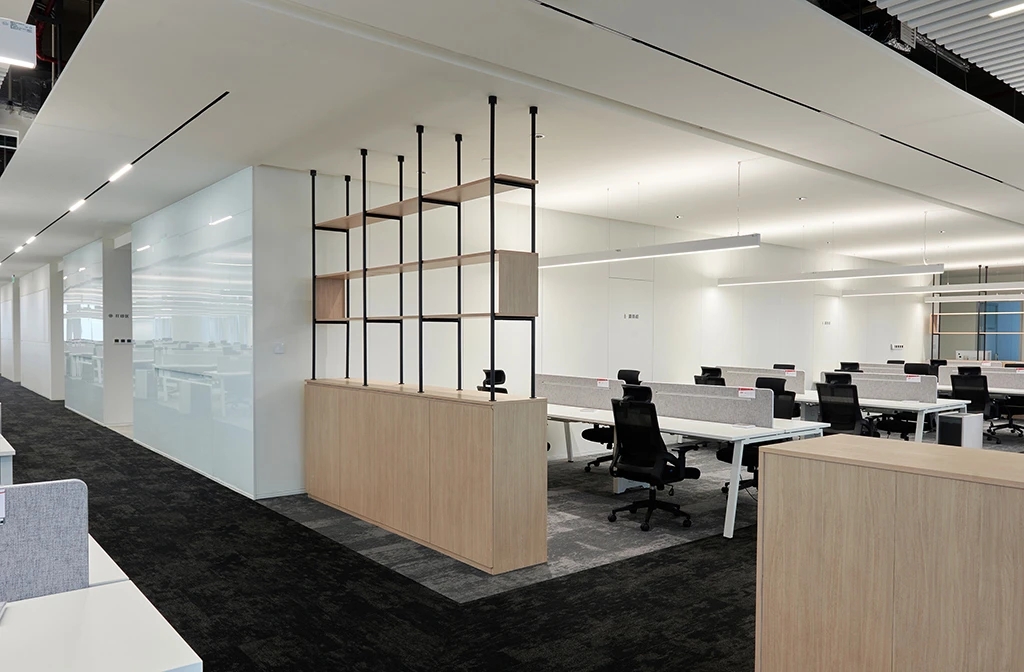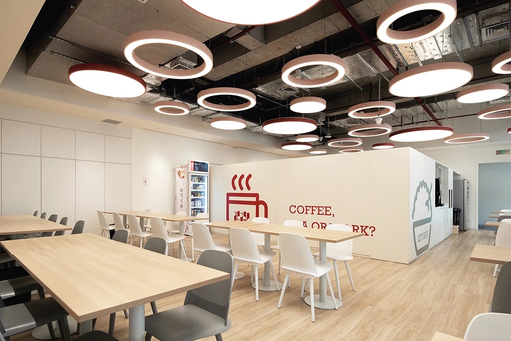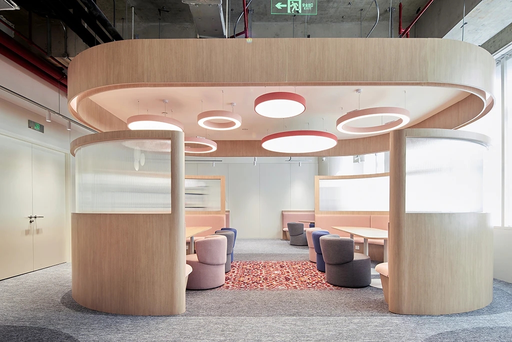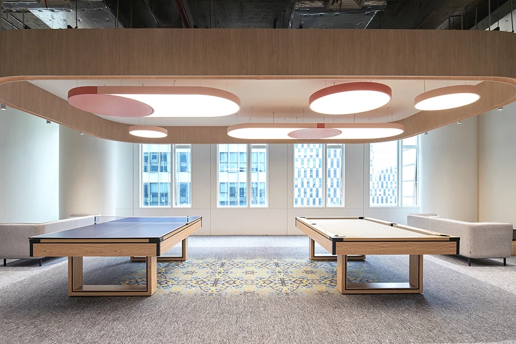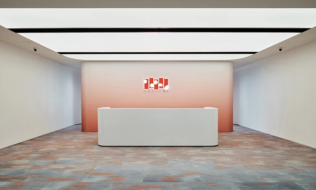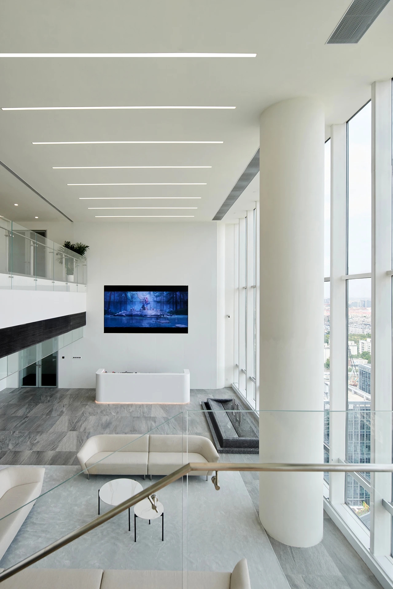 在灯光设计上,南面挑空大堂增加了局部灯带设计营造暖度,呼应了叠纸LOGO的同时,保持了南面挑空大堂的简约氛围。
