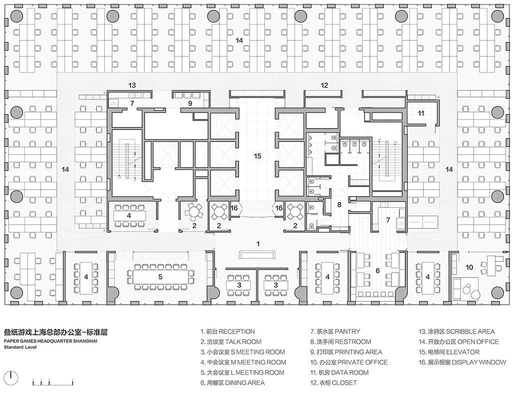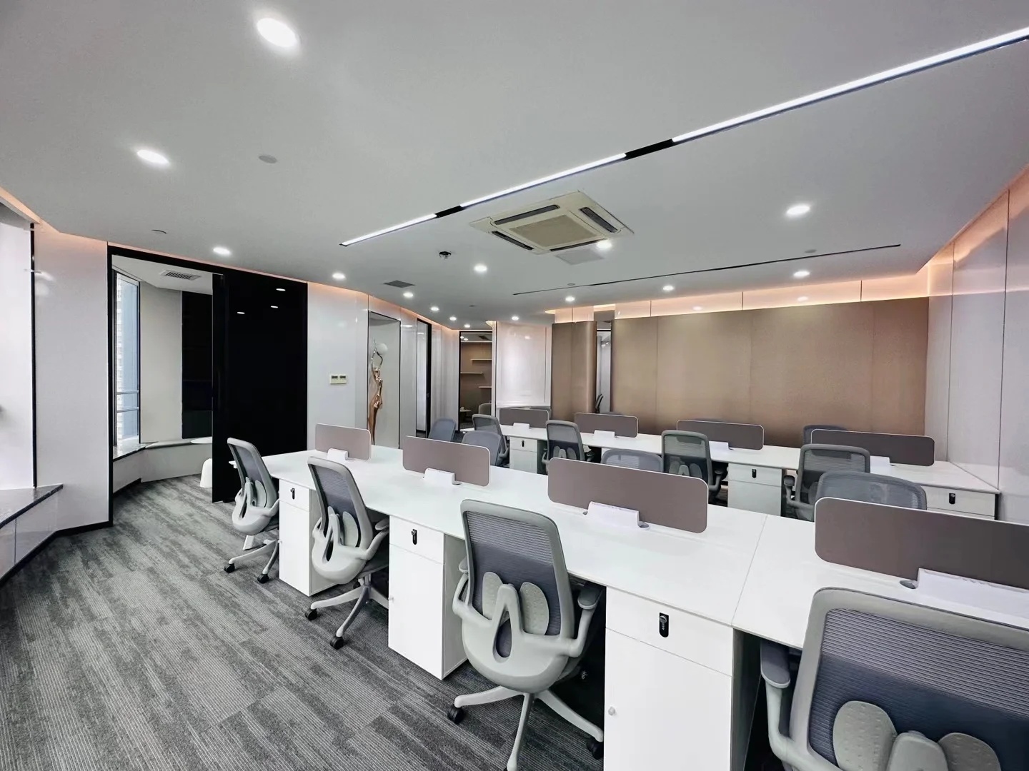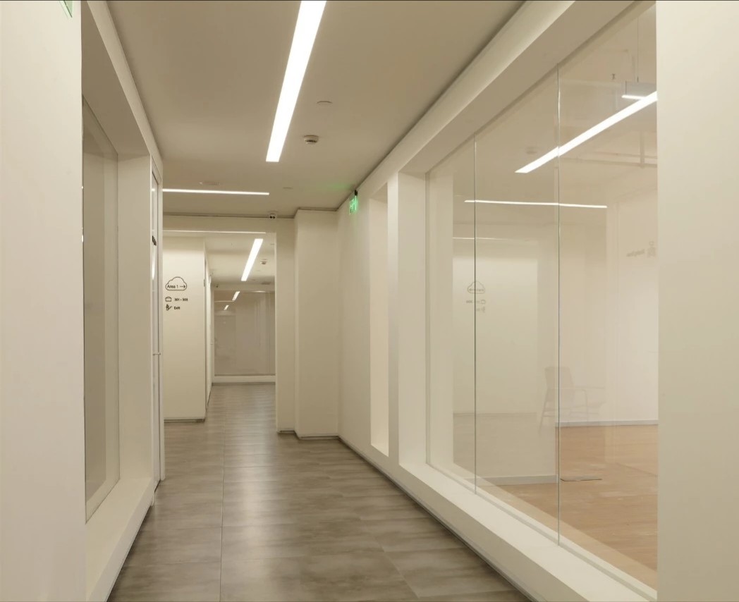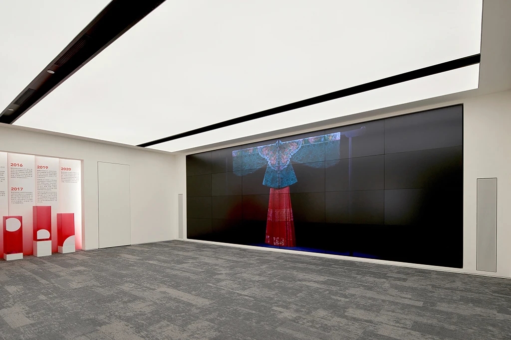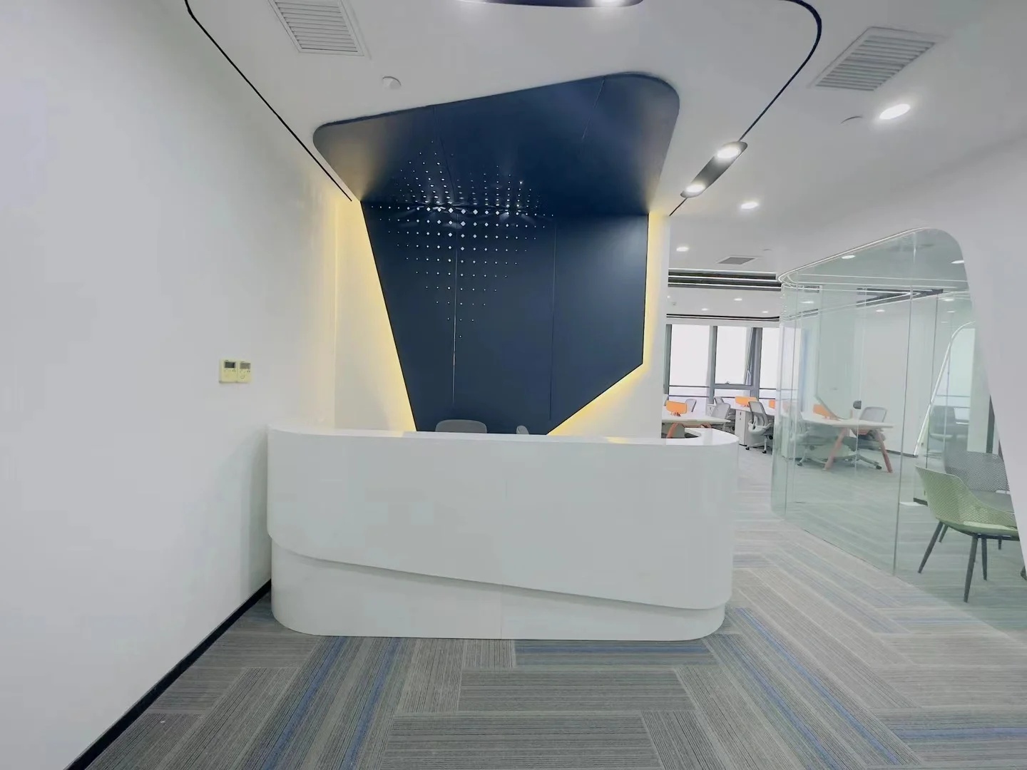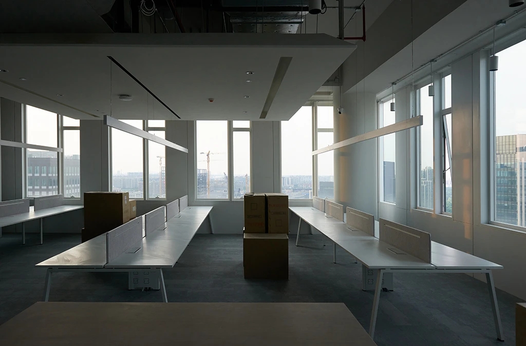 在灯光设计上,南面挑空大堂增加了局部灯带设计营造暖度,呼应了叠纸LOGO的同时,保持了南面挑空大堂的简约氛围。