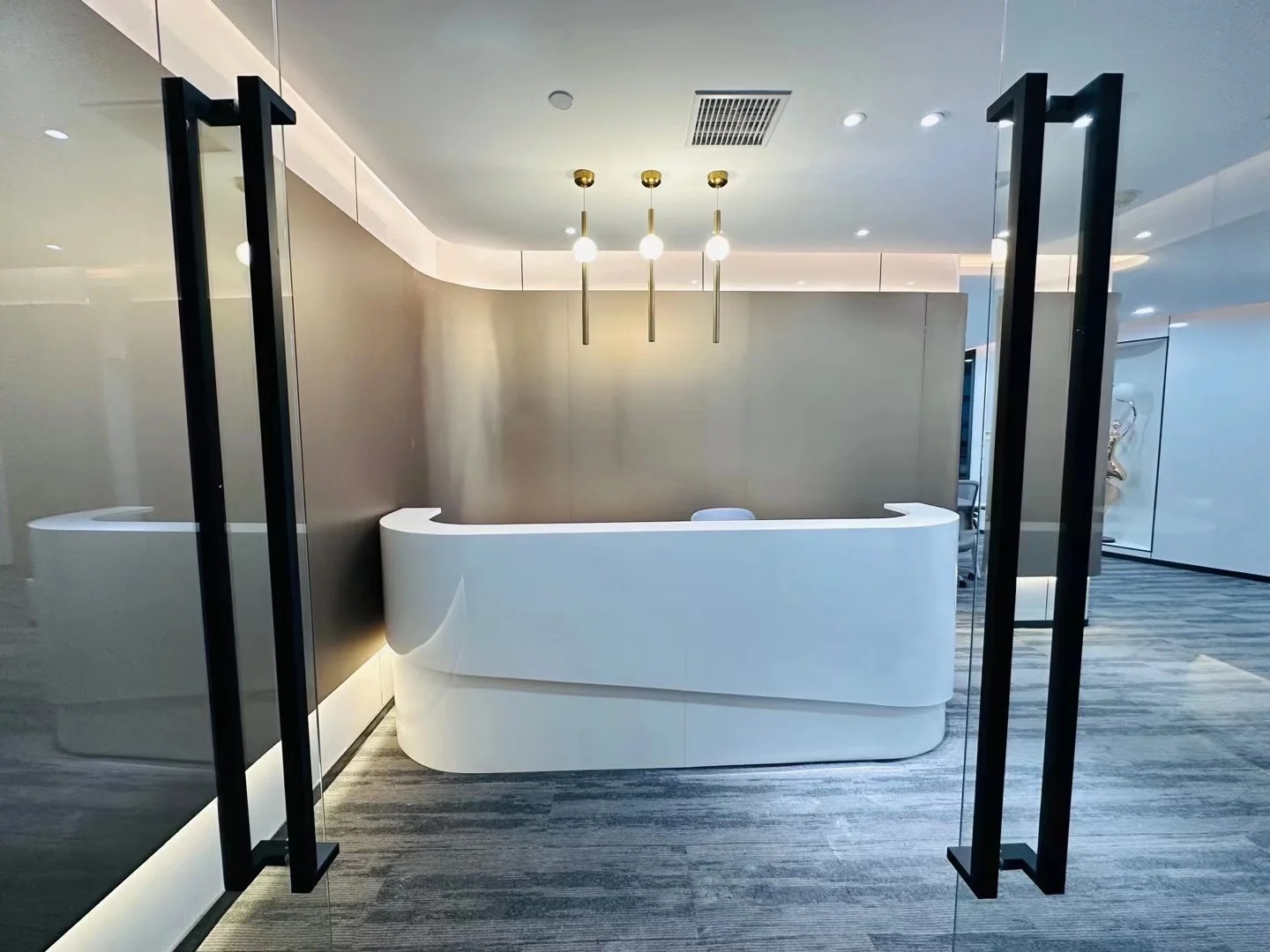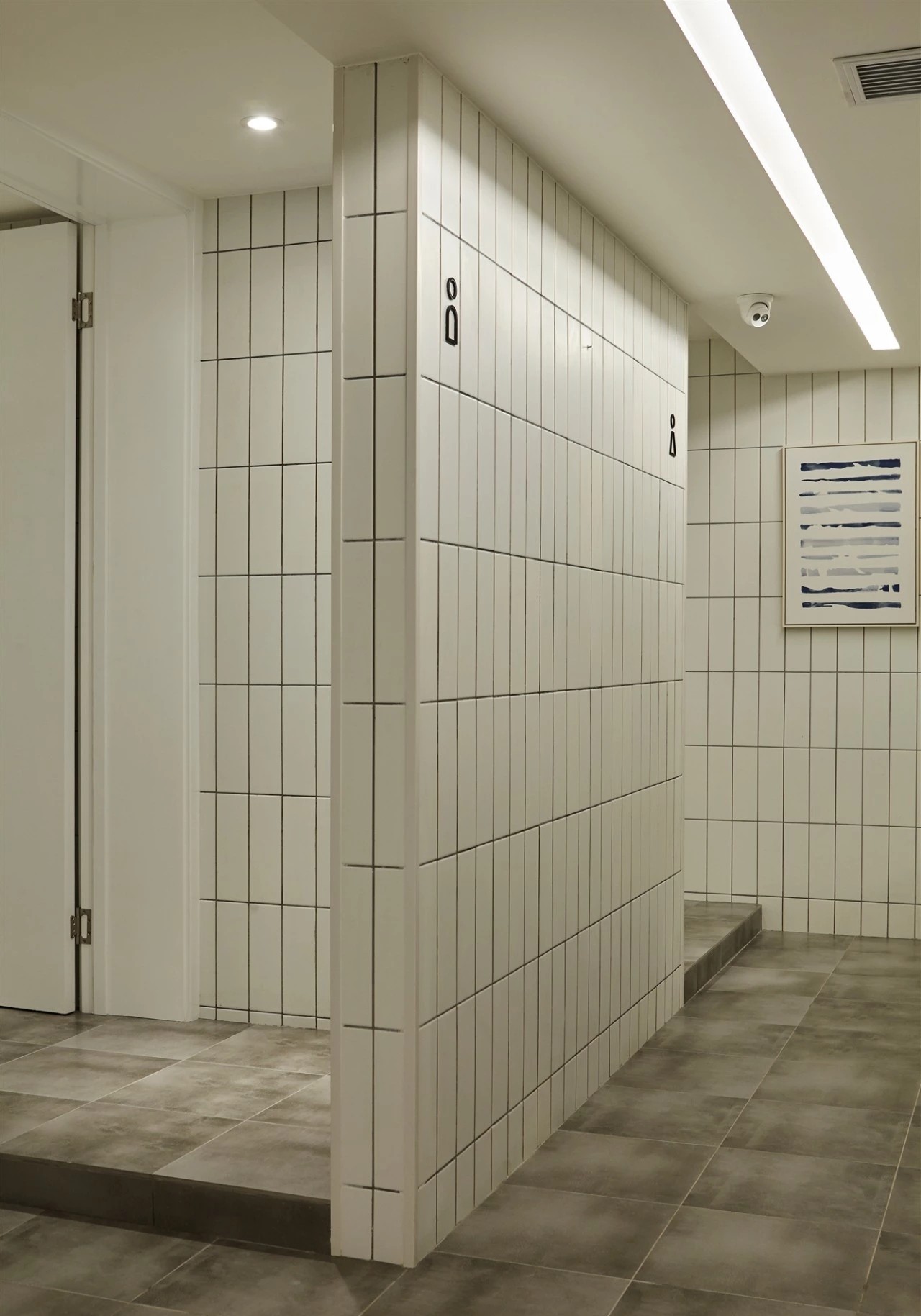 大堂选材与配色简约,以白灰色调为主,灰砖、米白贴膜与白色人造石的搭配,不拘泥于印象中的粉色,同时彰显了品牌的气质与未来发展的多元性。