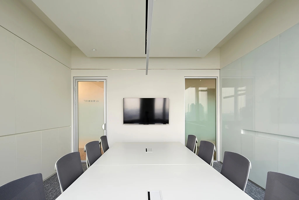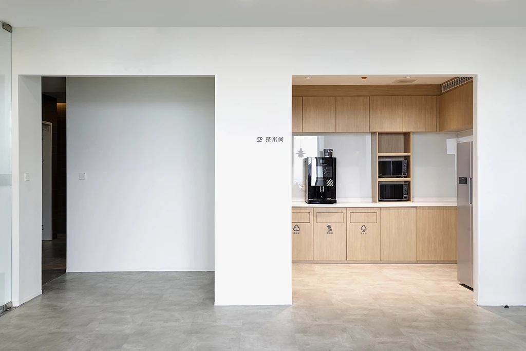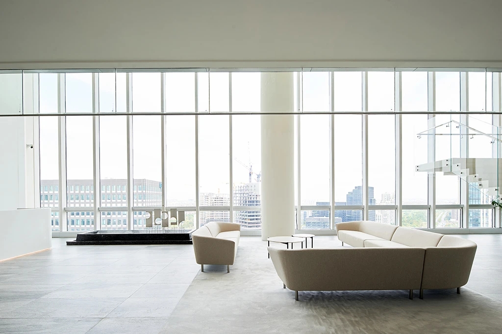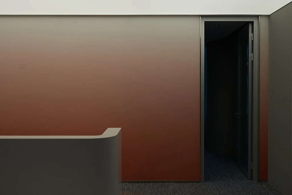 22楼的空中大堂为进入高层职能办公区主要入口,并新增了楼梯连接23楼顶层,在大堂入口处迎接访客的是取代常规LOGO的水景,由水景将人引向窗外景色。