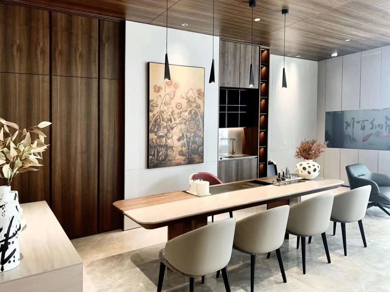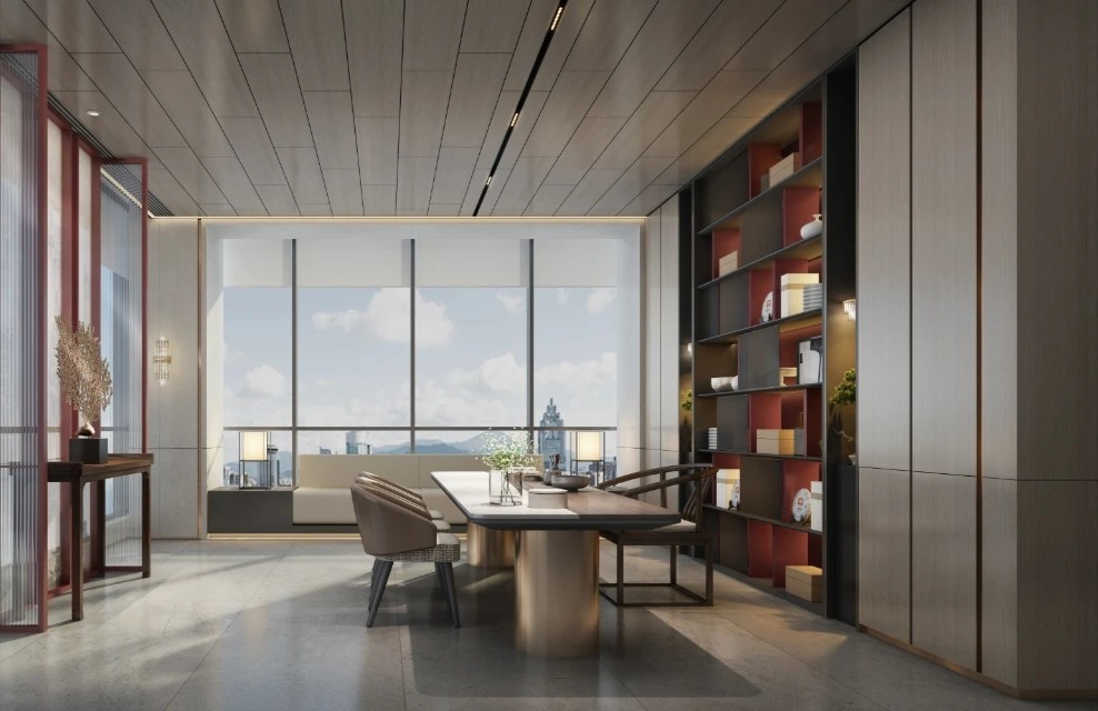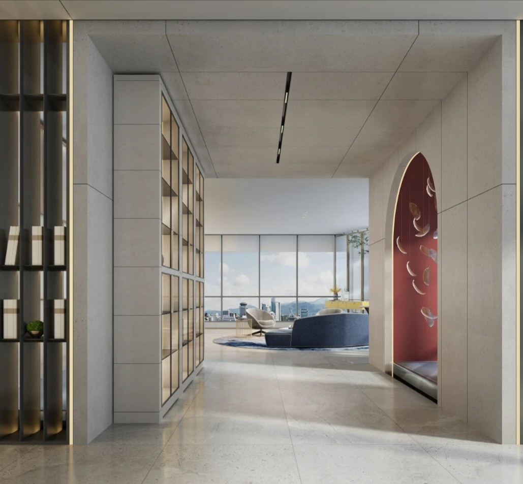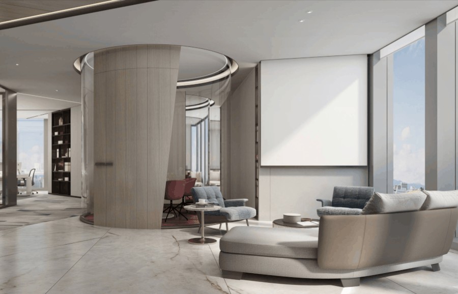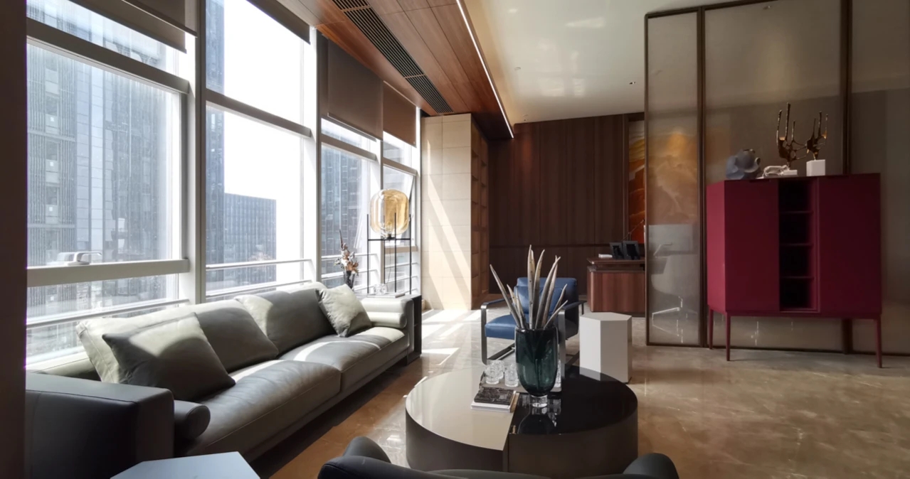 接待区追溯中式哲学精髓的家具,与意大利皇室品牌Poltrona Frau蕴含的尊贵气质,在工艺、材料及配色的交感和应之中迭代韵律,绽放美学新生。秉承「少即是多」的设计哲学,东方传统的审美意境与面向未来的时尚语汇在此得以有机结合,于空中描摹一处超卓社区,触发专注与平衡的归属感。