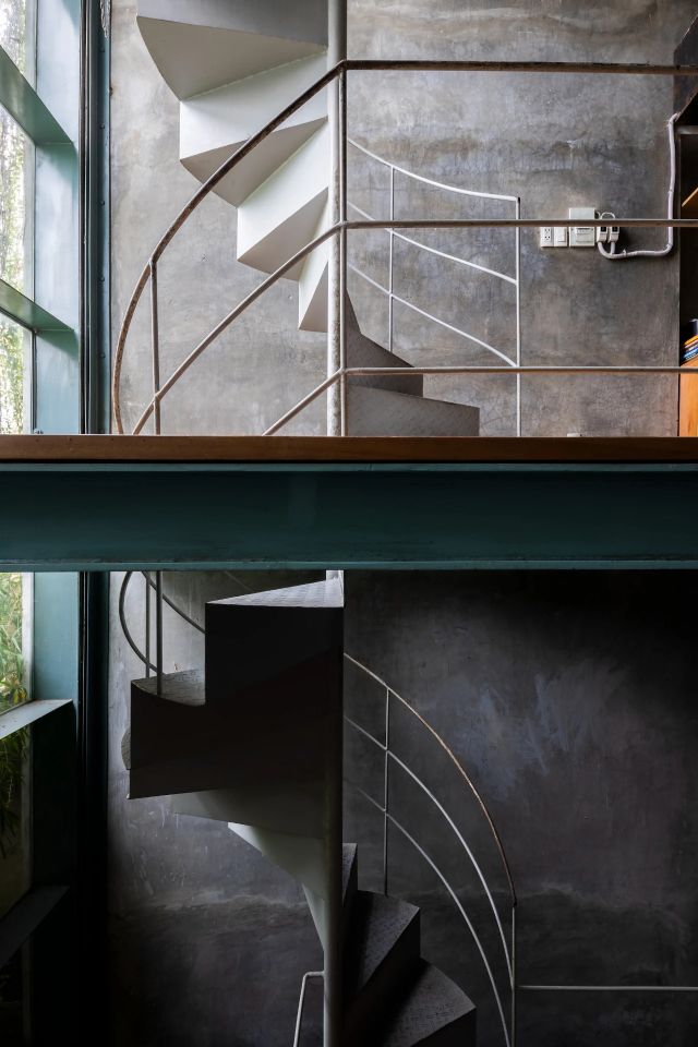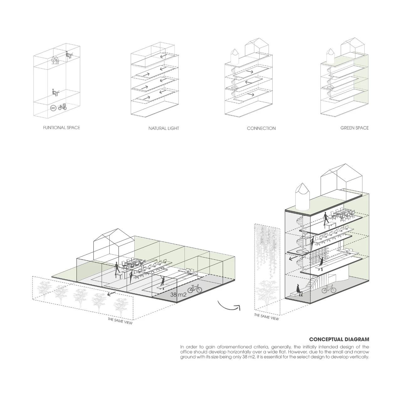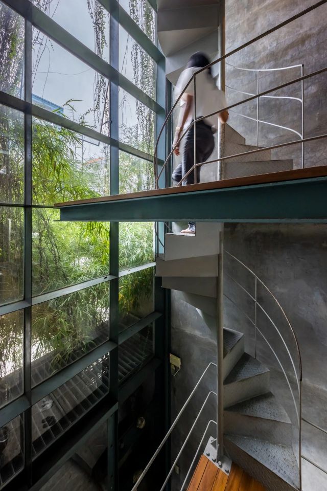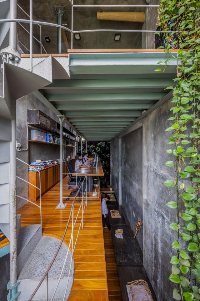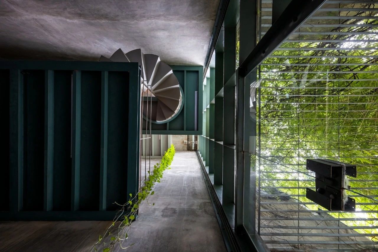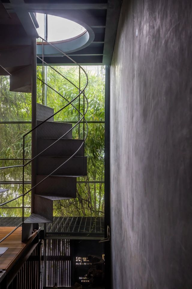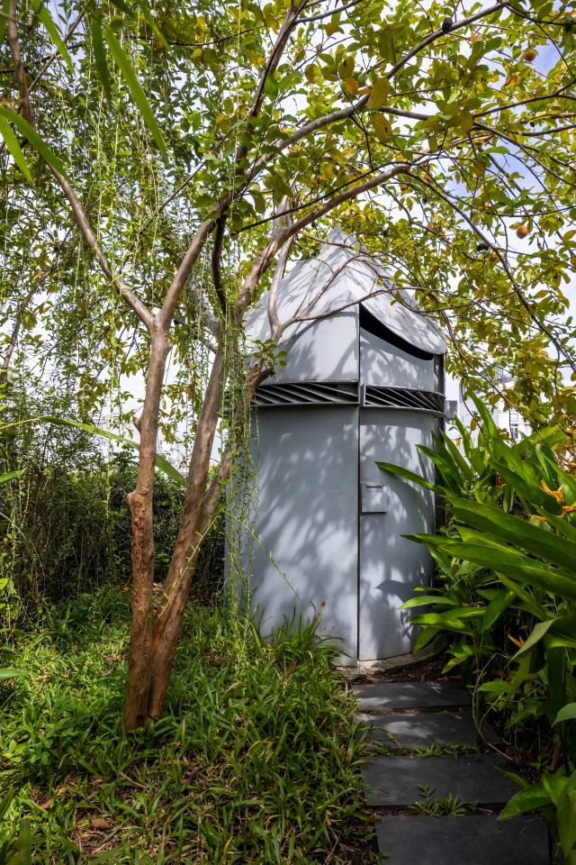 办公室立面的二层至四层都有相似的景观,可以俯瞰被各种植物覆盖的玻璃幕墙系统。建筑和窗户前的绿植代表了一种“常规隔断”,模糊了内外的界限,不仅为工作空间创造了私密性,还确保了自然光与舒适的绿色景观。建筑后方有一个从较高楼层一直延伸到底层的垂直悬浮花园作为保护,就像建筑呼吸的肺部。屋顶花园有一个多样化的生态系统,设有小鱼池和一些当地的树种,让来到这里的人们逃离城市喧嚣和闷热空气。工作空间几乎完全被绿植、自然光和新鲜空气所包围。