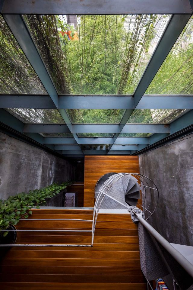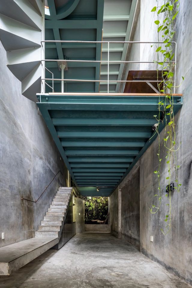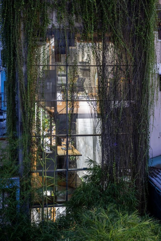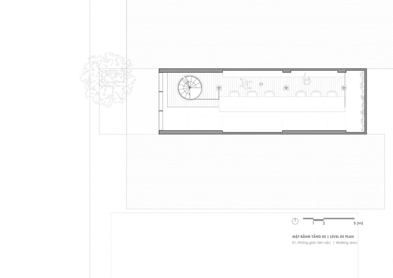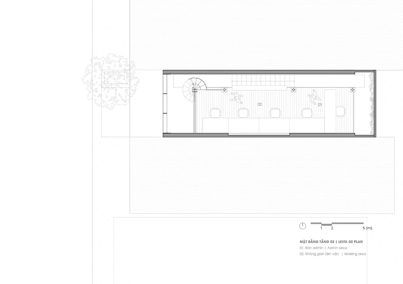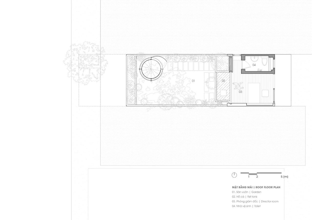 办公室立面的二层至四层都有相似的景观,可以俯瞰被各种植物覆盖的玻璃幕墙系统。建筑和窗户前的绿植代表了一种“常规隔断”,模糊了内外的界限,不仅为工作空间创造了私密性,还确保了自然光与舒适的绿色景观。建筑后方有一个从较高楼层一直延伸到底层的垂直悬浮花园作为保护,就像建筑呼吸的肺部。屋顶花园有一个多样化的生态系统,设有小鱼池和一些当地的树种,让来到这里的人们逃离城市喧嚣和闷热空气。工作空间几乎完全被绿植、自然光和新鲜空气所包围。
