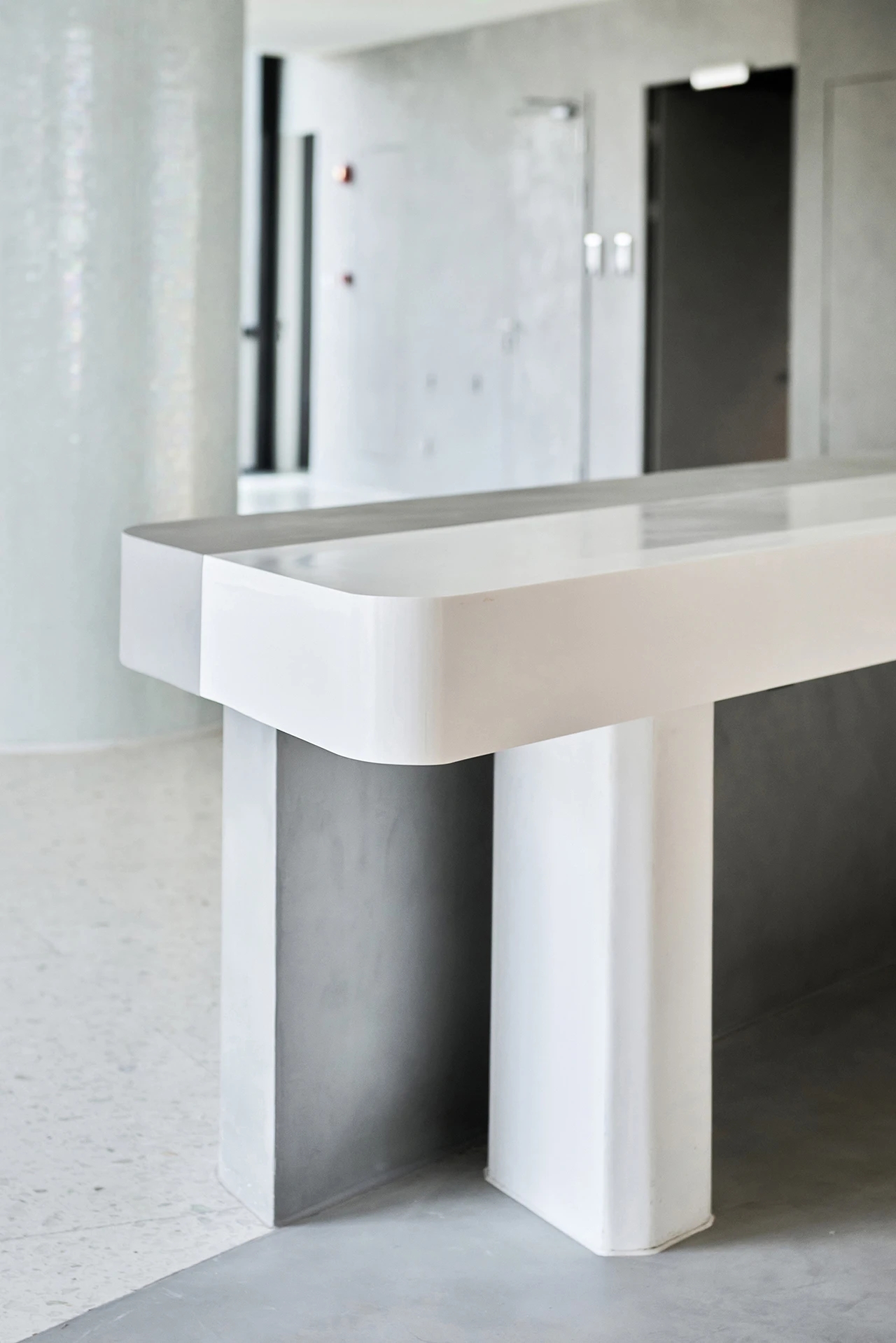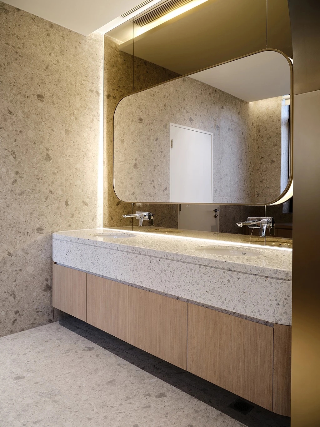 材质选择上,整体以灰与白等中性色为基调进行搭配,包括水磨石、微水泥、金属、玻璃砖、弧形玻璃、木纹防火板、毛毡及人造石等,通过软包、毛毡及家具的材质及色彩去中和整体空间的冷色基调。