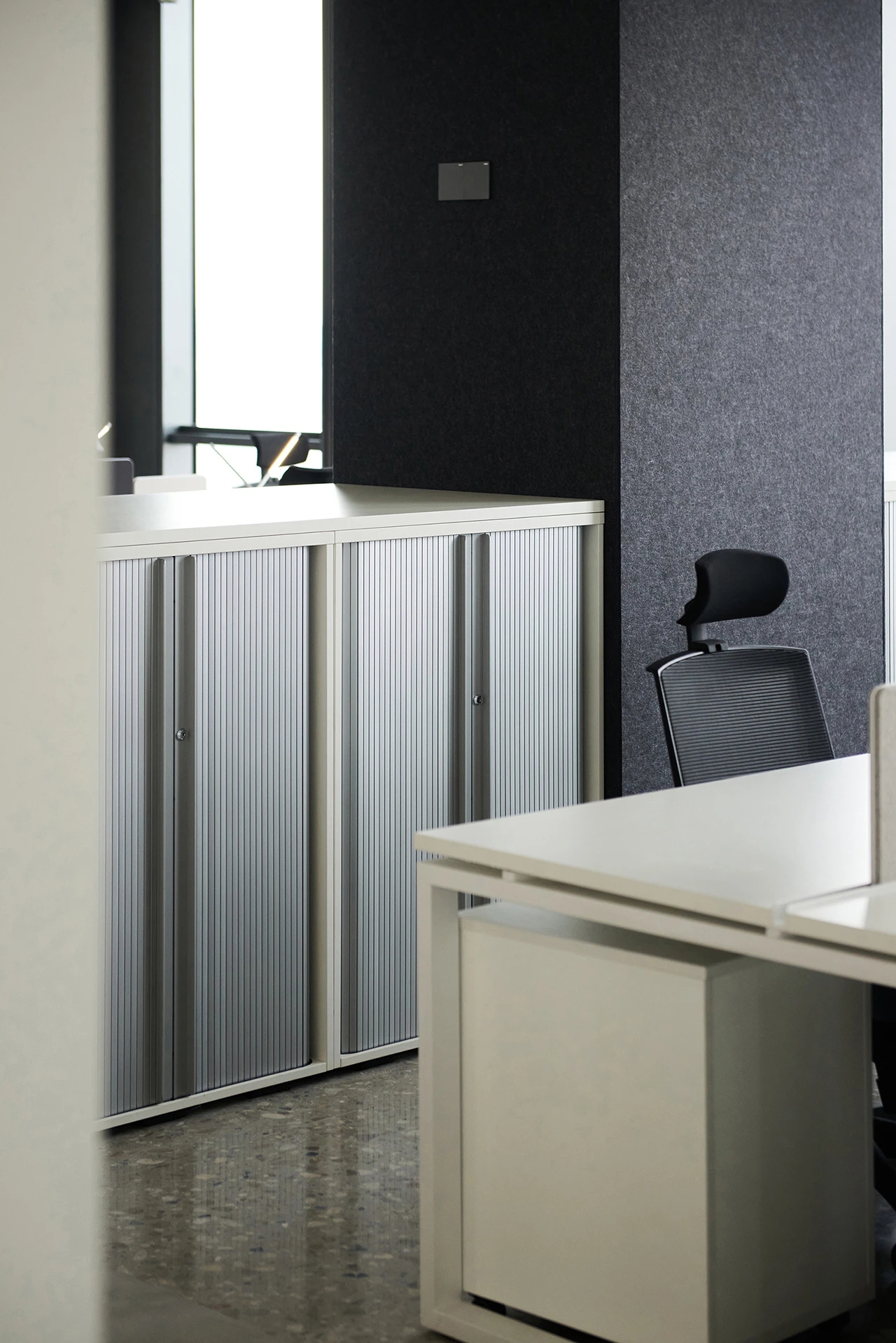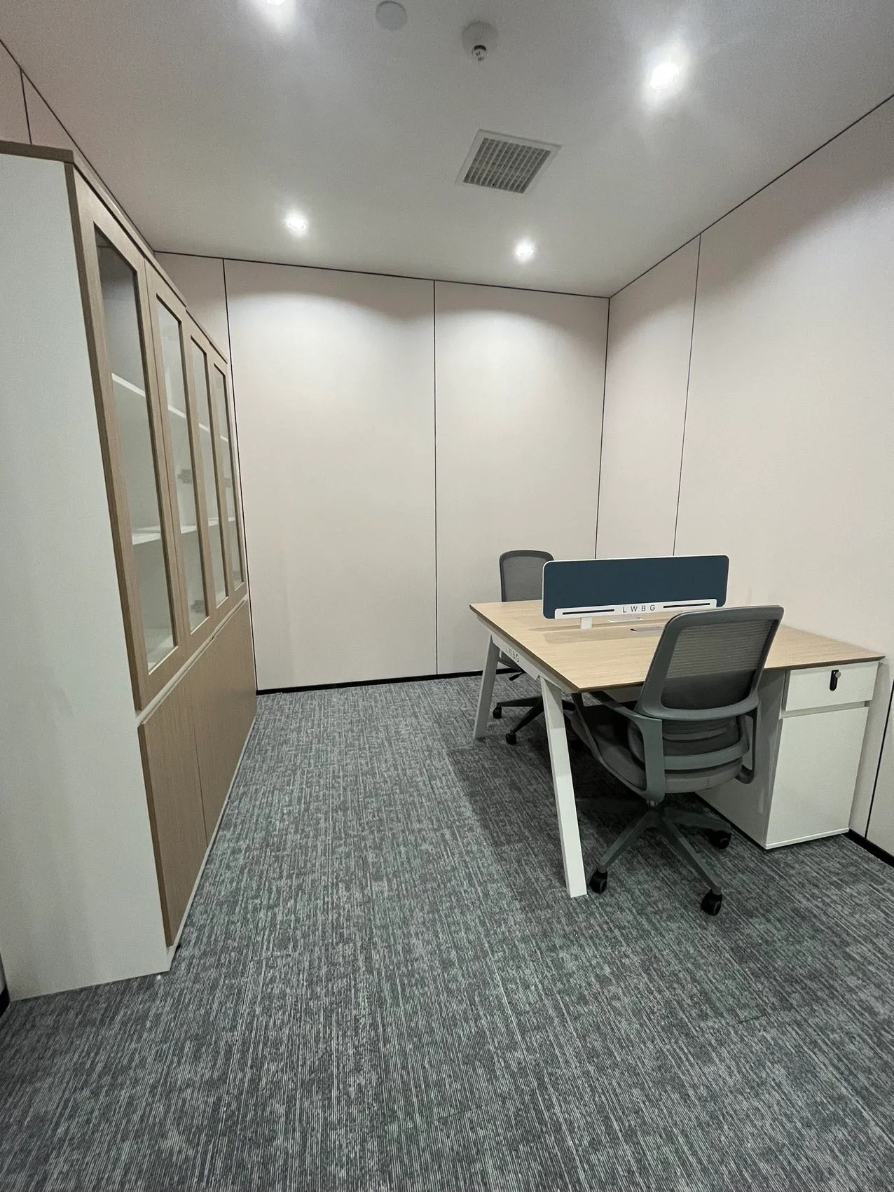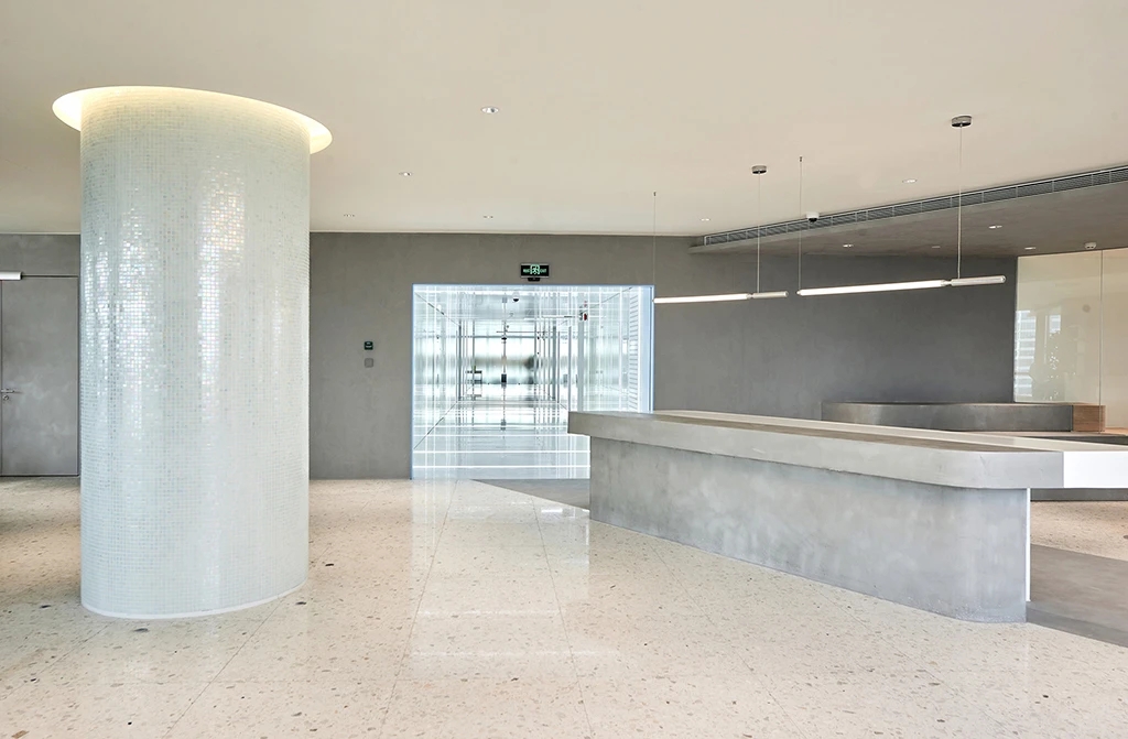 开放办公区地面以过道的微水泥,将两侧的灰色及白色水磨石地砖进行空间区分,电话间以软包进行墙面处理,除了隔音作用外,也能让较小的电话间空间增添舒适感。