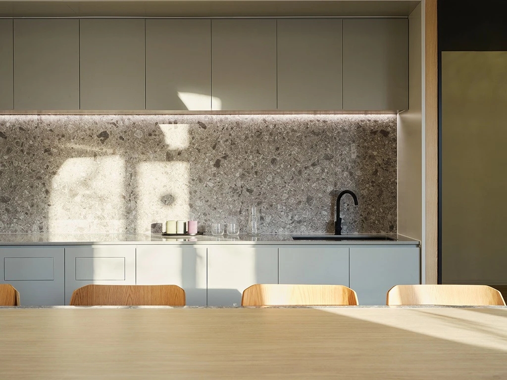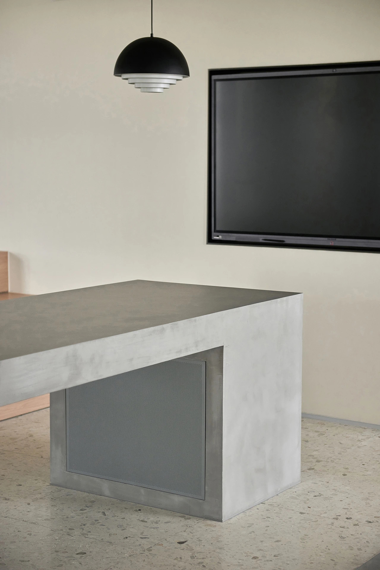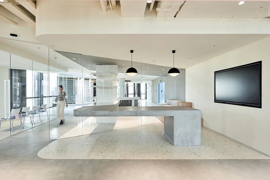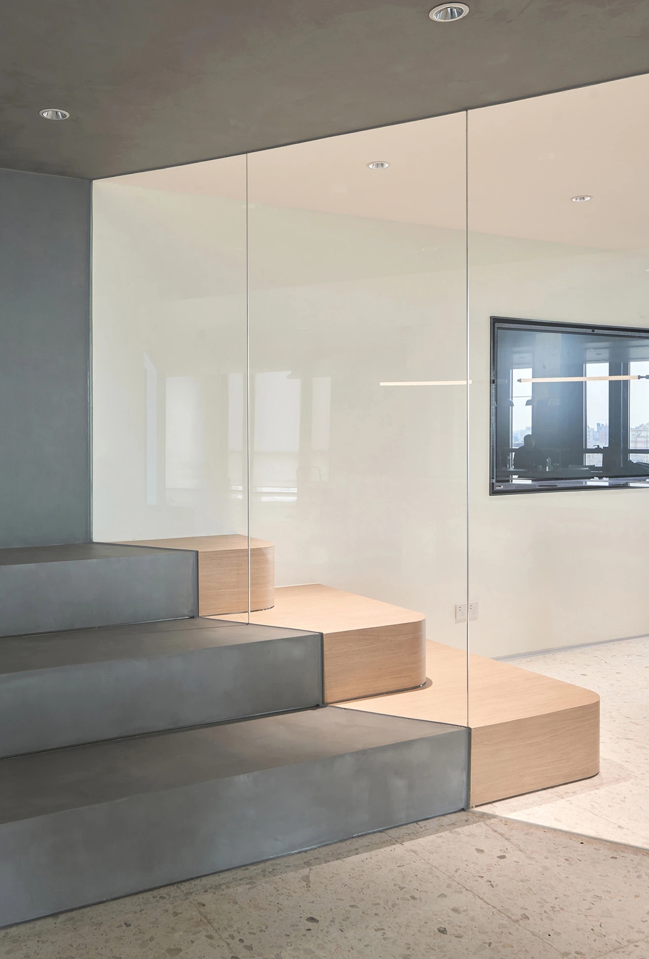 入口左侧设计为阶梯洽谈区,靠墙处设计了三层台阶,可同时作为展示陈列区与洽谈座位区。此区的L型吧台与办公区域茶水区吧台相连,洽谈区吧台在穿越玻璃隔断的同时,材质由水磨石转变为微水泥,阶梯区则由微水泥转变为木纹防火板,藉此强化了玻璃隔断作为动与静区间的介质作用。