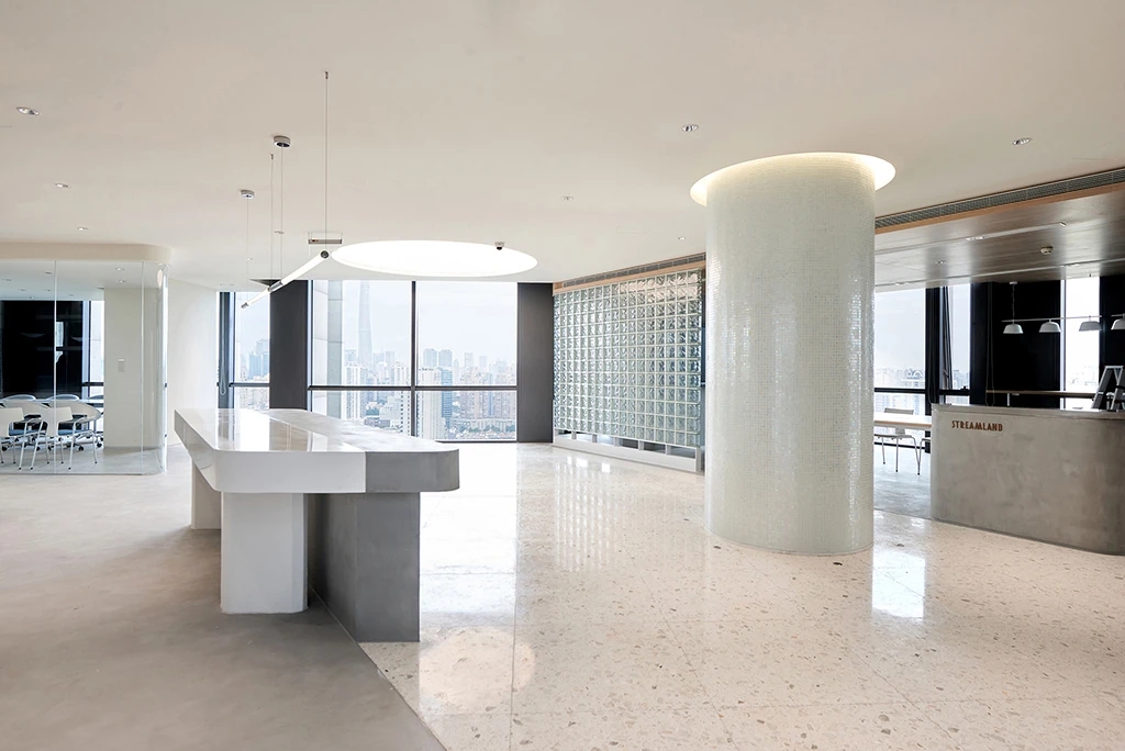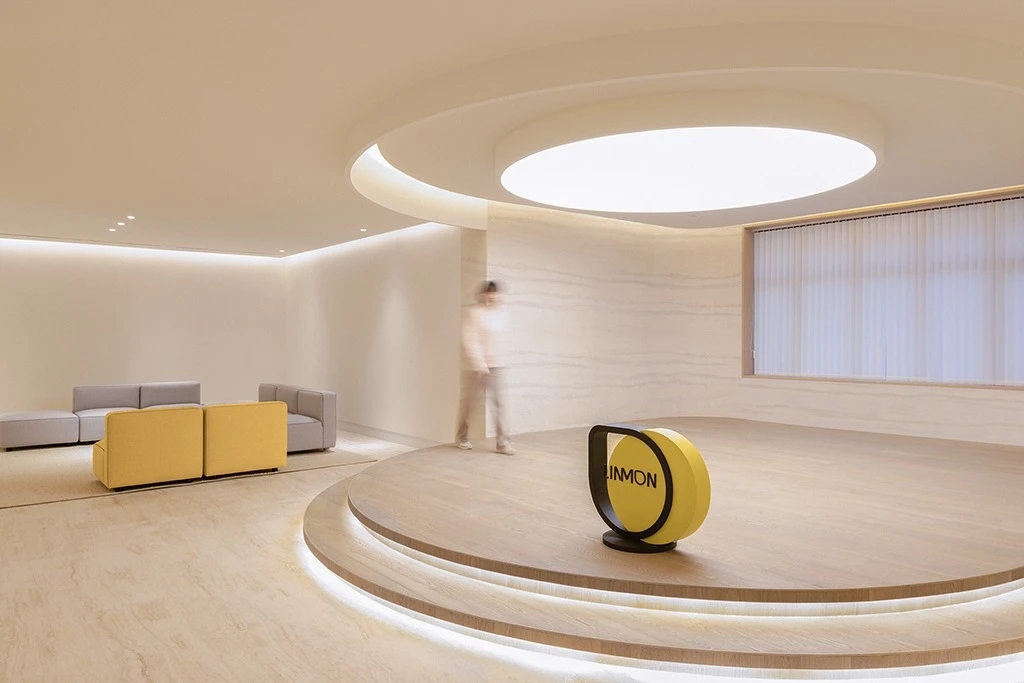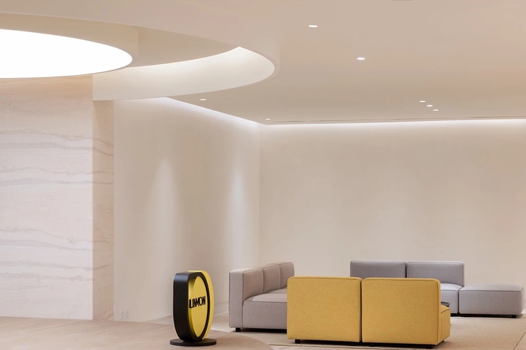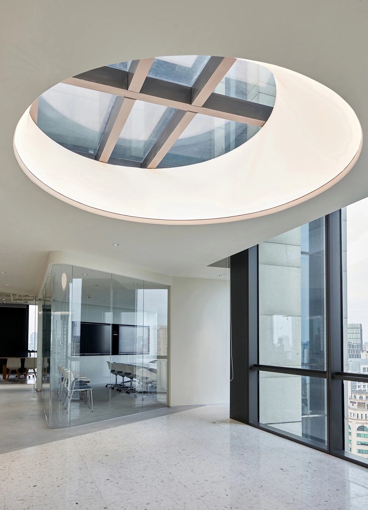 此项目位于办公楼的顶层,在采光上有较好的先天条件,除了大面积的落地幕墙采光窗,在开放接待休闲区还有一个大面积的长方型天窗。我们在天窗下方的吊顶进行了再设计,以斜圆柱体的造型重新改造了天窗,并在圆柱侧面增加了软膜,在入口处强化形式感体验,在夜晚时软膜能赋与空间如天光的照明感受。