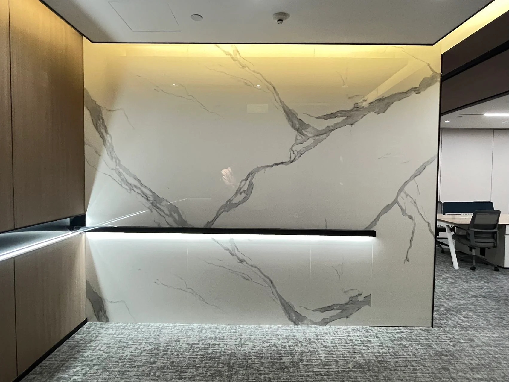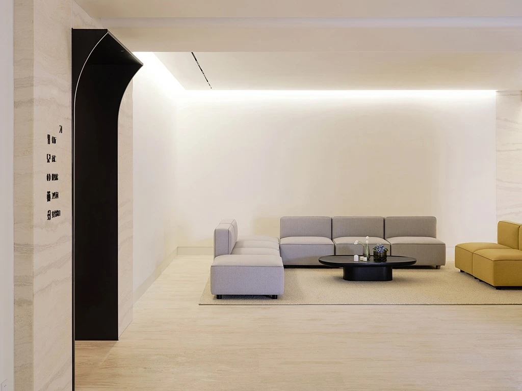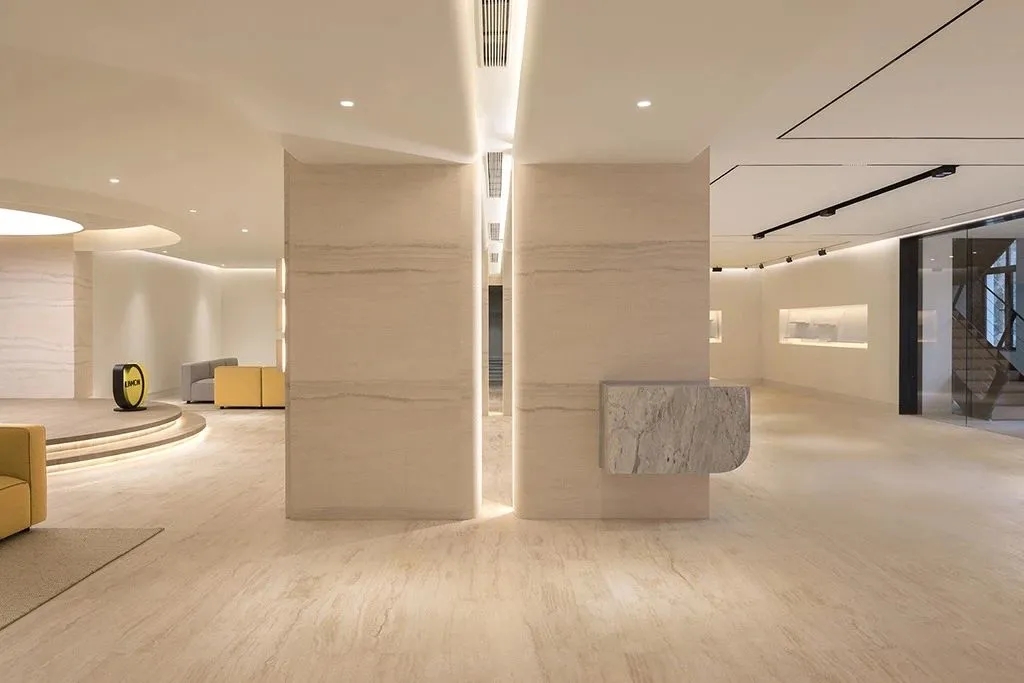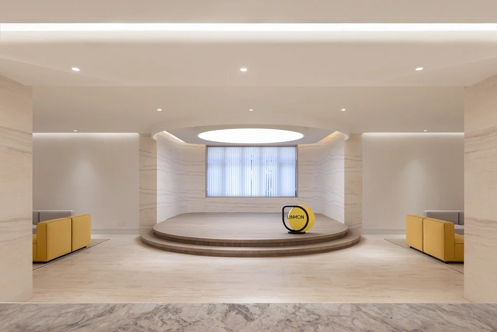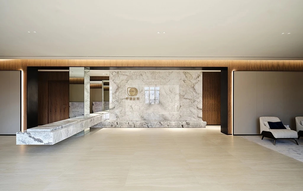 300平米接待区为未来的公司形象展示保留空白的同时,利用了天花与墙面点缀的弧形造型与灯光搭配,丰富了接待区的层次感。在接待区横向天花中线上,利用了对称的圆角造型与灯带分割了空间的视觉关系与功能性,前区主要作为展示区,后区则为等候区与拍照区。天花灯带与石材墙面在造型上也做了联系,一方面增加了南北横向的通透感,另一方面墙面的切割也让光产生了实体感。